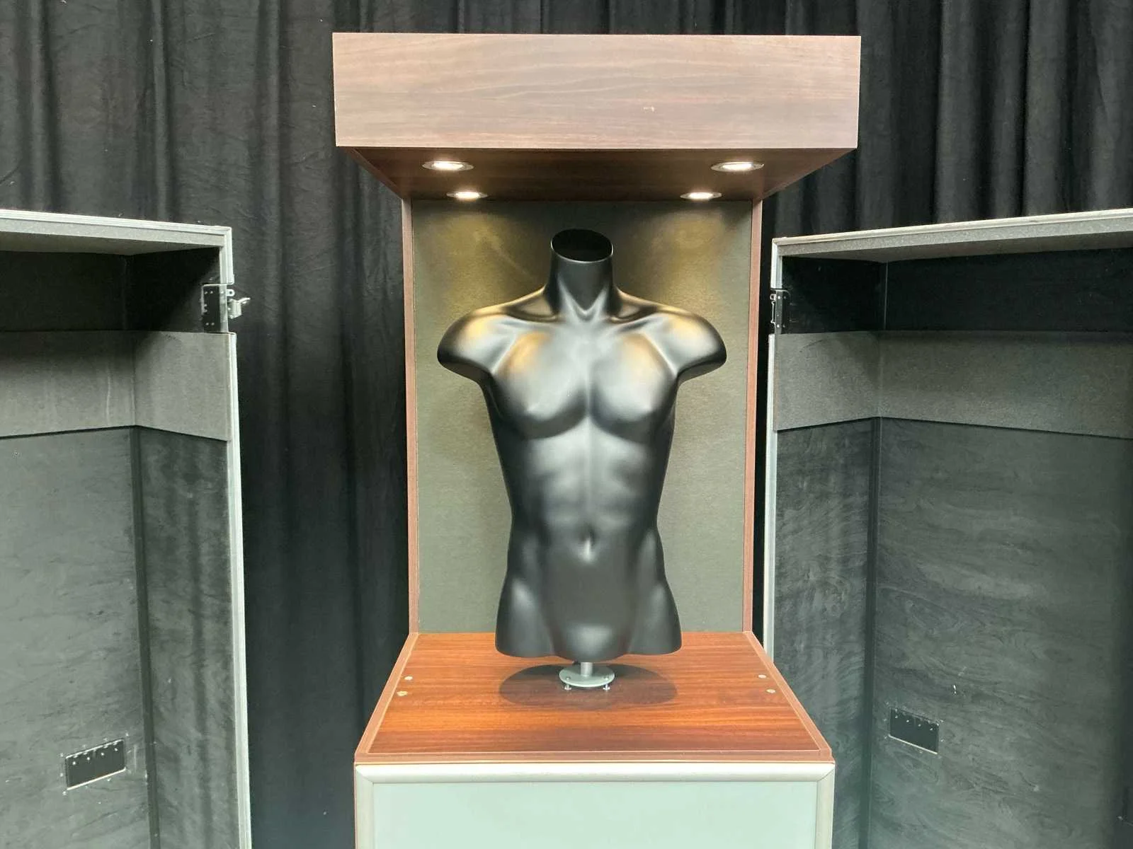 Paspop met kastinrichting. Het lot bevat ook de flightcase voor het vervoeren van de paspop. Nee Kleur: Bruin Heren: true
