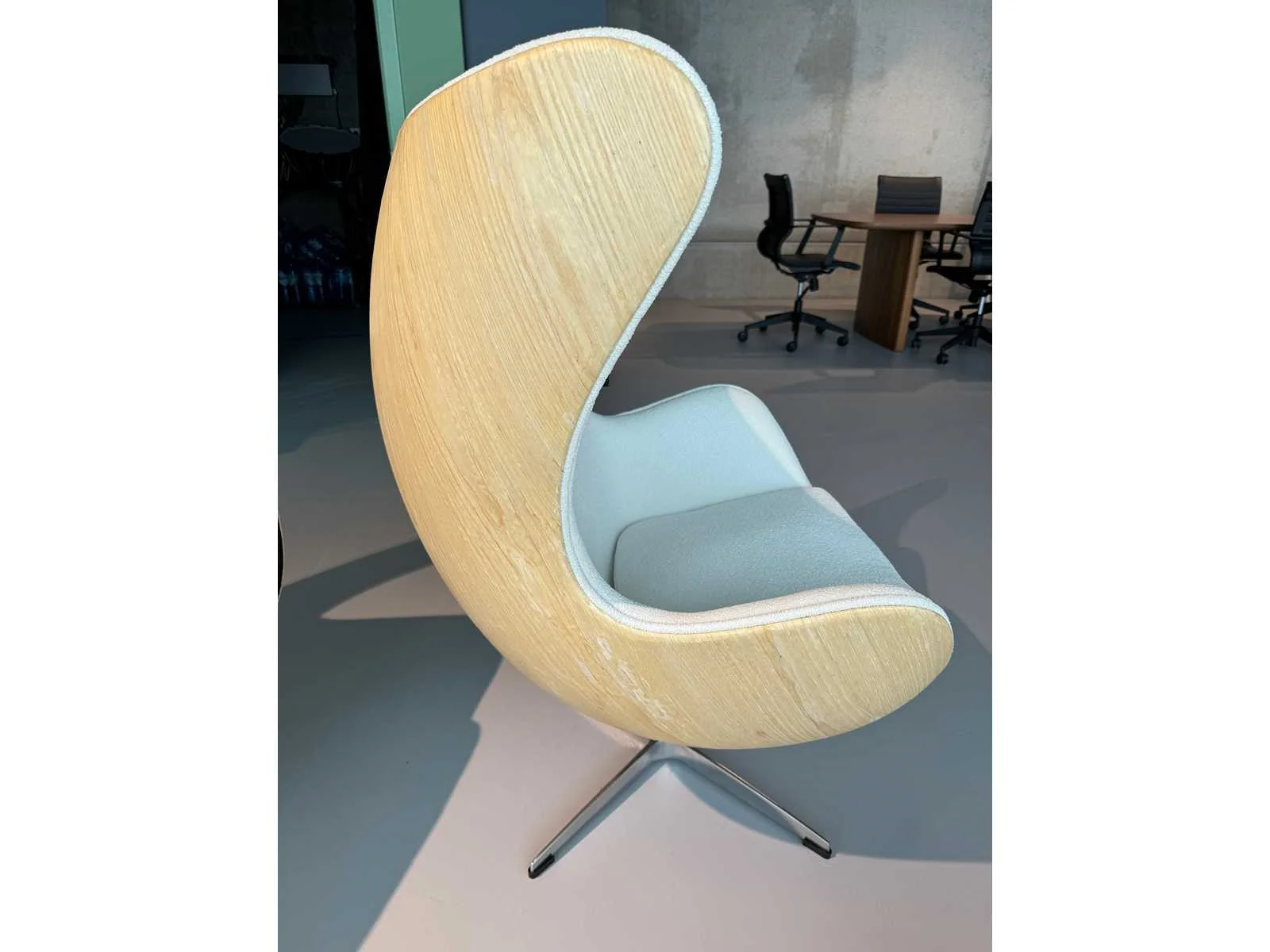 Egg Chair natuur eik frame, vintage look, kruispoot, draaibaar onderstel, draai en kantelbaar, ongebruikt No Model: Egg Product type: fauteuil Kleur: wit Breedte: 80cm Hoogte: 110cm Zithoogte: 45cm Materiaal: houtfineer en kasjmier