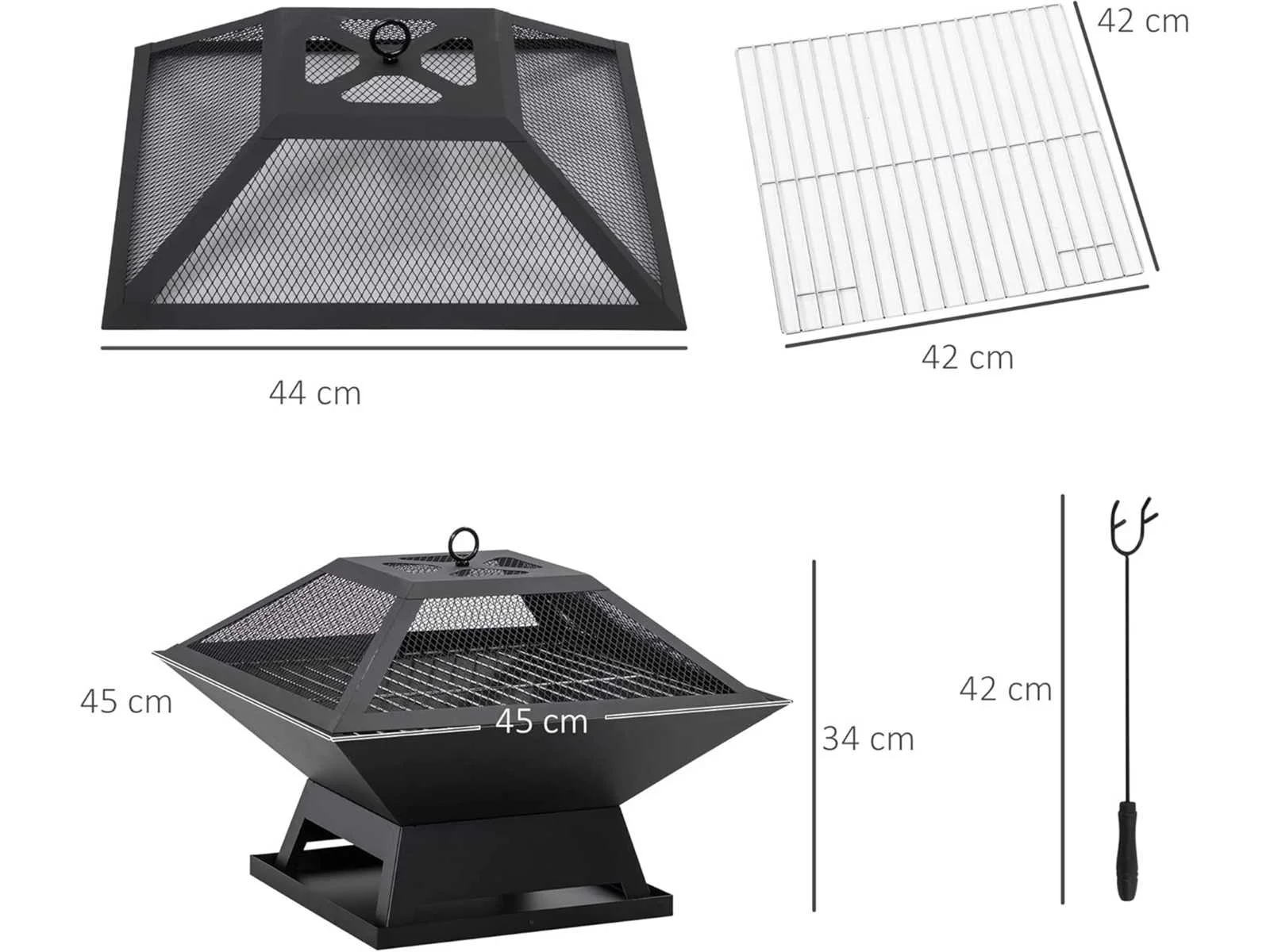2-in-1 ontwerp: kan worden gebruikt voor verwarmen of grillen Compact en draagbaar, geschikt voor kamperen, picknicks, enz Plaats tijdens het barbecueën het grillrooster en giet houtskool in de put Gemaakt van staal met hittebestendige verf Roosterdeksel zorgt voor brandbeveiliging en voorkomt dat vonken wegvliegen Met de meegeleverde pook verplaats je het brandbare materiaal veilig Gezondheid BBQ net beschikbaar Montage vereist Materiaal: Staal Kleur: Zwart Totale afmetingen: 45L x 45B x 34H cm Afmetingen van de vuurpot: 45L x 45B x 12H cm Afmetingen van de gaasafdekking 44L x 44B x 11H cm Afmetingen pook: 42L x 4B cm Non