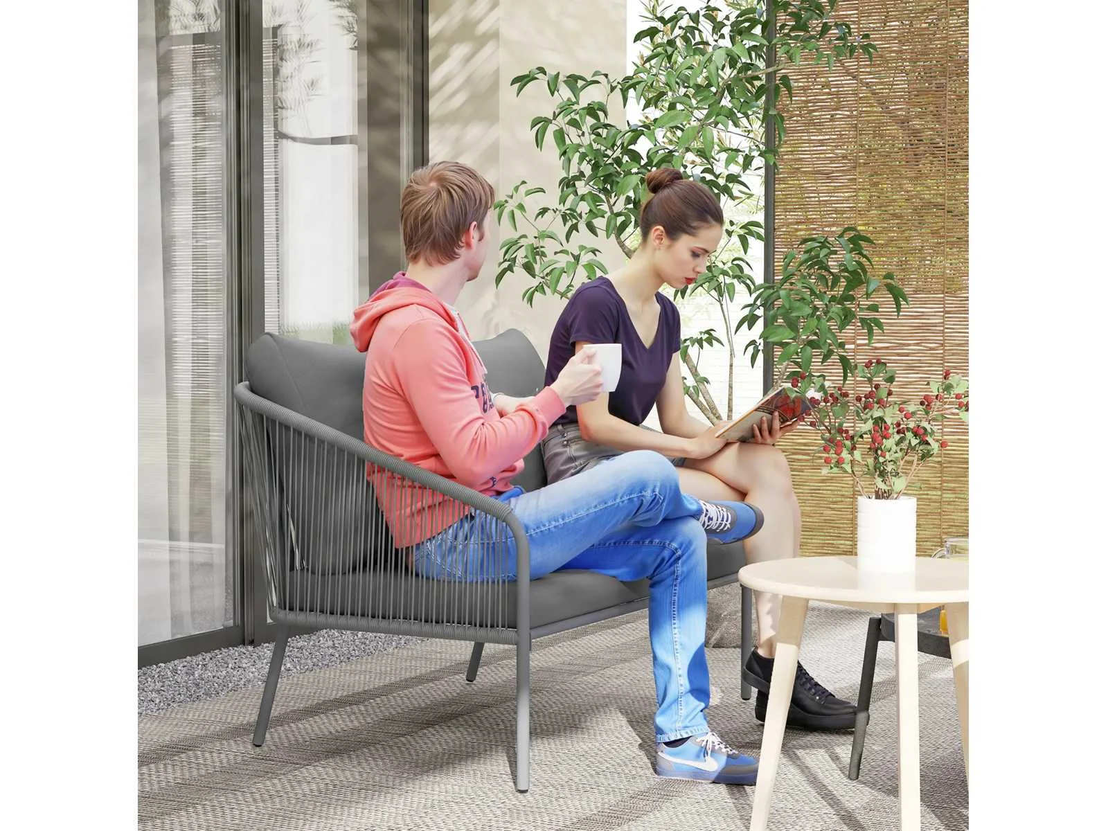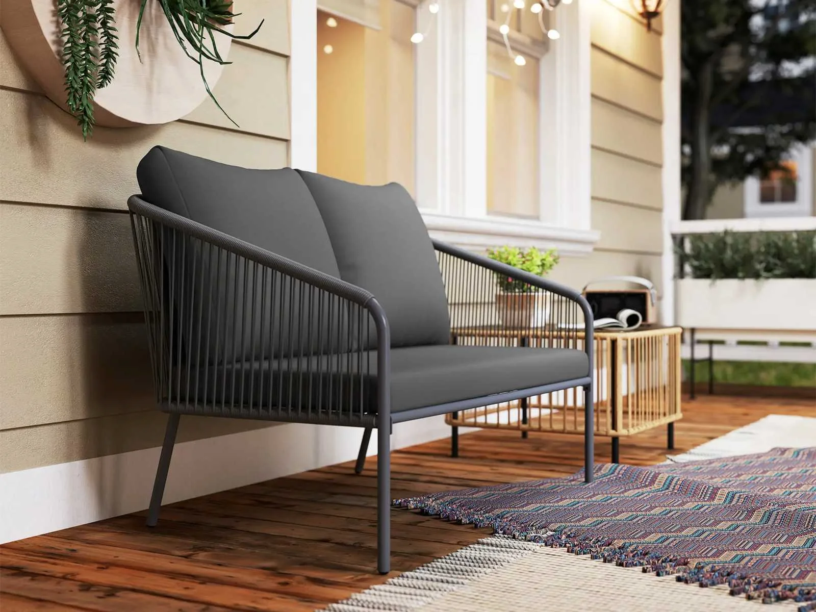 Specificaties: - Kleur: Grijs - Materialen: staal, PE-rattan, polyester, schuim - Totale afmetingen: 112L x 72B x 76H cm - Afmetingen zitting: 106B x 58D x 35H cm - Afmetingen rugleuning: 104B x 45B x 43H cm - Afmetingen zitkussen: 106L x 58B x 8D centimeter - Afmetingen rugkussen: 55L x 50B x 12D cm - Draagvermogen: 240 kg - Waterbestendig: spatwaterdicht - UV-bescherming: Voldoet aan de Europese norm niveau 4 - UV-bestendigheid van rotan: 2000 uur Non