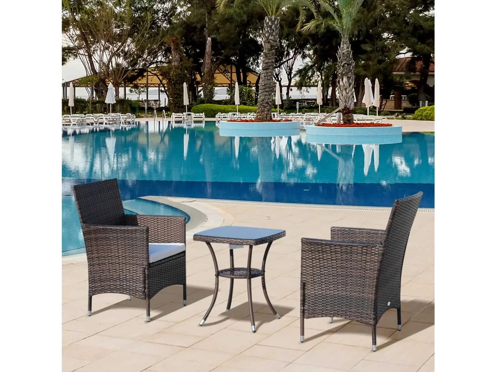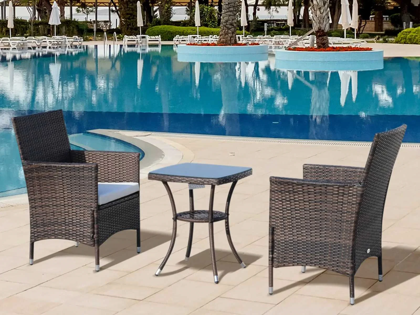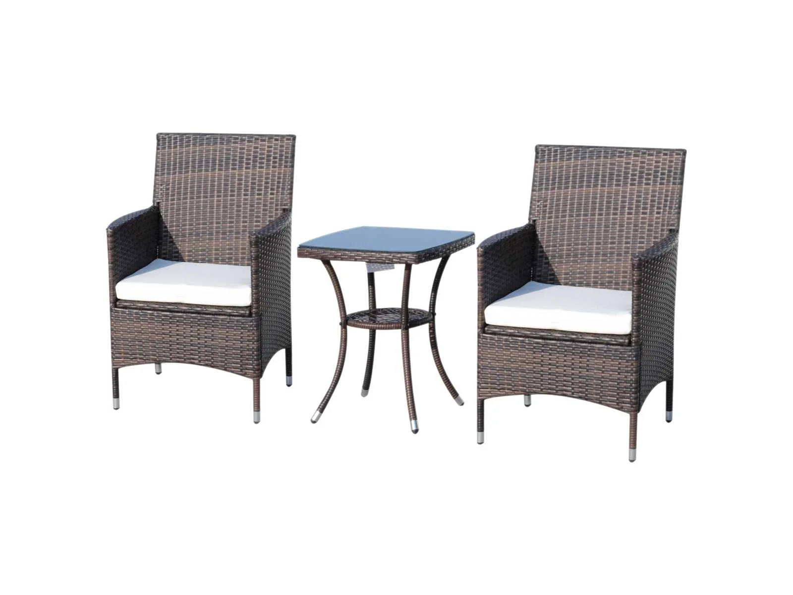 - 3-delige set met twee stoelen en een tafel voor binnen en buiten - Stevig metalen frame met RVS poten - Weerbestendig plastic in rotanstijl - Eenvoudige reiniging en onderhoud - Met 2 comfortabele kussens - Wasbare kussenhoezen met ritssluiting - Tafelblad van gehard glas - Eenvoudige montage Specificaties: - Materiaal: metaal, PE-rattan, polyester, schuim, gehard glas - Afmetingen stoel: B60 x D58,5 x H89,5 cm - Afmetingen tafel: B48 x D48 x H60 cm - Maximaal ondersteund gewicht: 160 kg (stoel), 50 kg (tafel) - Kleur: Bruin Non