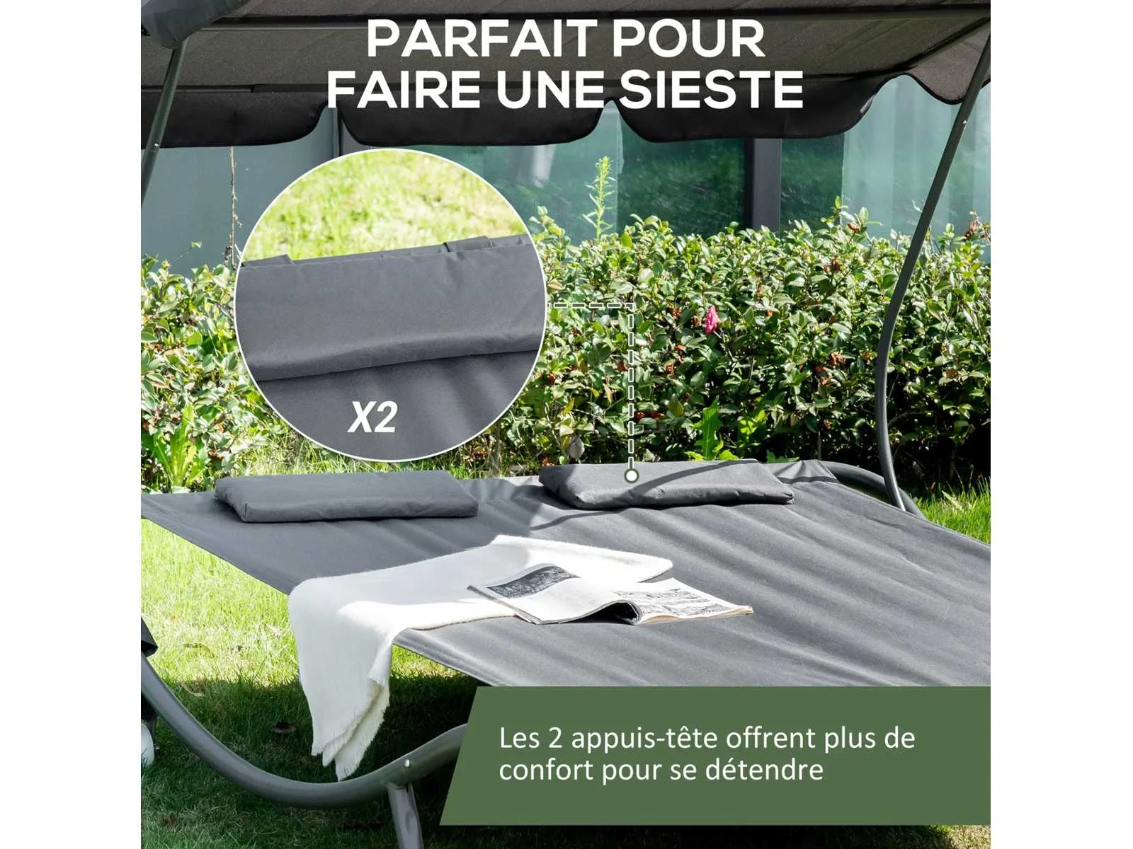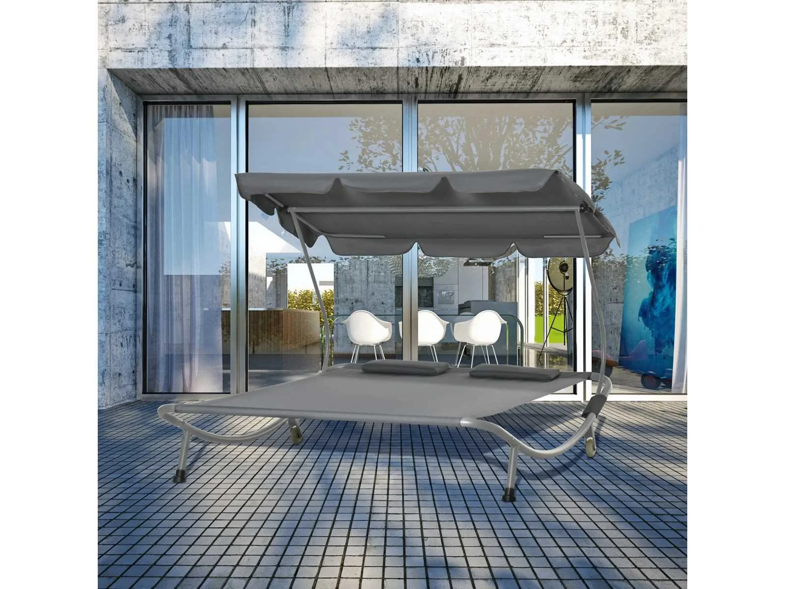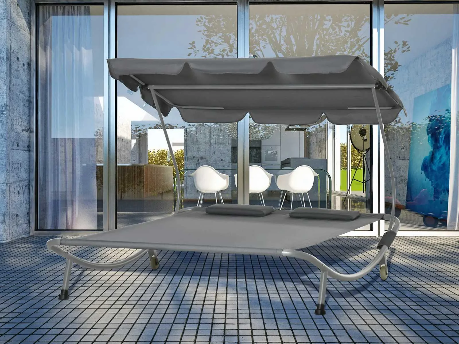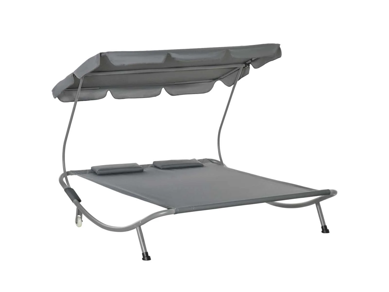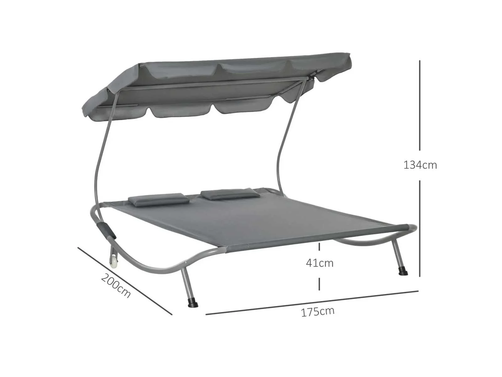 Specificaties: - Kleur: Grijs - Belangrijkste materialen: epoxystaal, Oxford-doek en polyester -Zon. totaal: 2L x 1.75W x 1.34H m -Zon. Afmetingen dak: 1,7 L x 1,10 L m - Hoogte van het ligvlak: 45 cm - Dikte van de kussenvulling: 6 cm - Ø zwenkwielen: 10 cm - Aanbevolen maximale belasting: 220 kg - Levering in een enkel pakket Non