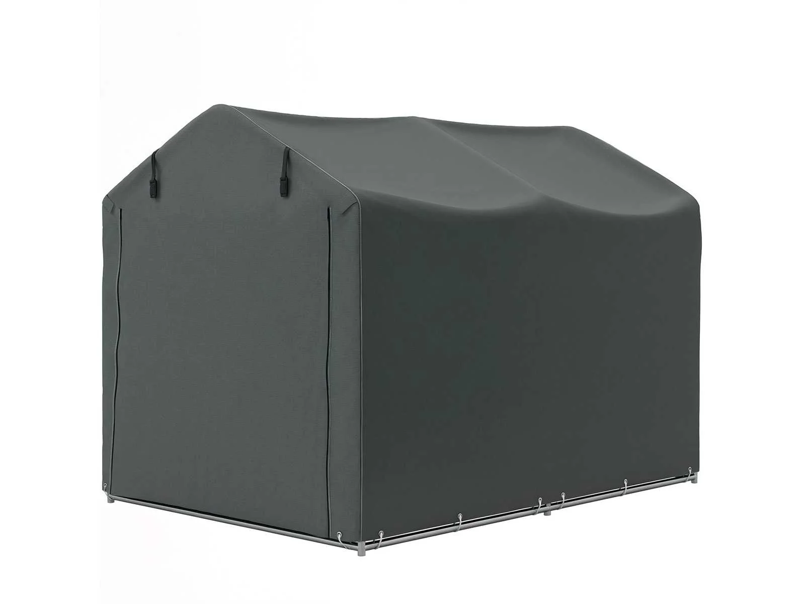 Slaat fietsen, motorfietsen, zwembaduitrusting en meer ruimtelijk op - PE-doek van de tuinopslagtent beschermt tegen water- en UV-schade - De gegalvaniseerde structuur van de motorstalling bestrijdt scheuren, roest en corrosie - Geslepen spijkers en scheerlijnen verbeteren de structurele stabiliteit - Verwijderbare deur met ritssluiting zorgt voor gemakkelijke toegang en goede ventilatie - Montage vereist Specificaties: - Kleur: donkergrijs - Materialen: gegalvaniseerd metaal, PE-stof - Totale afmetingen: 220W x 157D x 165H cm - Hoogte dakrand: 131 cm - Afstand tussen de kolommen: 240 cm - Afmetingen deur: 126b x 135H cm Non