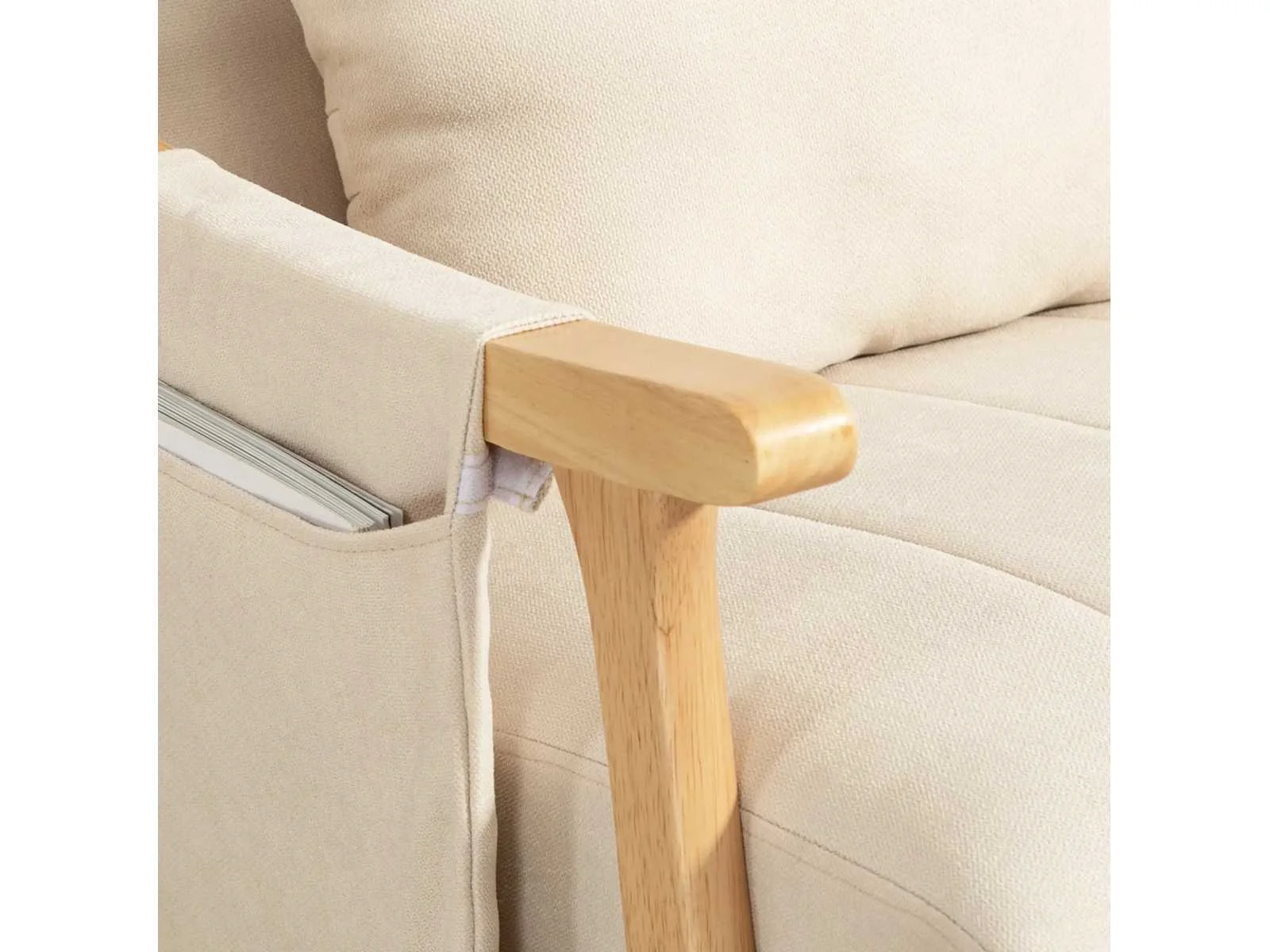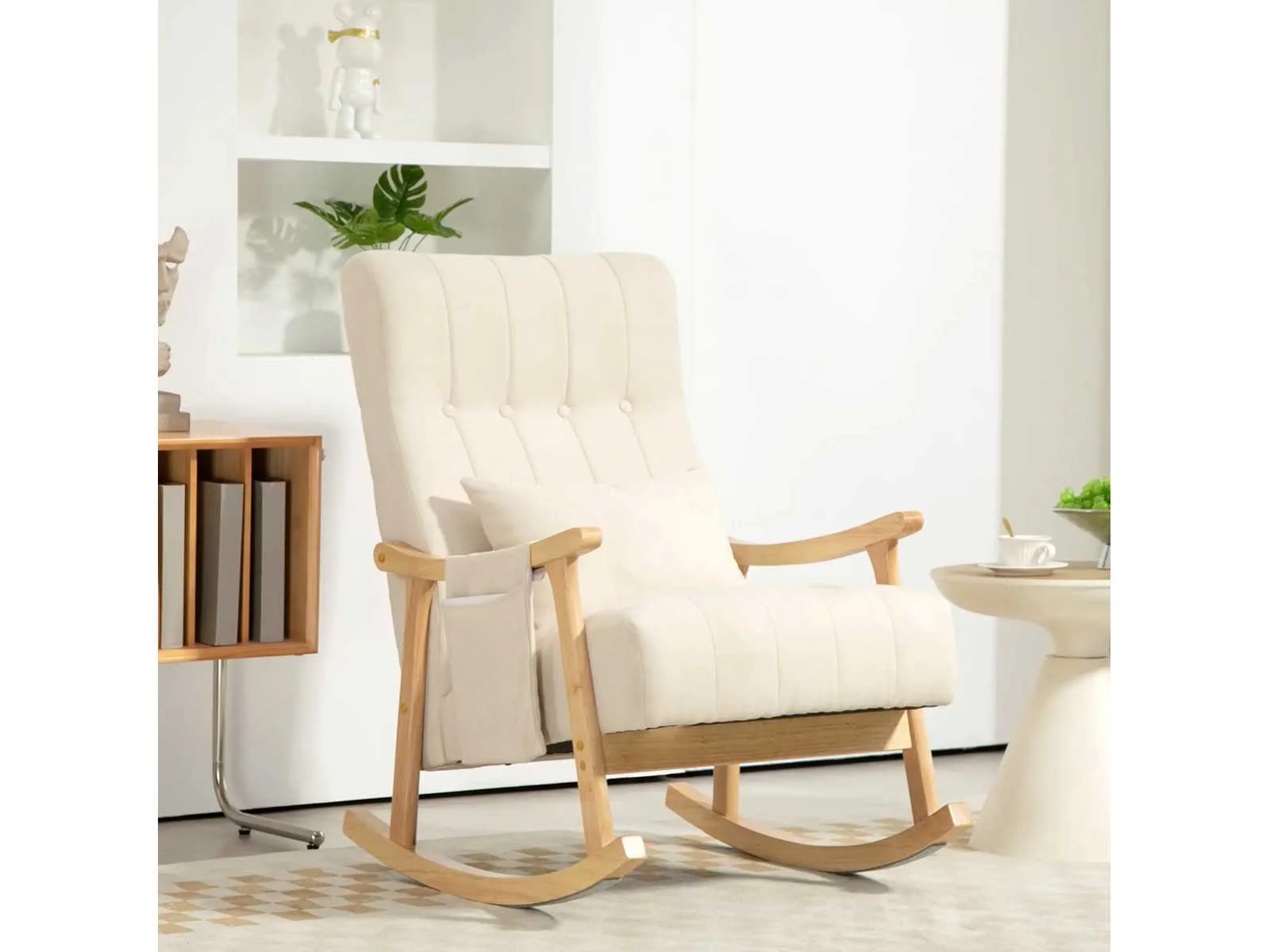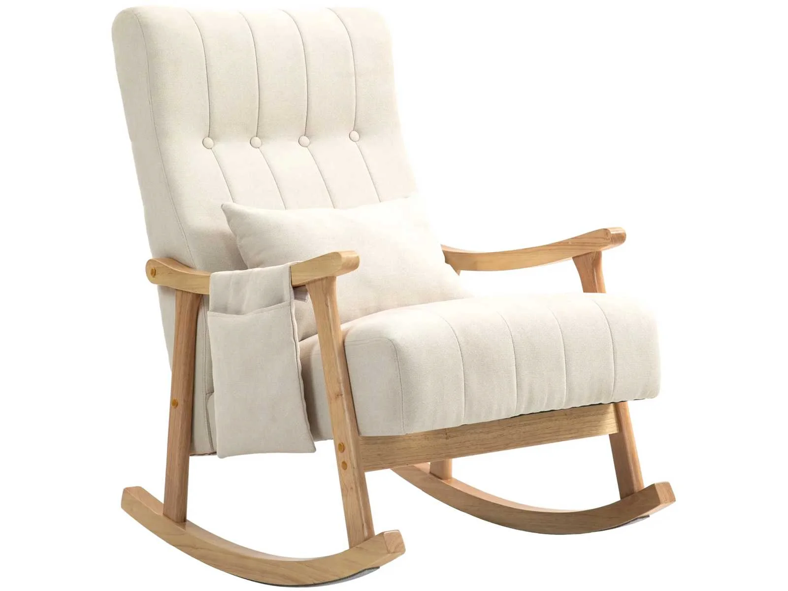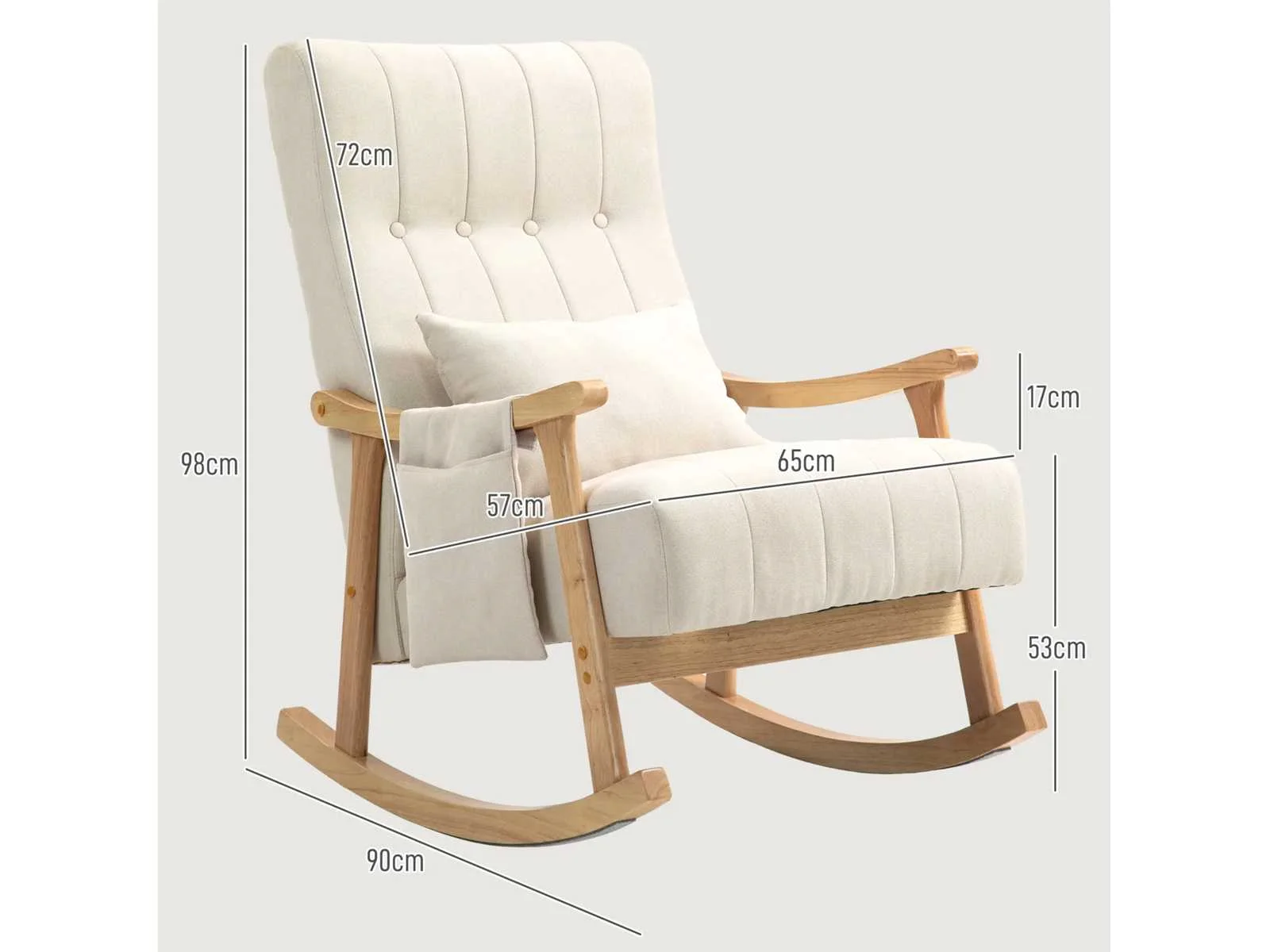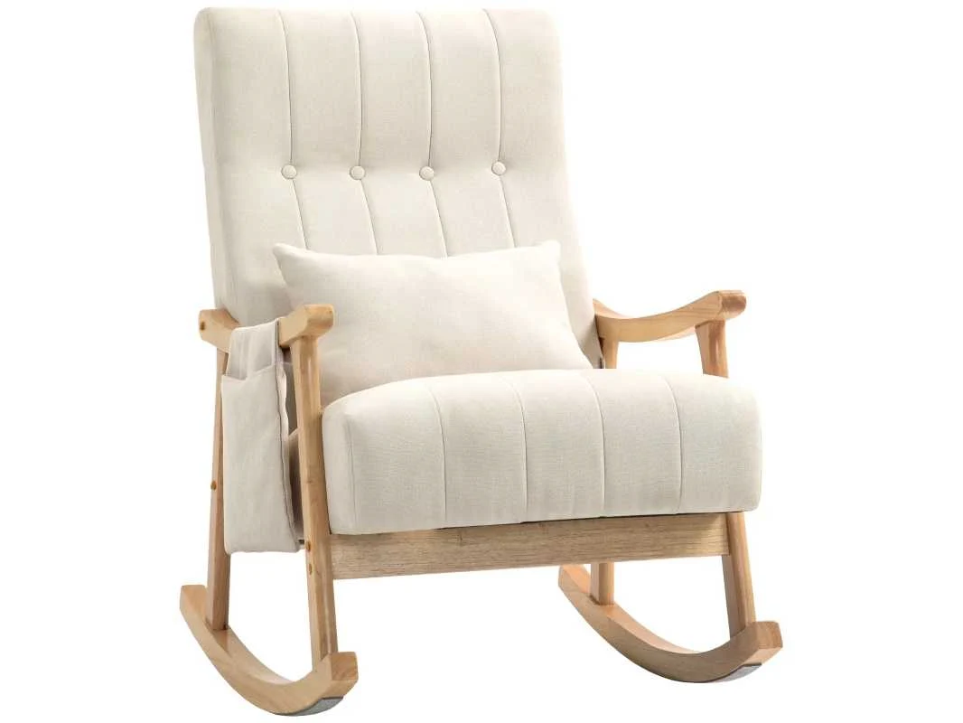 - 60 cm brede zitting voor meer comfort - Linnen canvas bekleding en zachte vulling voor comfortabel zitten - Inclusief lendenkussen voor extra ondersteuning van de rug - Opbergvak voor schommelstoel aan de zijkant voor afstandsbedieningen en smartphone - Stevig beukenhouten schommelstoelframe voor stabiliteit - Vilt glijdt om geluid te minimaliseren Anti-kantelbeveiliging voor meer veiligheid Montage vereist Specificaties: - Kleur: Beige - Materialen: Imitatie linnen (100% polyester), beukenhout, schuim - Totale afmetingen: 65L x 90B x 98H cm - Afmetingen zitting: 60L x 57B x 44/53H cm - Dikte zitting: 15 cm - Afmetingen rugleuning: 72L x 59B x 14H cm - Afmetingen armleuning: 61L x 3,8 cm - Hoogte armleuning: 17 cm - Afmetingen kussen: 48L x 12B x 32H cm - Afmetingen van het opbergvak: 26L x 32H cm - Draagvermogen: 120 kg Non
