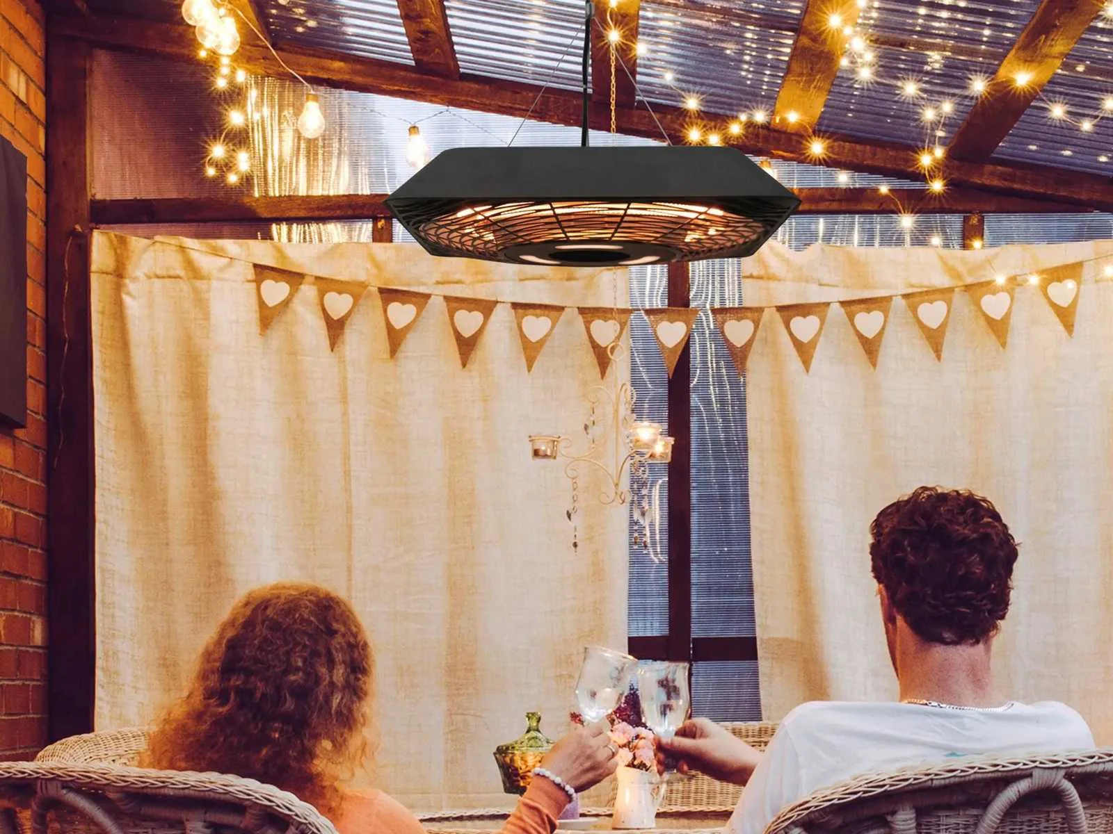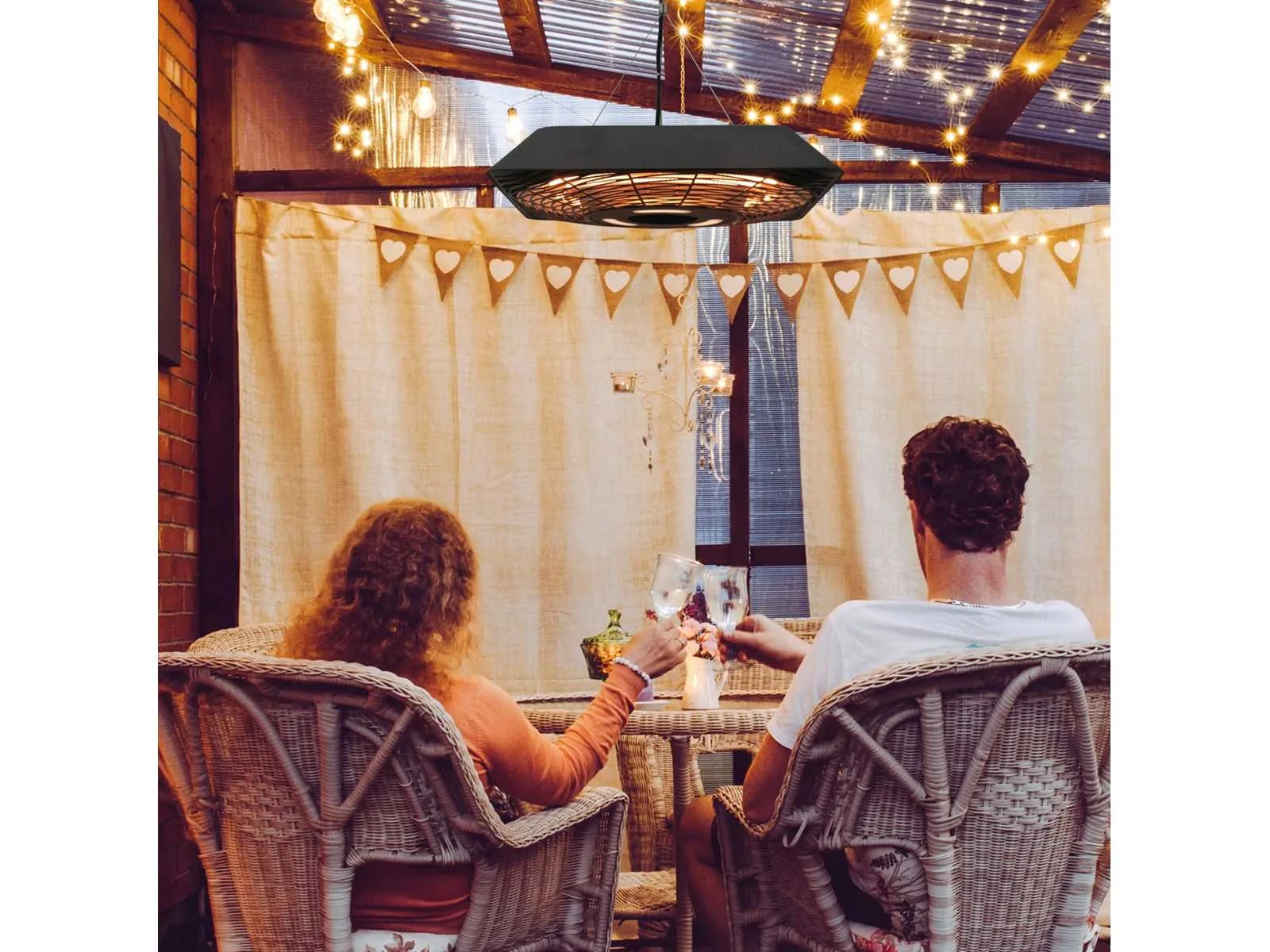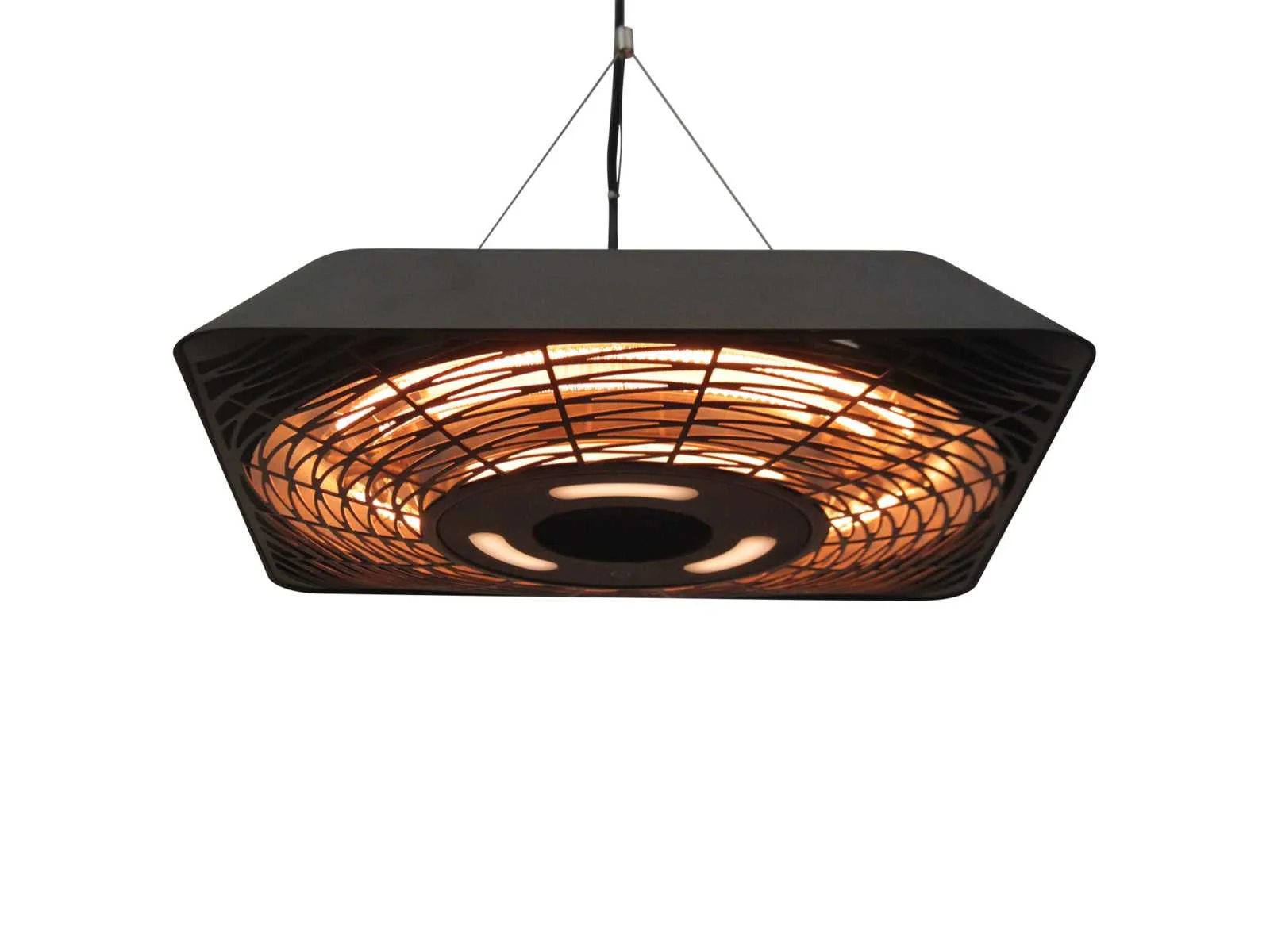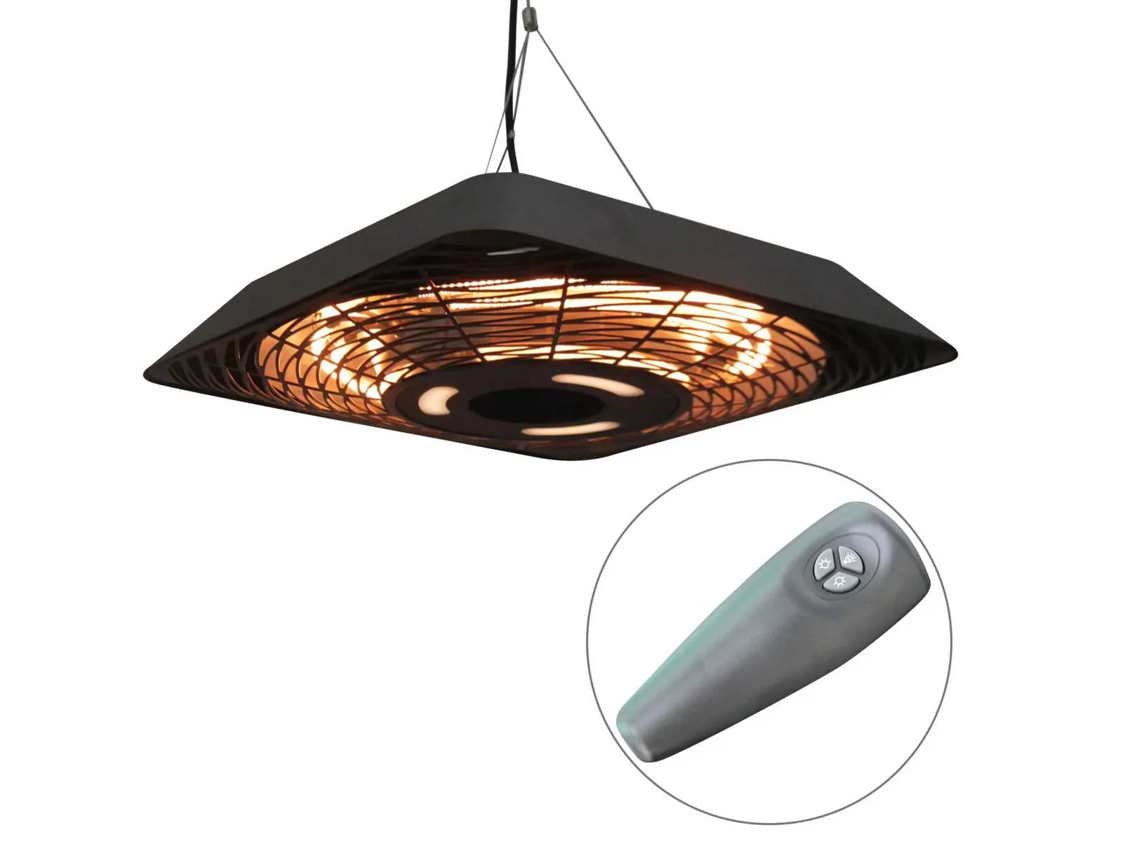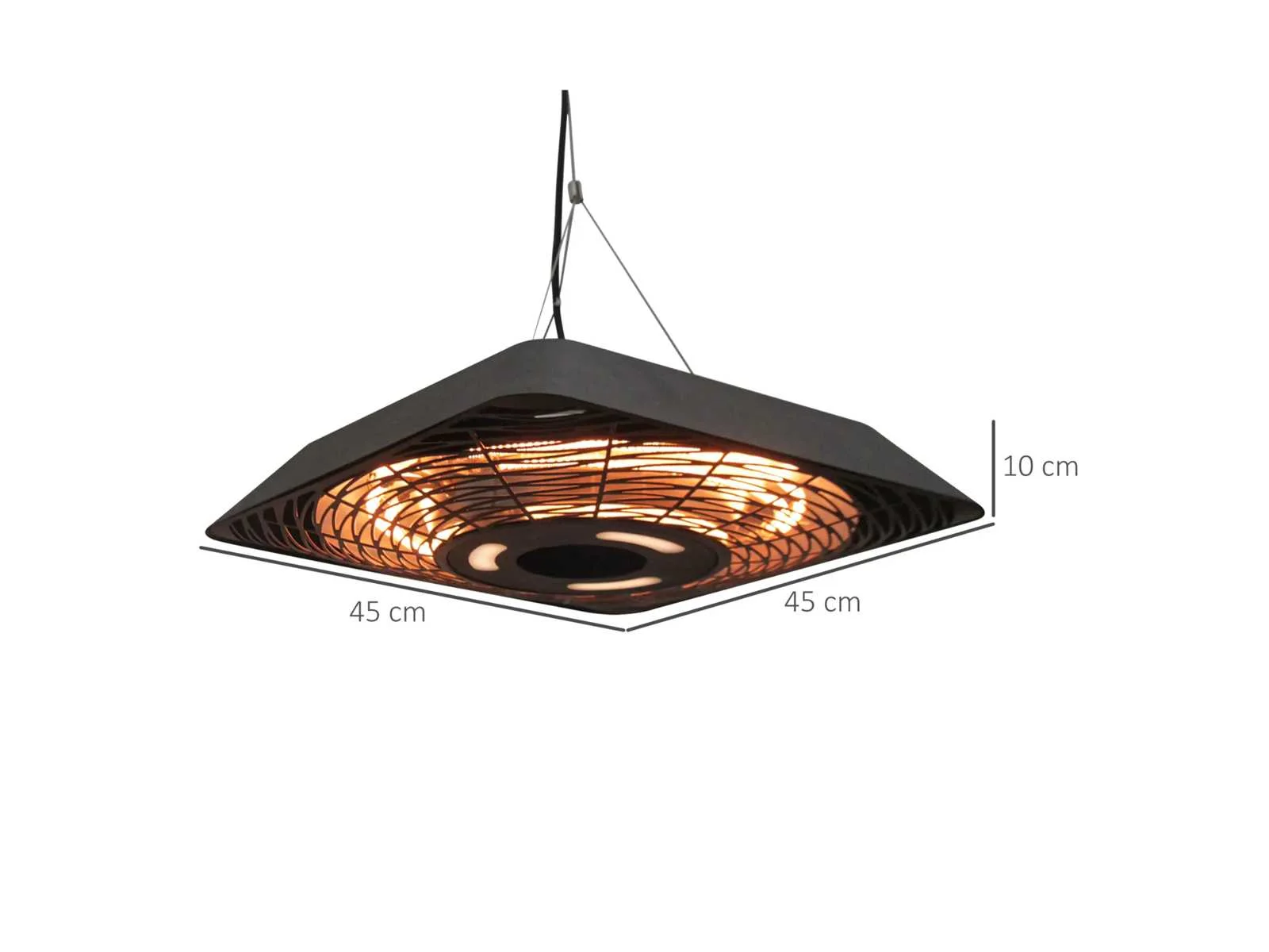 Specificaties: - Materialen: aluminium, metaal, plastic, glas - Kleur: Zwart - Totale afmetingen: 45L x 45B x 10H cm - Lengte stroomkabel: 1,8 m - Ophangketting: 100 cm - Spanning: 220-240V - Vermogen: 800W/1200W/2000W - Batterijen: 2 x AAA (niet inbegrepen) Non