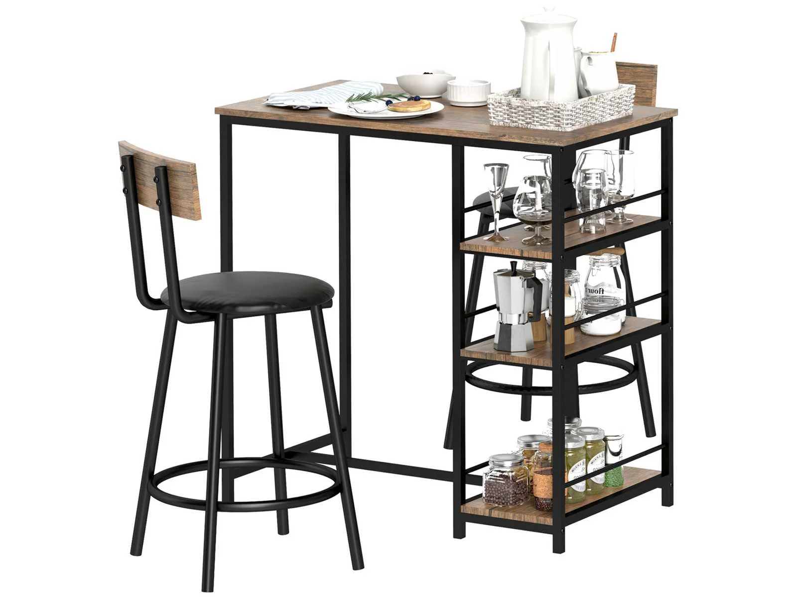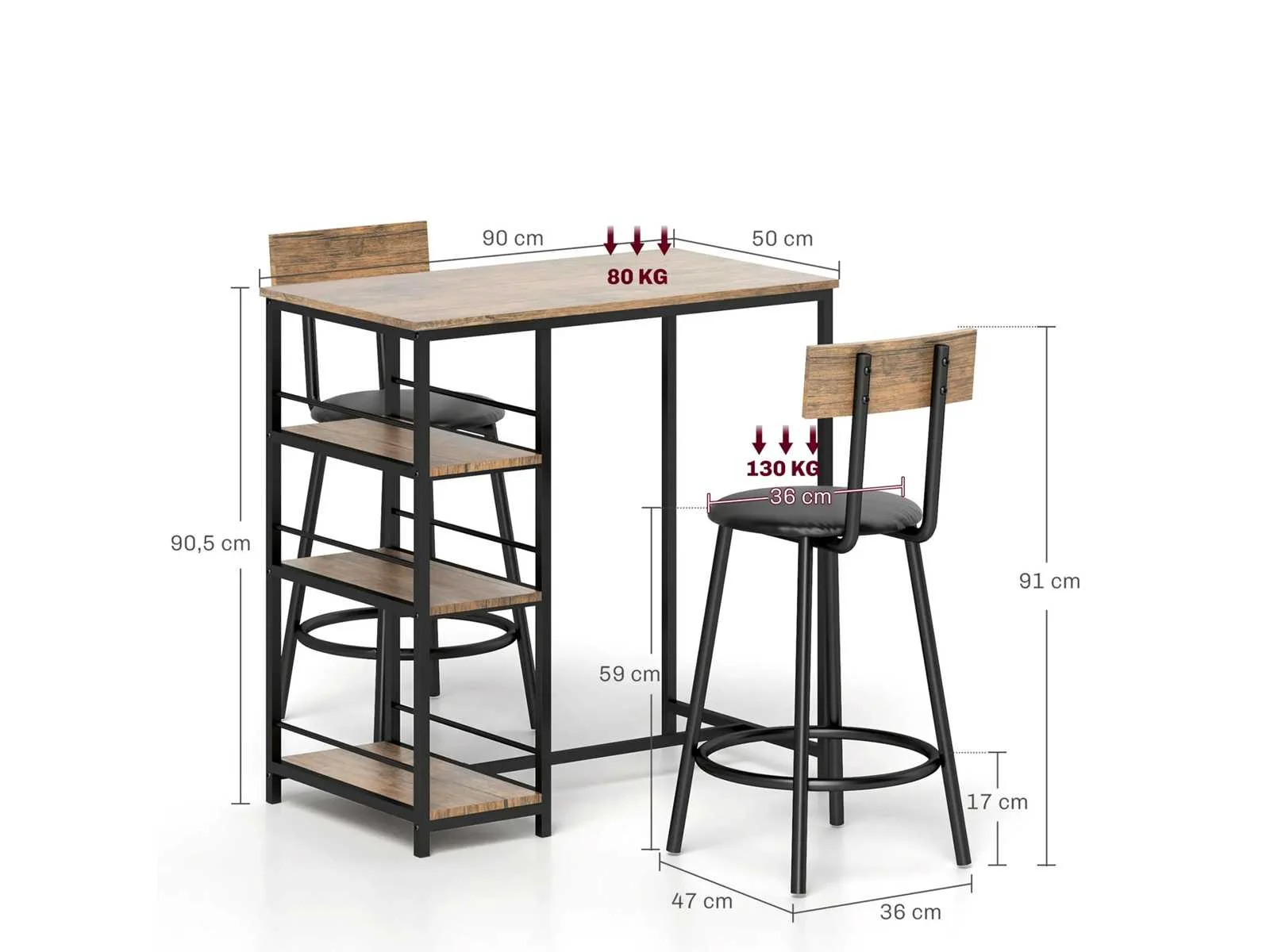 Specificaties: - Kleur: Eiken - Materiaal: MDF, kunstleer, staal - Afmetingen tafel: 90B x 50D x 90,5H cm - Afmetingen stoel: 36B x 47D x 91H cm - Afmetingen zitting: 36B x 36D x 59H cm - Afmetingen rugleuning: 35B x 12H cm - Afmetingen plank: 49B x 29D x 21,5/20/34,5H cm - Draagvermogen: 80 kg (tafel), 130 kg (stoel) Non