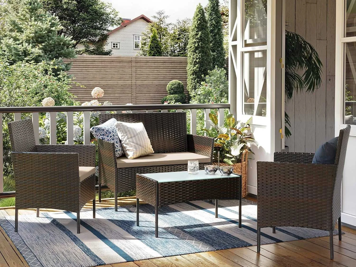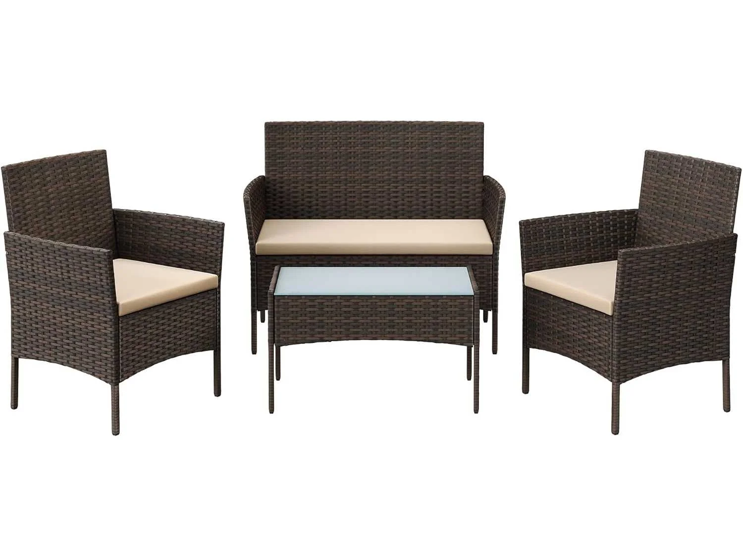 Kenmerken: - Kleuren: Bruin, taupe - Meubelmaterialen: gepoedercoat staal, polyethyleen, gehard glas - Materiaal kussen: VFT (Vertical Fiber Technology) vulling, polyester hoes - Afmetingen kleine bank: 54,5 x 56,5 x 81,5 cm (D x B x H) - Afmetingen van de grote bank: 54,5 x 99 x 81,5 cm (D x B x H) - Afmetingen tafel: 41 x 71 x 39 cm (L x B x H) - Totaal gewicht: 26 kg - Maximaal statisch draagvermogen van de kleine bank: 150 kg - Maximaal statisch draagvermogen van de grote bank: 200 kg - Maximaal statisch draagvermogen van de tafel: 30 kg Non