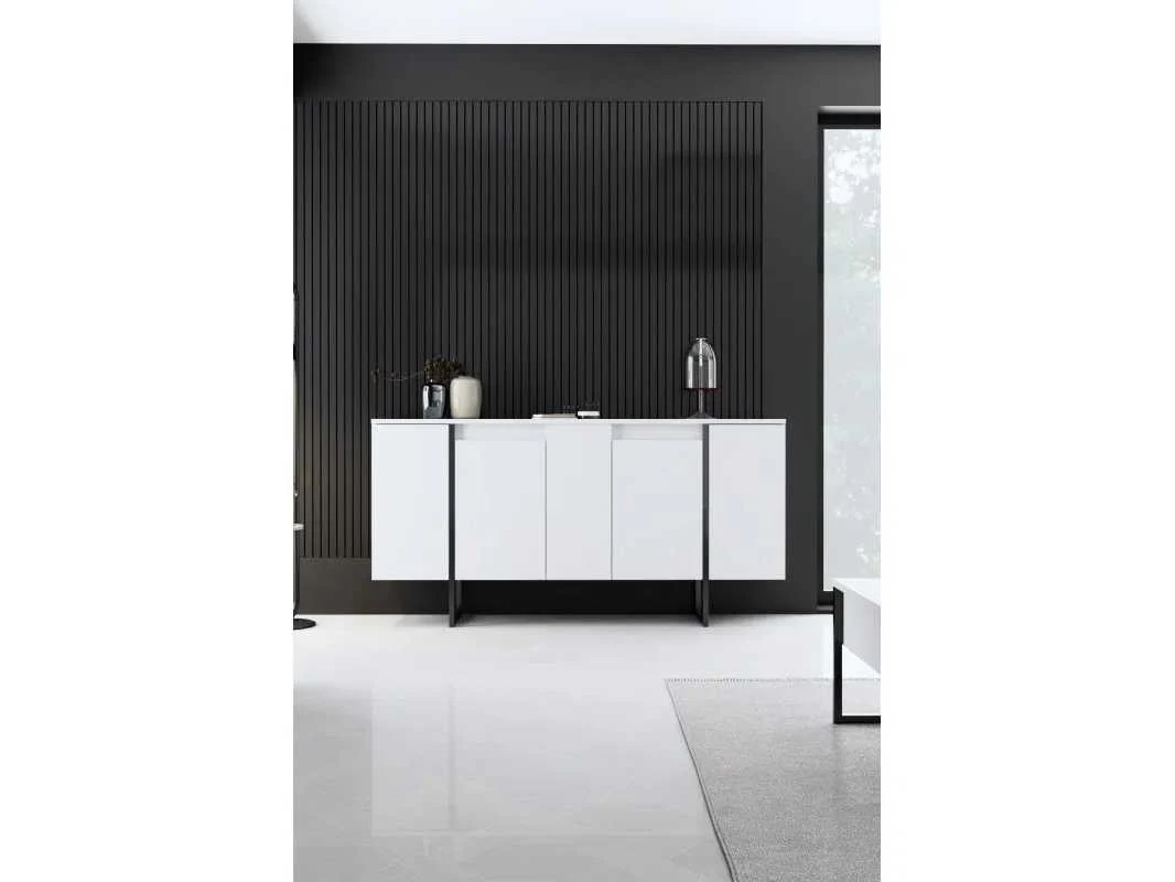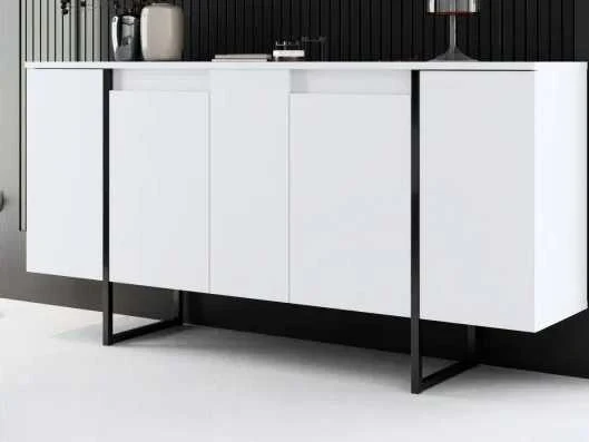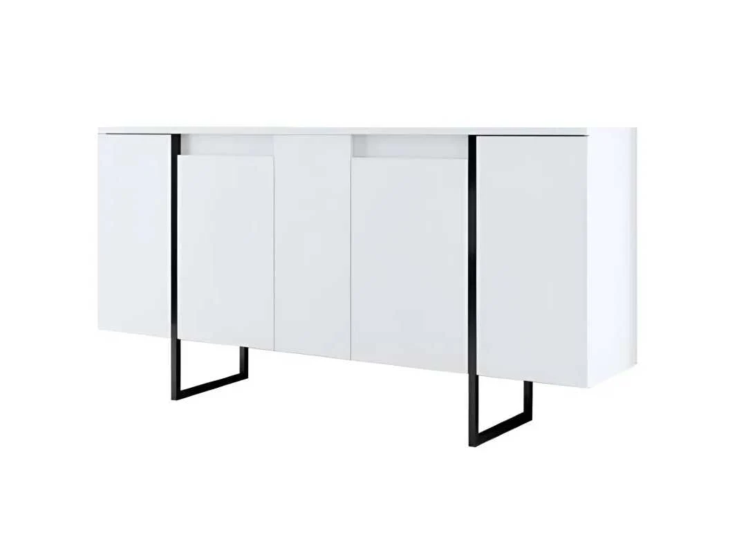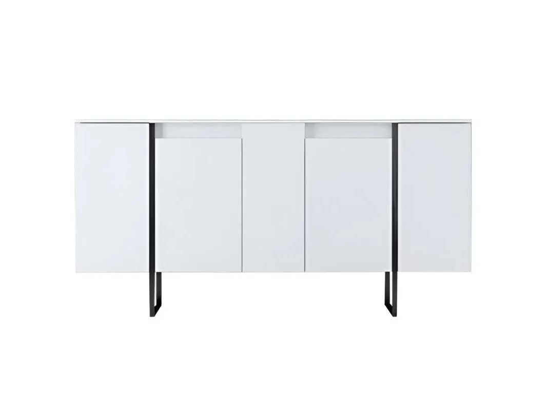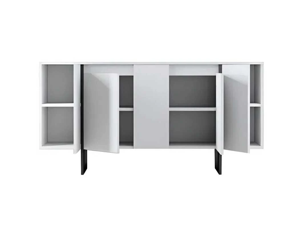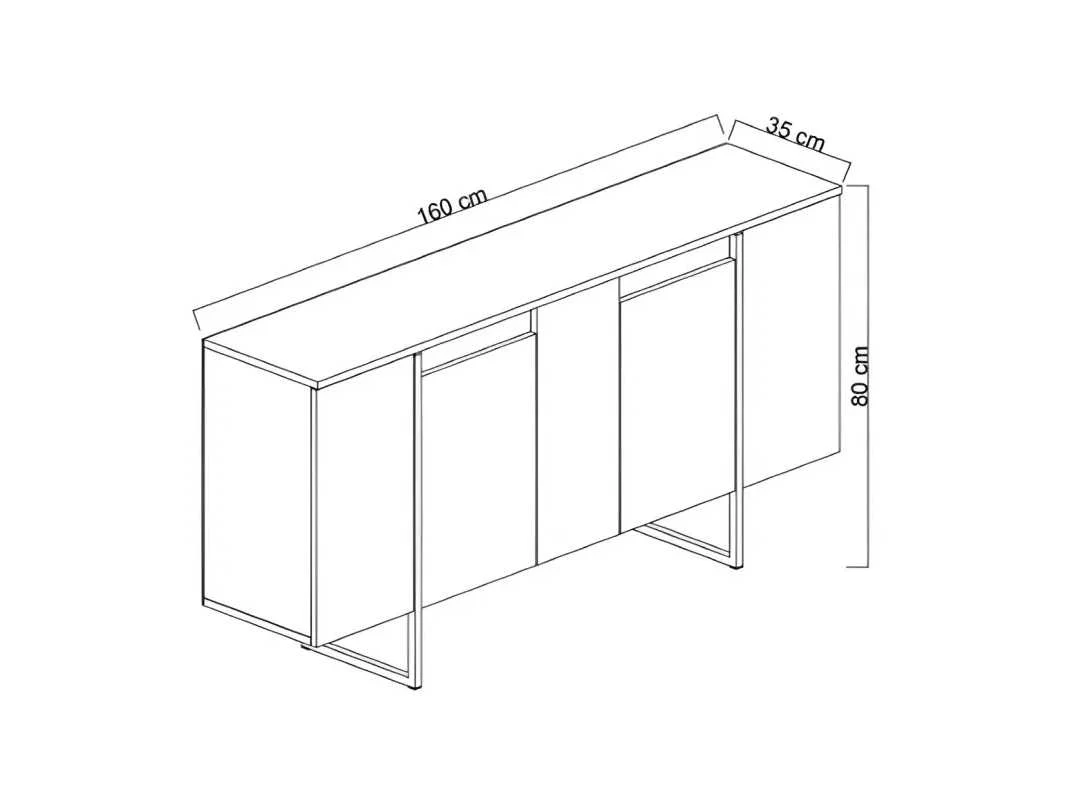 Productomschrijving: De console is gemaakt van 1,8 cm dik geperst hout, bekleed met melamine. De afwerking is wit. Het is uitgerust met metalen poten. Hij is 160 cm breed, 80 cm hoog en 35 cm diep. Non