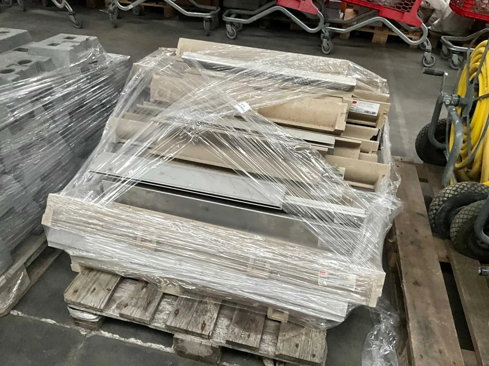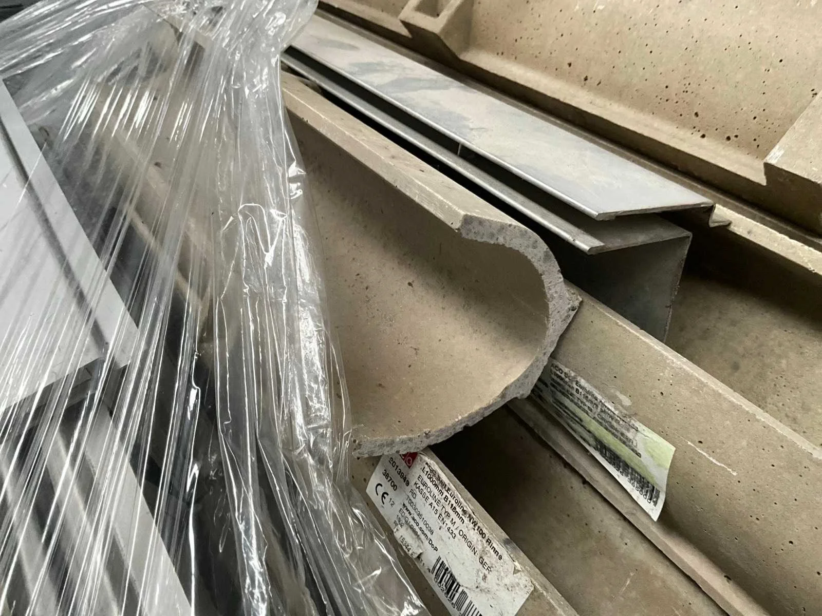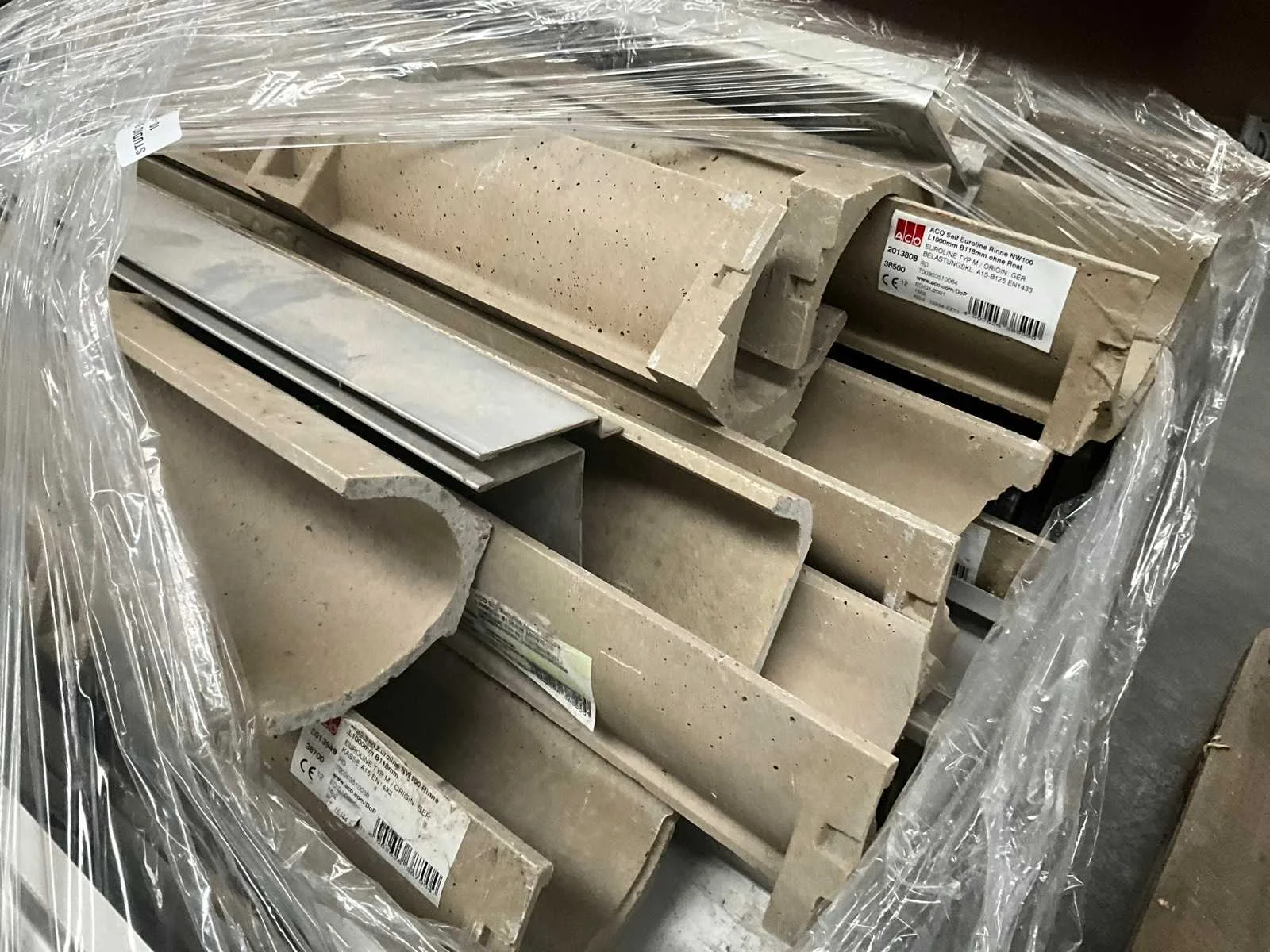 Partij afvoergoten Self Euroline NW100 (100 cm) en enige dito tussenstukken vanaf 50 cm lengte, compleet met enige diverse ACO Brickslots waarvan enkele licht beschadigd. Nee Merk: Acodrain