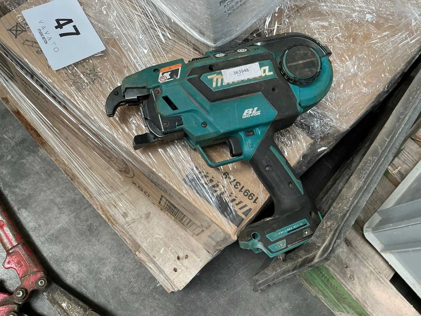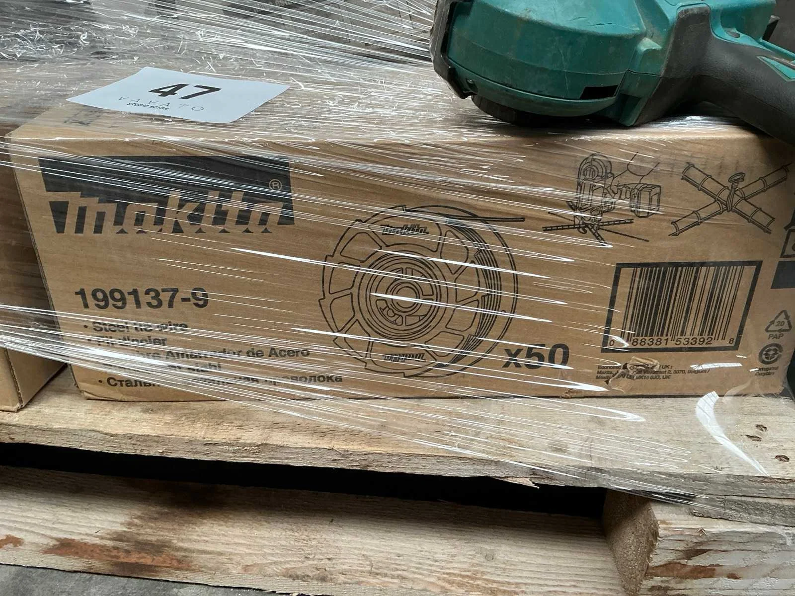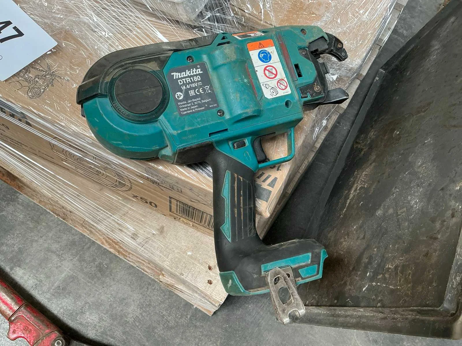 Bestaande uit vlechtmachine MAKITA DTR180, 5x dozen inhoudende 50 rollen staaldraad MAKITA 199139-9 en diverse losse, diverse schroeven en hoppertrechterpistool GRACO 5,7L en touw. Compleet met dompelpomp en darm. Liggende op pallet Nee