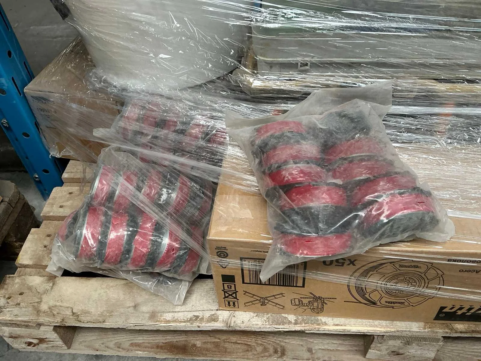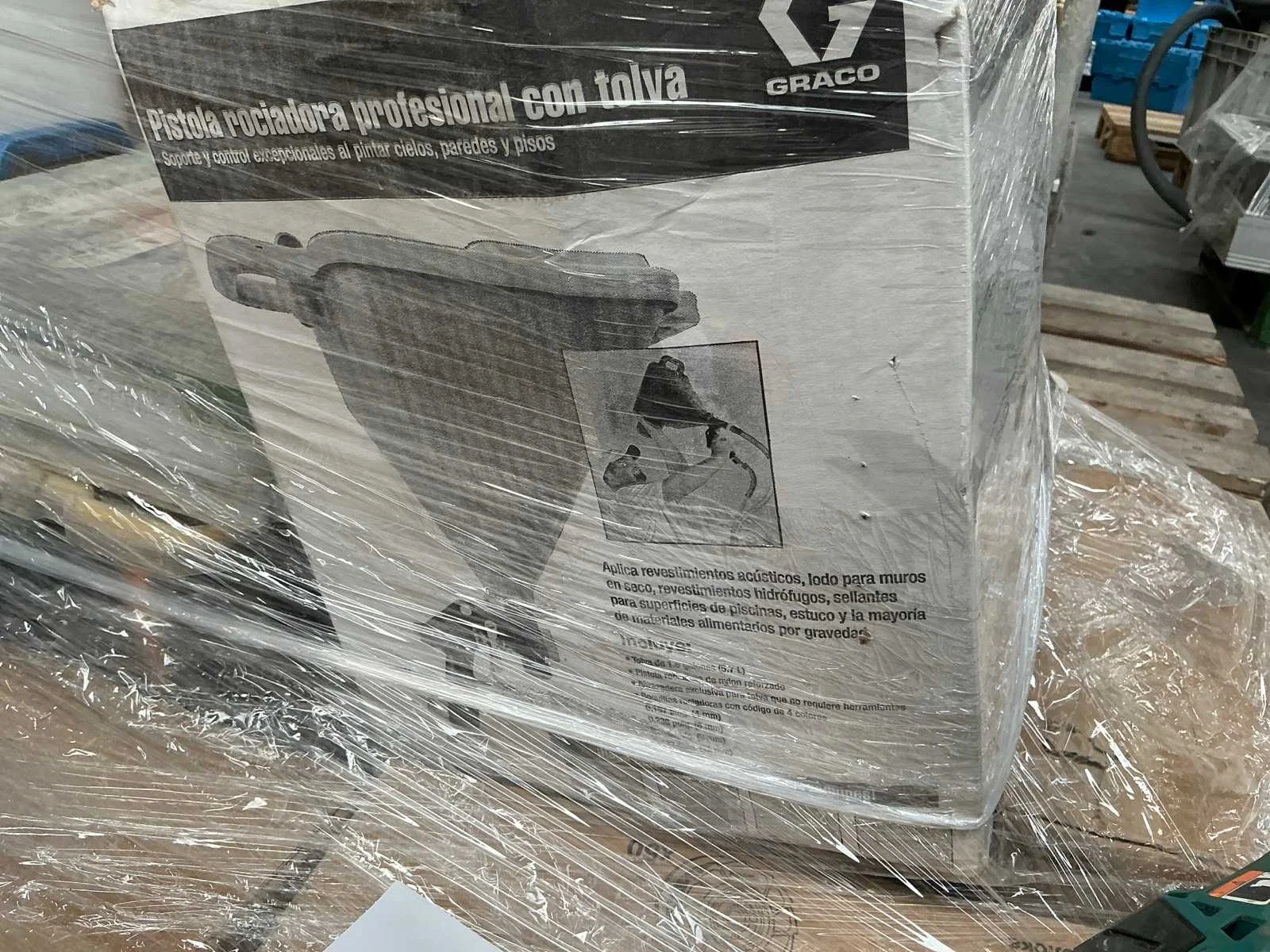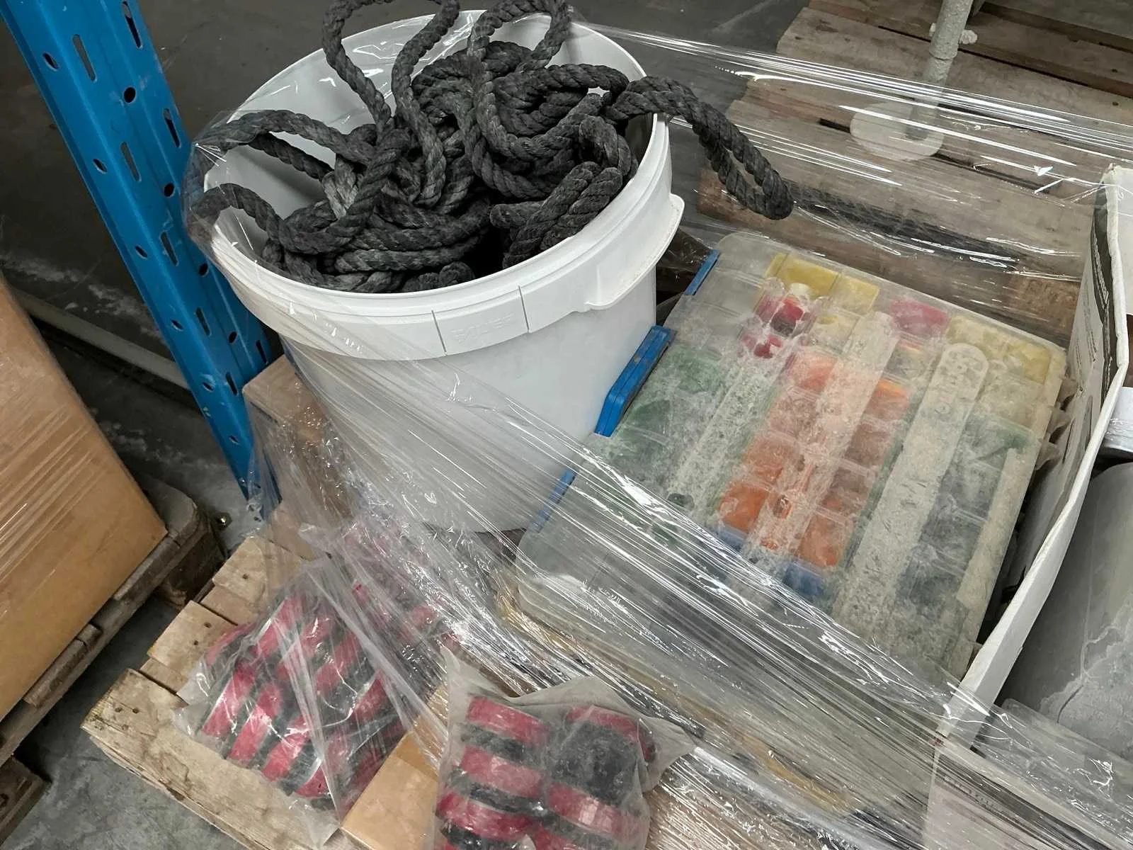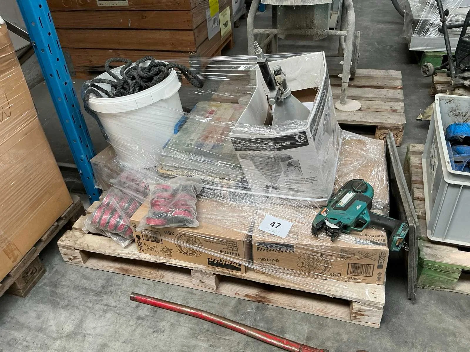 Bestaande uit vlechtmachine MAKITA DTR180, 5x dozen inhoudende 50 rollen staaldraad MAKITA 199139-9 en diverse losse, diverse schroeven en hoppertrechterpistool GRACO 5,7L en touw. Compleet met dompelpomp en darm. Liggende op pallet Nee
