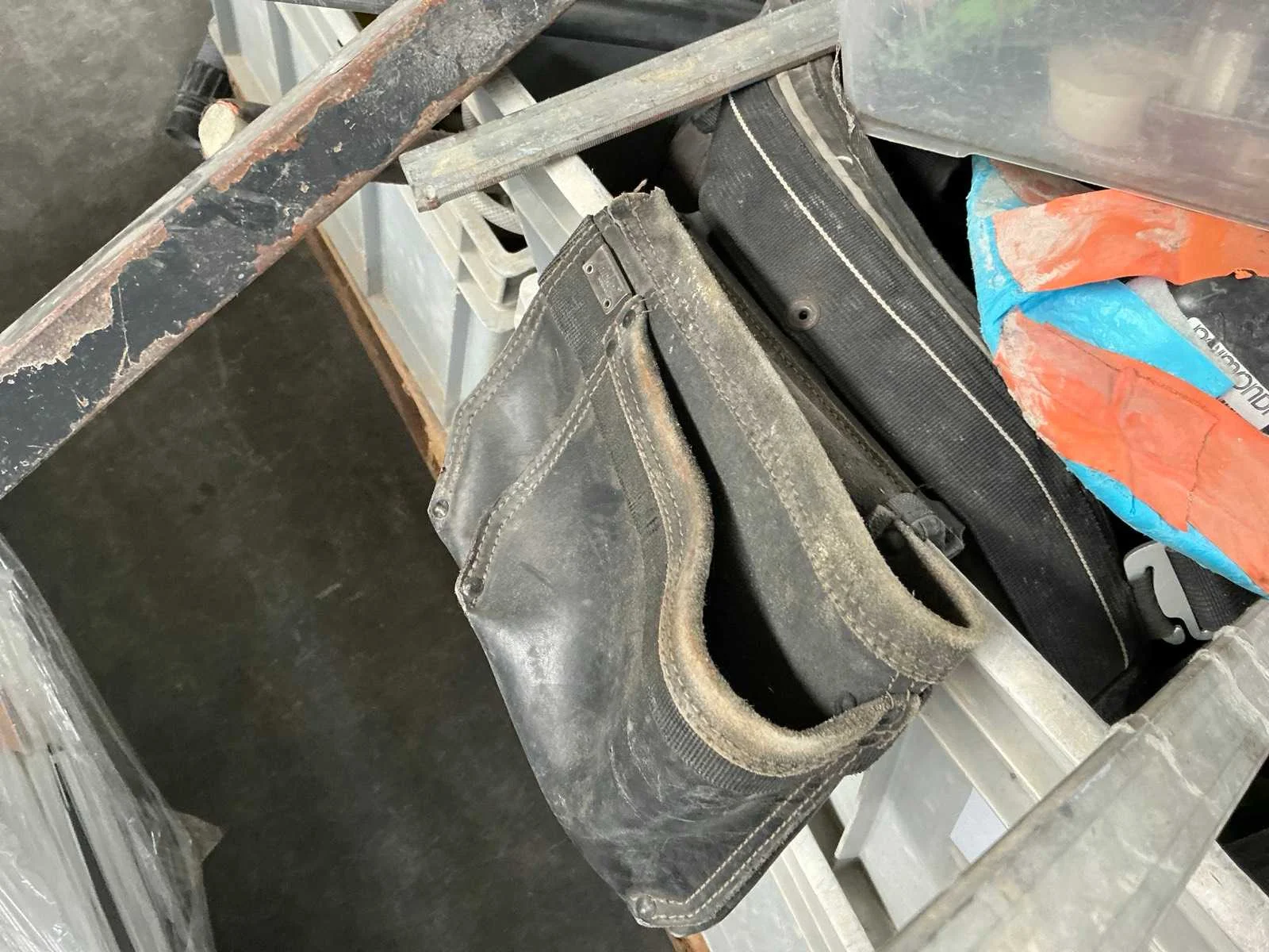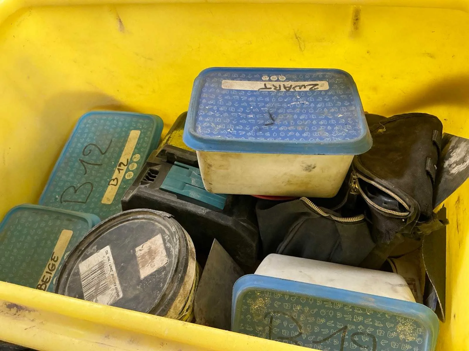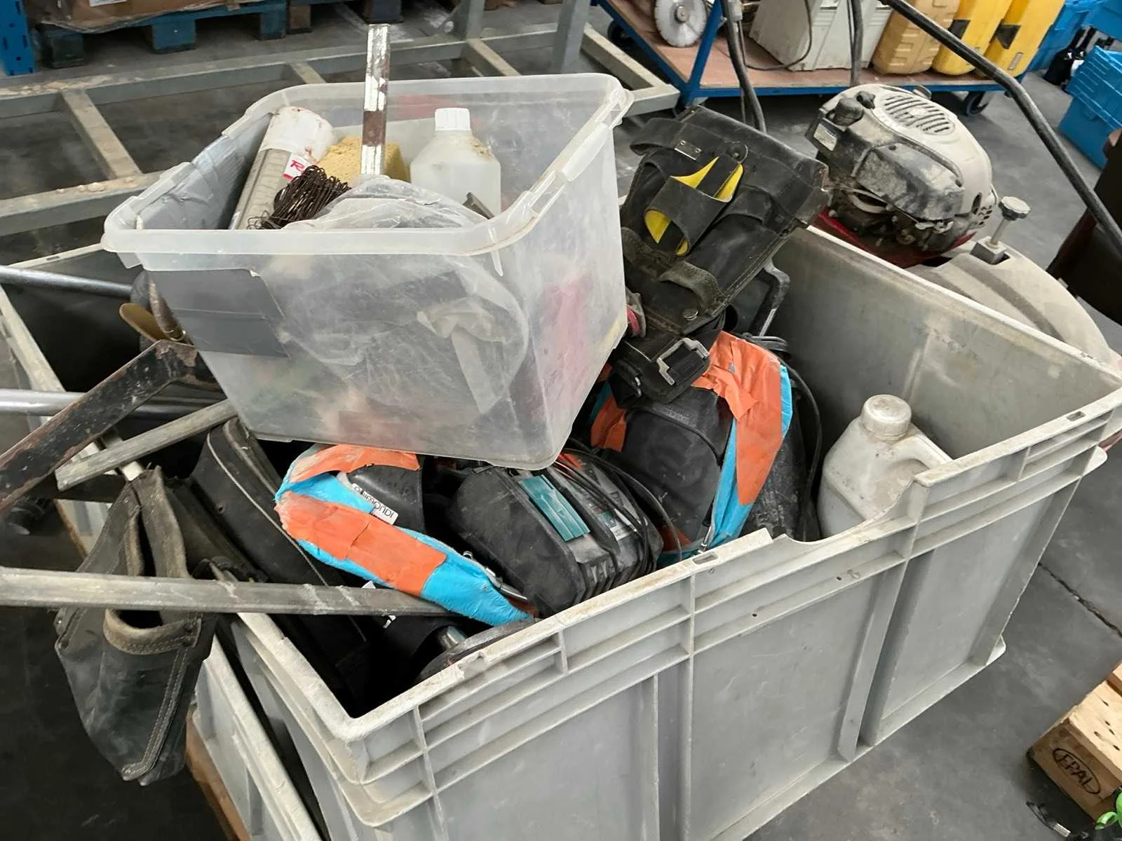 Waaronder divers handgereedschap, gereedschapsriem SNICKERS, werklamp, acculader MAKITA, stofzuigerdarmen, voorhamer, 2 diverse drukspuiten waaronder CHAPIN. Liggende in 3 PVC bakken waaronder 1x leeg. Nee