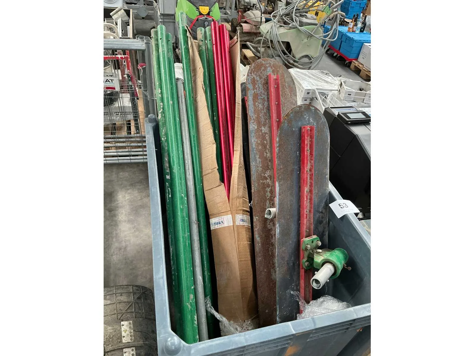 Bestaande uit: 3x afstrijkspaan VMG met afmetingen 120cm x 30cm, compleet met 11x diverse handvatstangen VMG waaronder voornamelijk met lengte 180cm. Liggende in verrijdbare PVC palletbox. Nee
