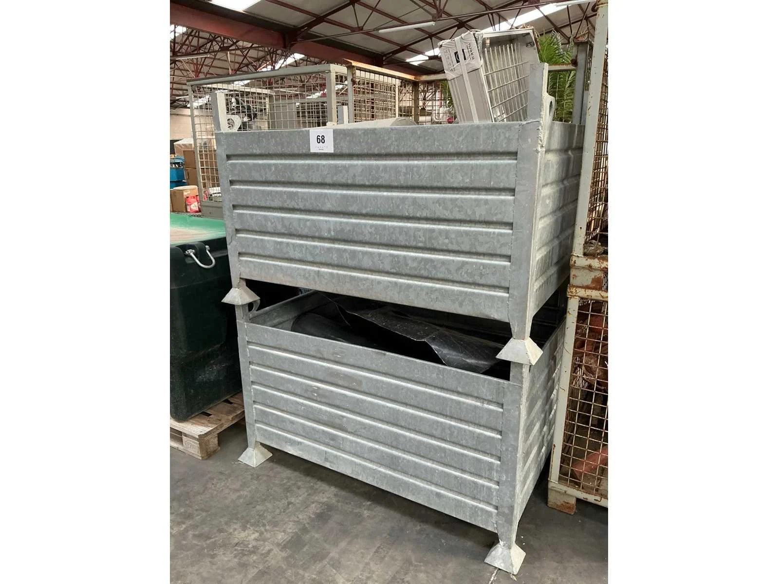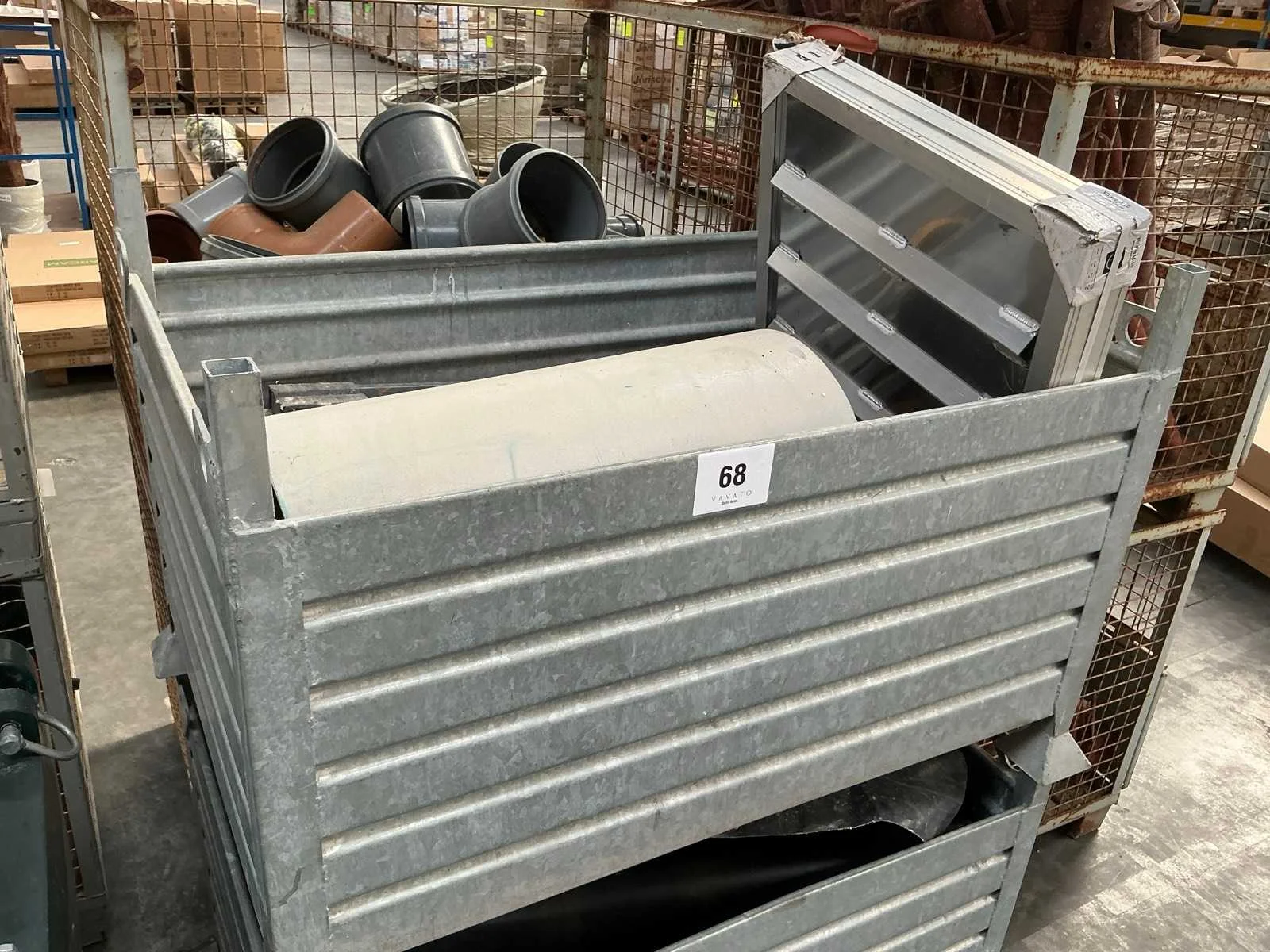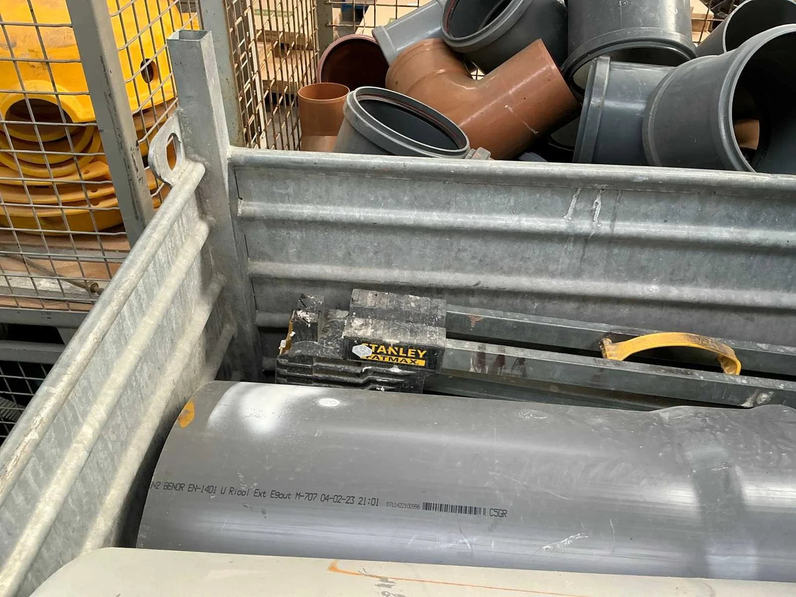 Waaronder klinkerdeksel YUCON, 2 PVC rioolbuizen waaronder met dia 40cm, schraaf STANLEY FATMAX, 2x diverse hijskettingen, partij diverse metalen staven, rol aangebroken bouwfolie en grote partij diverse houten spiezen. Liggende in 2x metalen stapelbak met afmetingen ca. 100 x 80 x 71cm. Stapelbakken inbegrepen. Nee