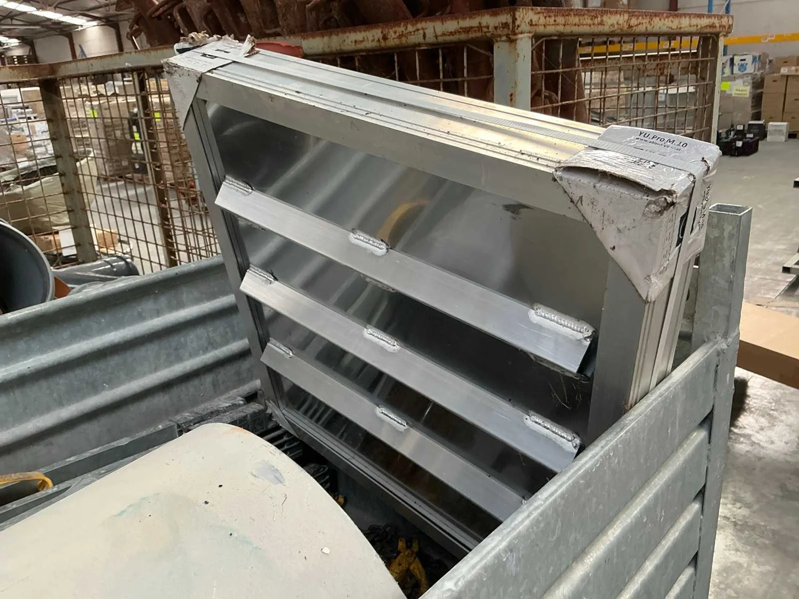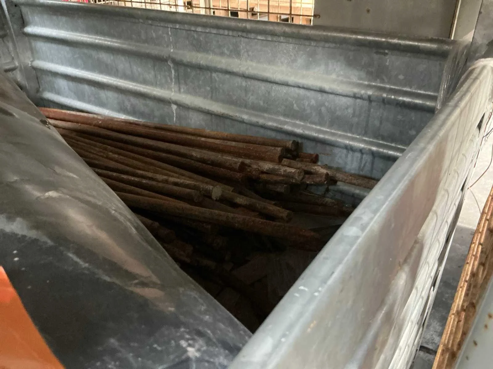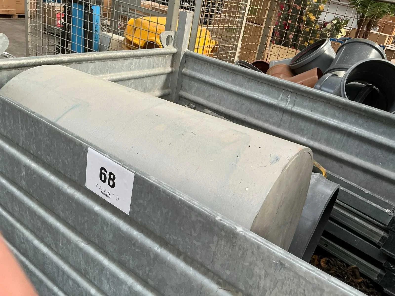 Waaronder klinkerdeksel YUCON, 2 PVC rioolbuizen waaronder met dia 40cm, schraaf STANLEY FATMAX, 2x diverse hijskettingen, partij diverse metalen staven, rol aangebroken bouwfolie en grote partij diverse houten spiezen. Liggende in 2x metalen stapelbak met afmetingen ca. 100 x 80 x 71cm. Stapelbakken inbegrepen. Nee