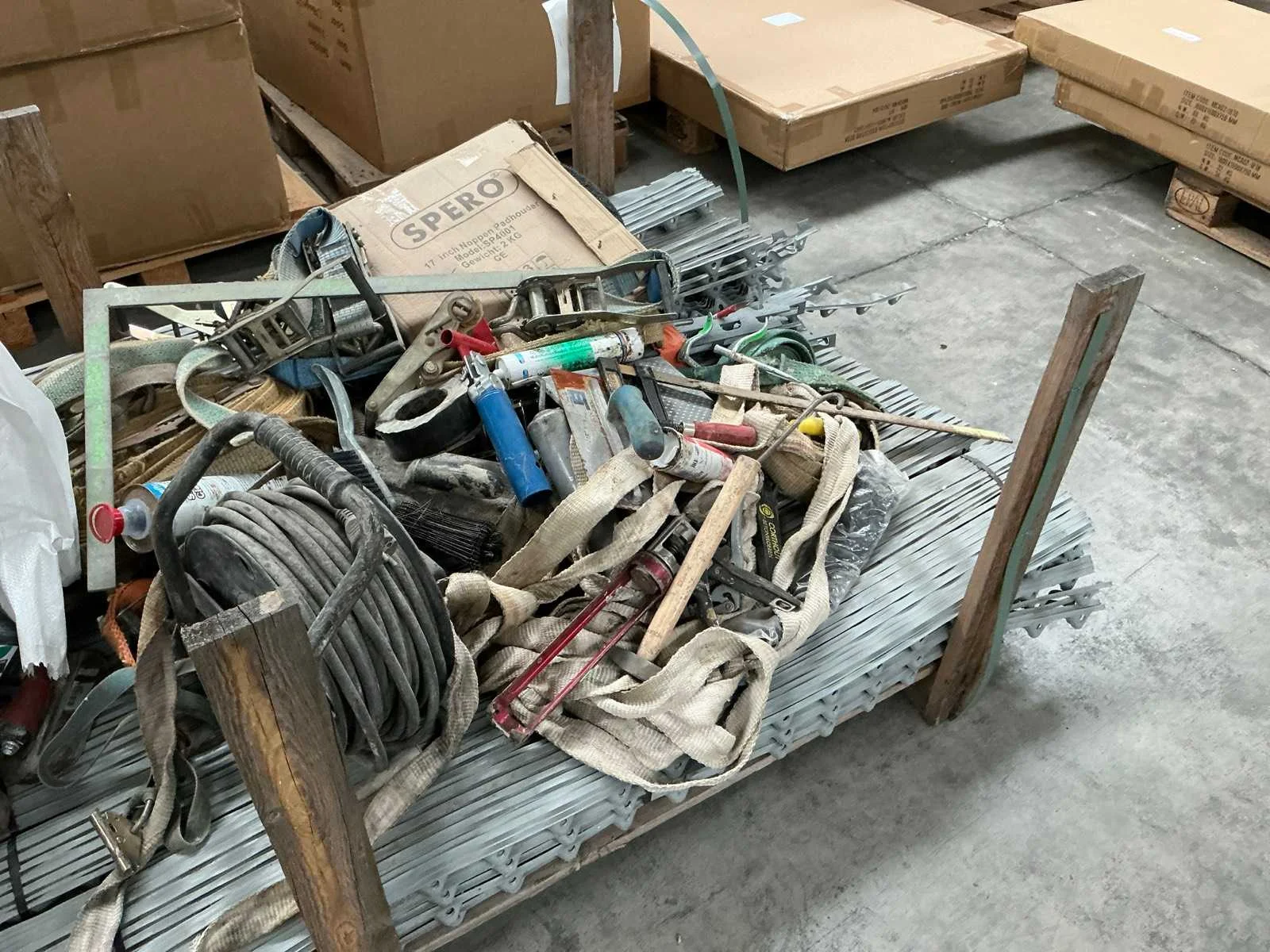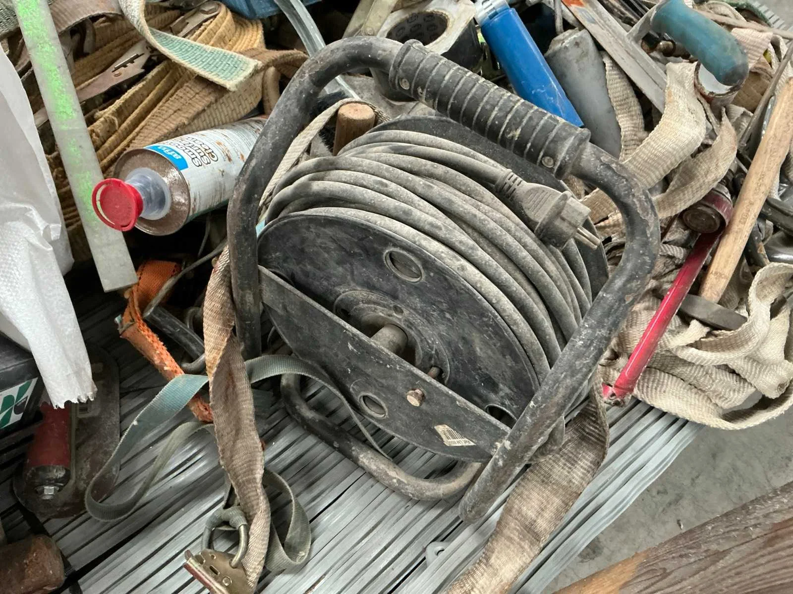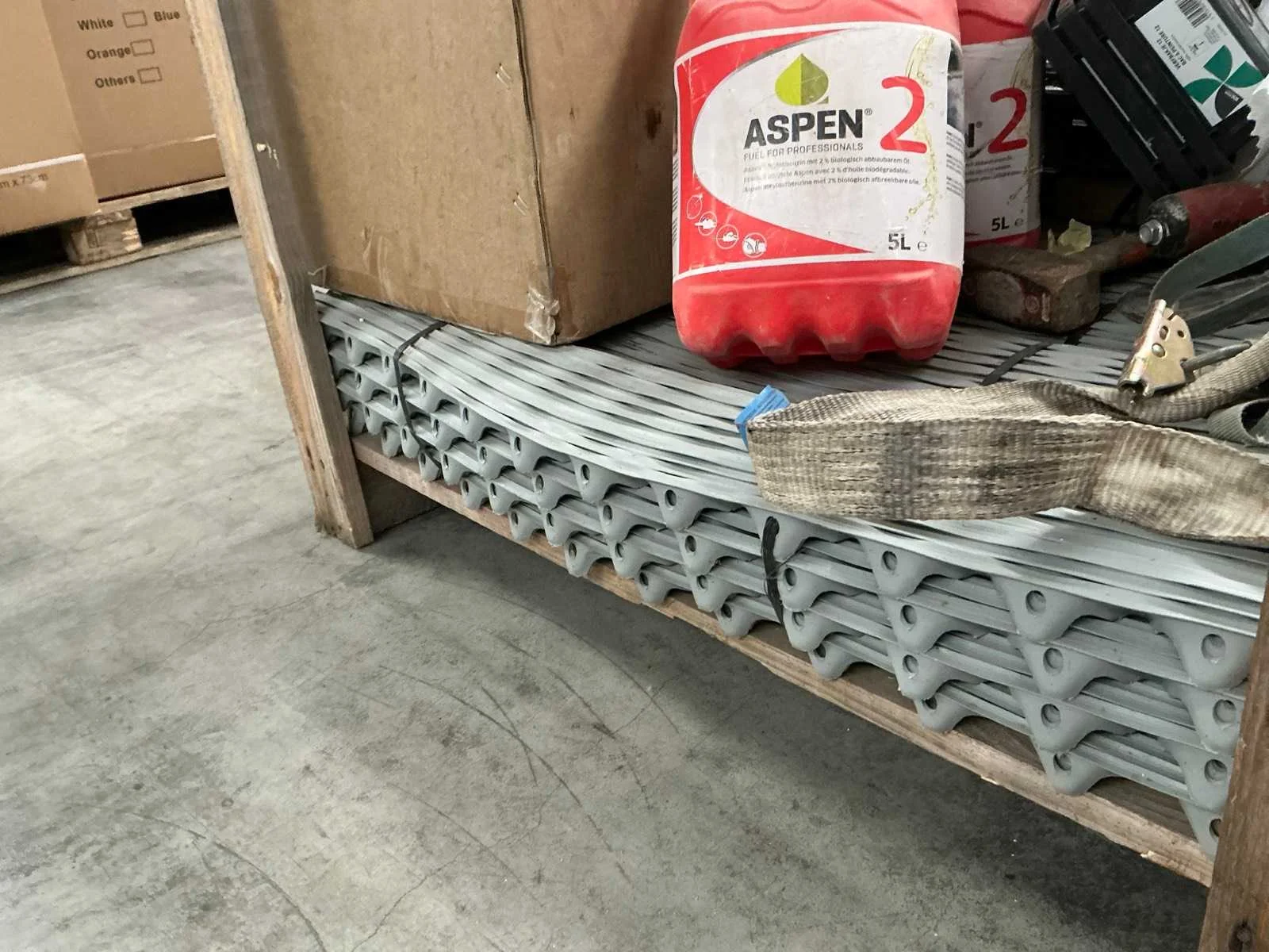 Bestaande uit grote partij PVC/kunststoffen bouwprofielen, 2x jerrycan ASPEN, 1x kabelhaspel, diverse spandbanden, diverse truwelen, siliconenspuit. Liggende op 1x pallet. Nee