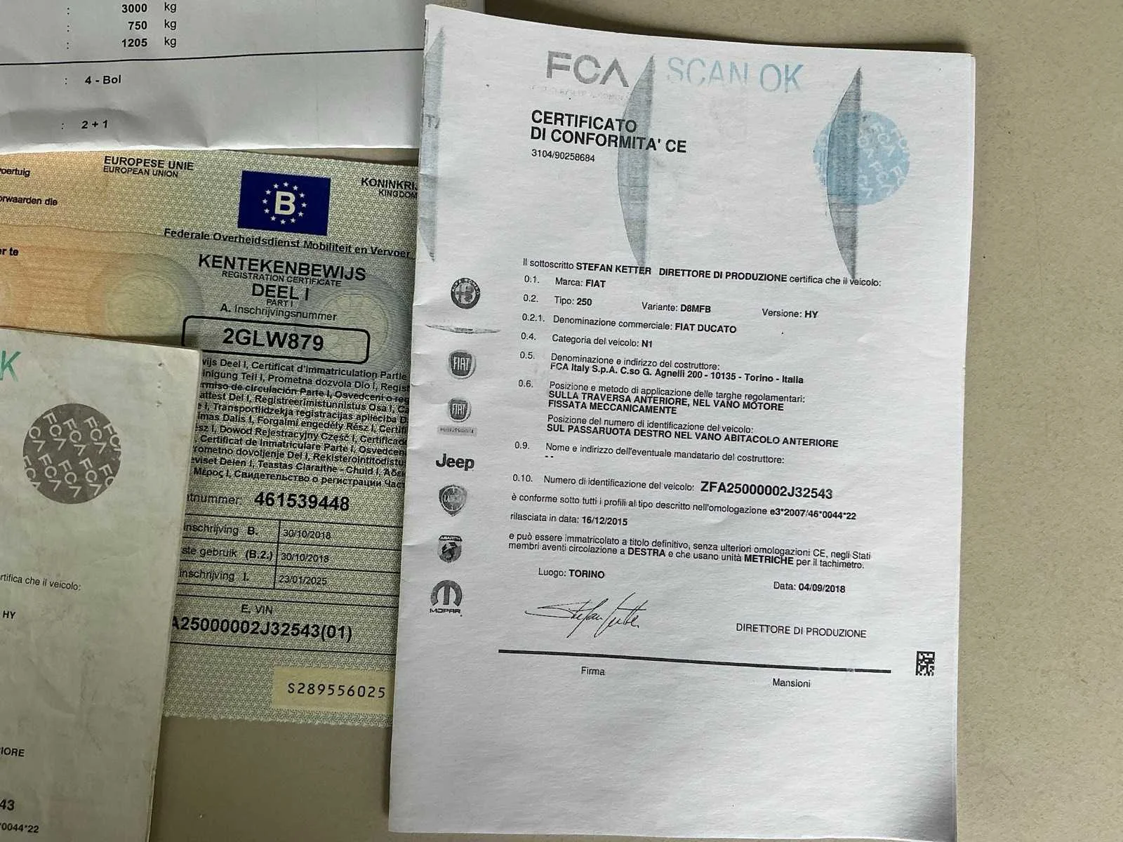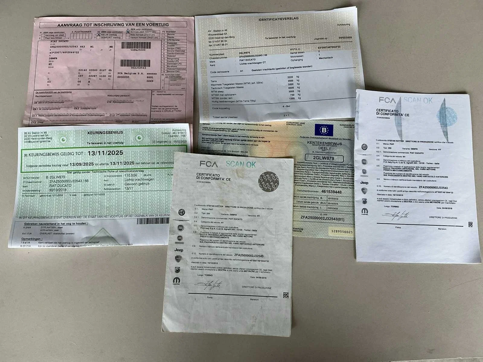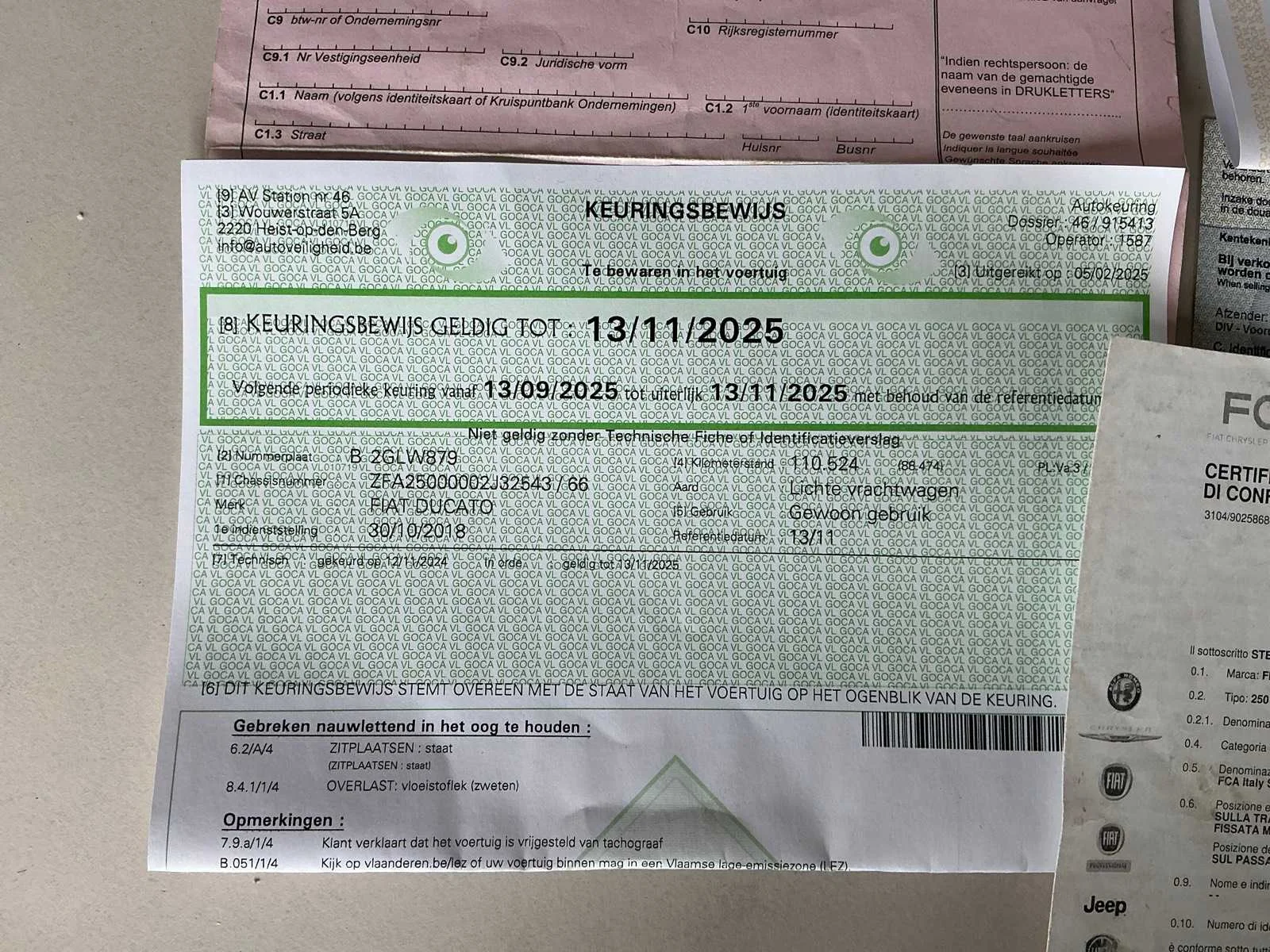 Voorzien van volgende documenten: keuringsbewijs, identificatieverslag, kentekenbewijs deel 1 en certificaat van conformiteit Nee Model: FIAT DUCATO Type: 250 Bouwjaar: 2018 Afgelezen kilometerstand: 130363km Cilinderinhoud: 2287cc Vermogen (kW): 110kW Brandstof: diesel Chassisnummer: ZFA25000002J32543 Laadvermogen: 3500kg Datum eerste toelating: 30/10/2018 Aantal zitplaatsen: 3 Transmissie: Handgeschakeld Emissieklasse: Euro 6b Aantal deuren: 2 Aantal sleutels: 2 Nationaliteit documenten: België Gelijkvormigheidsattest aanwezig: true Keuringsrapport geldig tot: 13/11/2025 Technische fiche: true startinformatie : Start en rijdt Zichtbare schade: Ja Vavato voert geen technische keuring uit.: true Inschrijvingsbewijs - deel 1 : Aanwezig Inschrijvingsbewijs - deel 2: Niet aanwezig