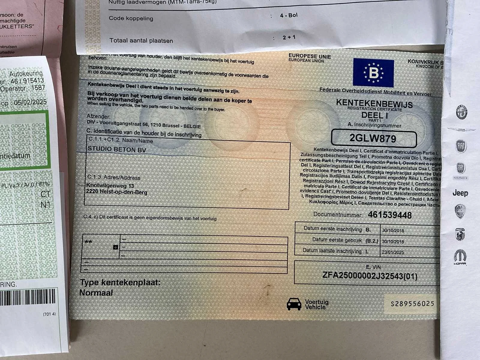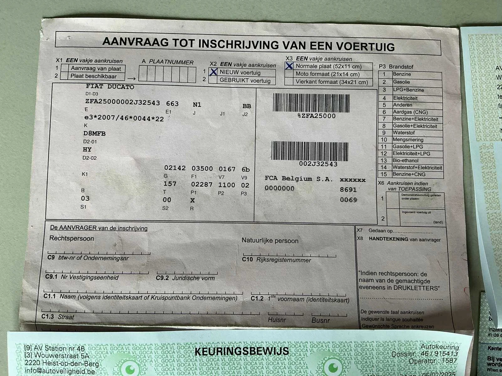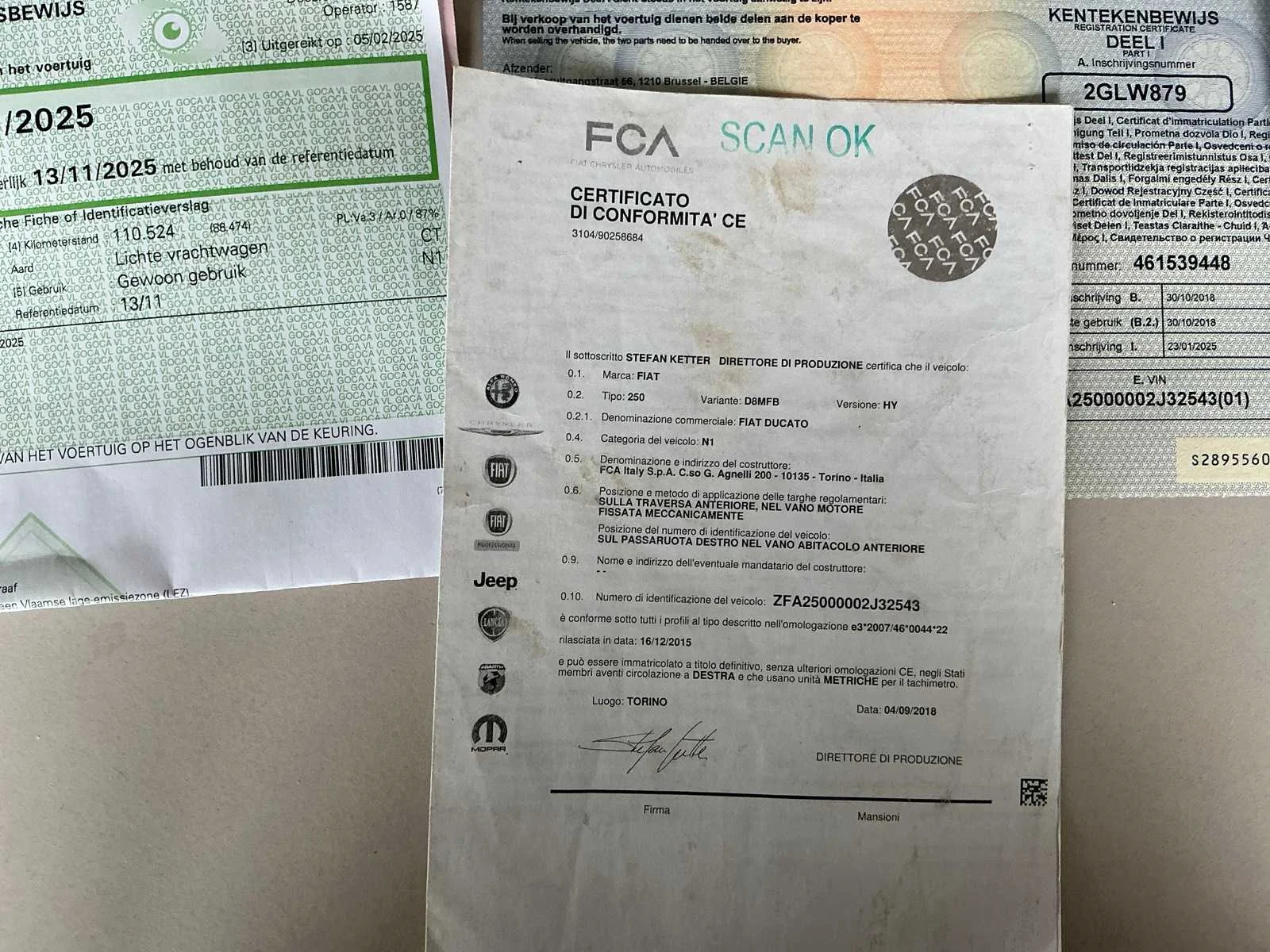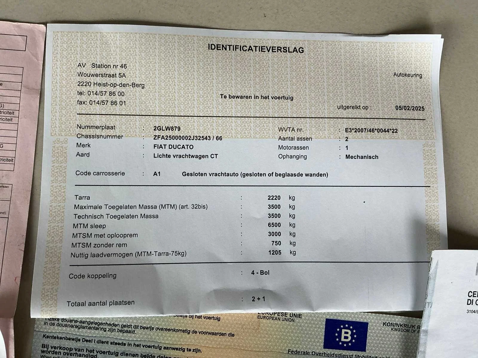 Voorzien van volgende documenten: keuringsbewijs, identificatieverslag, kentekenbewijs deel 1 en certificaat van conformiteit Nee Model: FIAT DUCATO Type: 250 Bouwjaar: 2018 Afgelezen kilometerstand: 130363km Cilinderinhoud: 2287cc Vermogen (kW): 110kW Brandstof: diesel Chassisnummer: ZFA25000002J32543 Laadvermogen: 3500kg Datum eerste toelating: 30/10/2018 Aantal zitplaatsen: 3 Transmissie: Handgeschakeld Emissieklasse: Euro 6b Aantal deuren: 2 Aantal sleutels: 2 Nationaliteit documenten: België Gelijkvormigheidsattest aanwezig: true Keuringsrapport geldig tot: 13/11/2025 Technische fiche: true startinformatie : Start en rijdt Zichtbare schade: Ja Vavato voert geen technische keuring uit.: true Inschrijvingsbewijs - deel 1 : Aanwezig Inschrijvingsbewijs - deel 2: Niet aanwezig