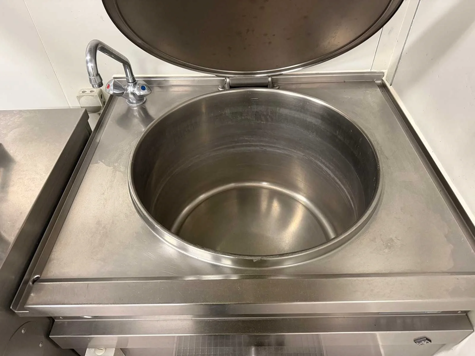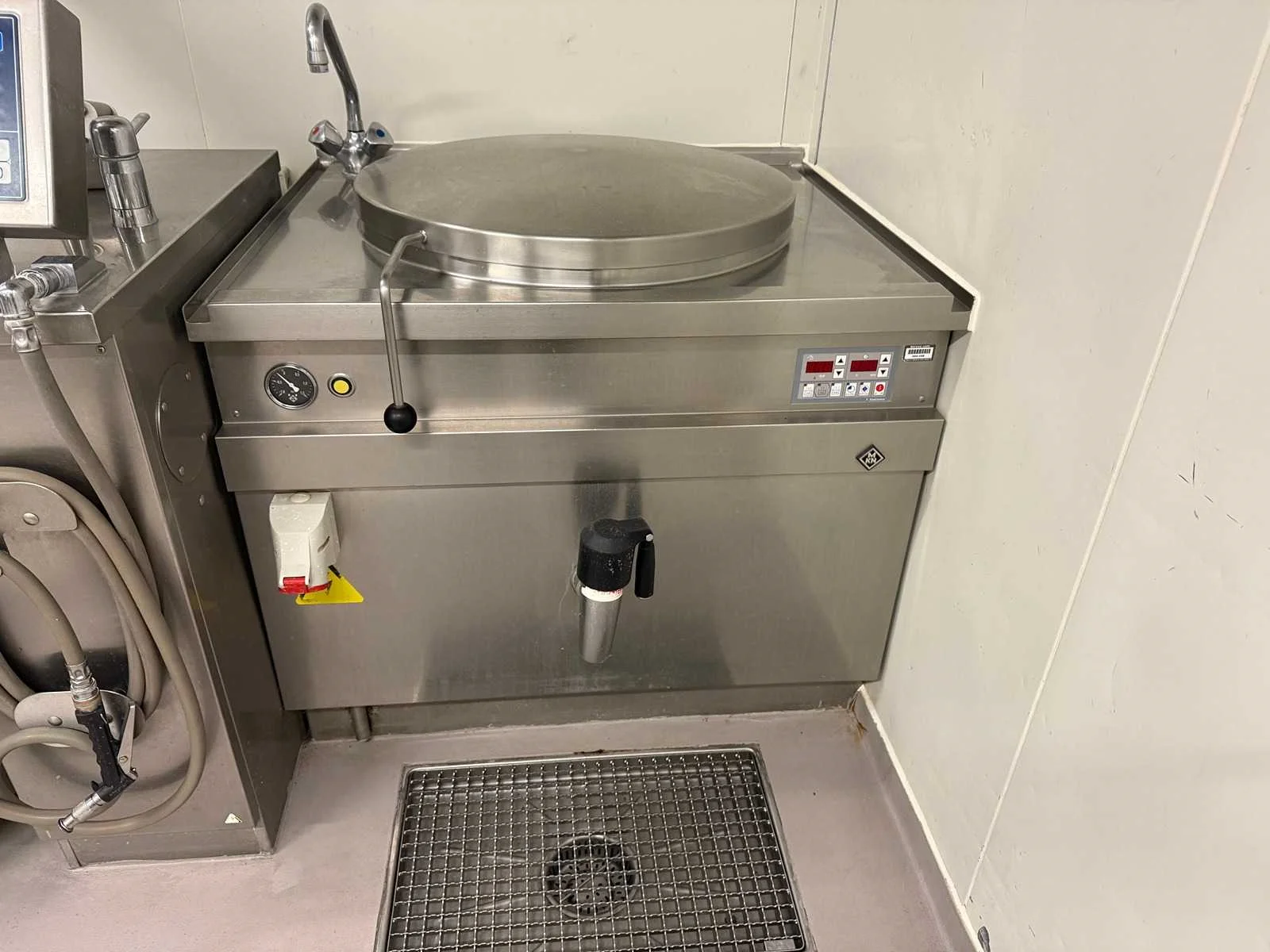 150 L inthoud Materiaal Volledig roestvrij staal (AISI 304) Werkdruk ketel ca. 0,5 bar (direct verhit) Temperatuurbereik 30 °C – 100 °C Verwarmingstype Elektrisch, bodemverwarming via contactplaat Functies Handmatige bediening, temperatuurregeling, aftapkraan, koudewaterkraan aan dek Afmetingen (L × D × H) ± 900 × 900 × 900 mm Gewicht ca. 130 – 160 kg Gebruik Soepen, sauzen, pasta's, bereide gerechten, warmhouden No Merk: MKN Gewicht: 160kg Lengte: 90cm Breedte: 90cm Hoogte: 90cm Spanning: 400 Vermogen: 15 Bouwjaar: 2008