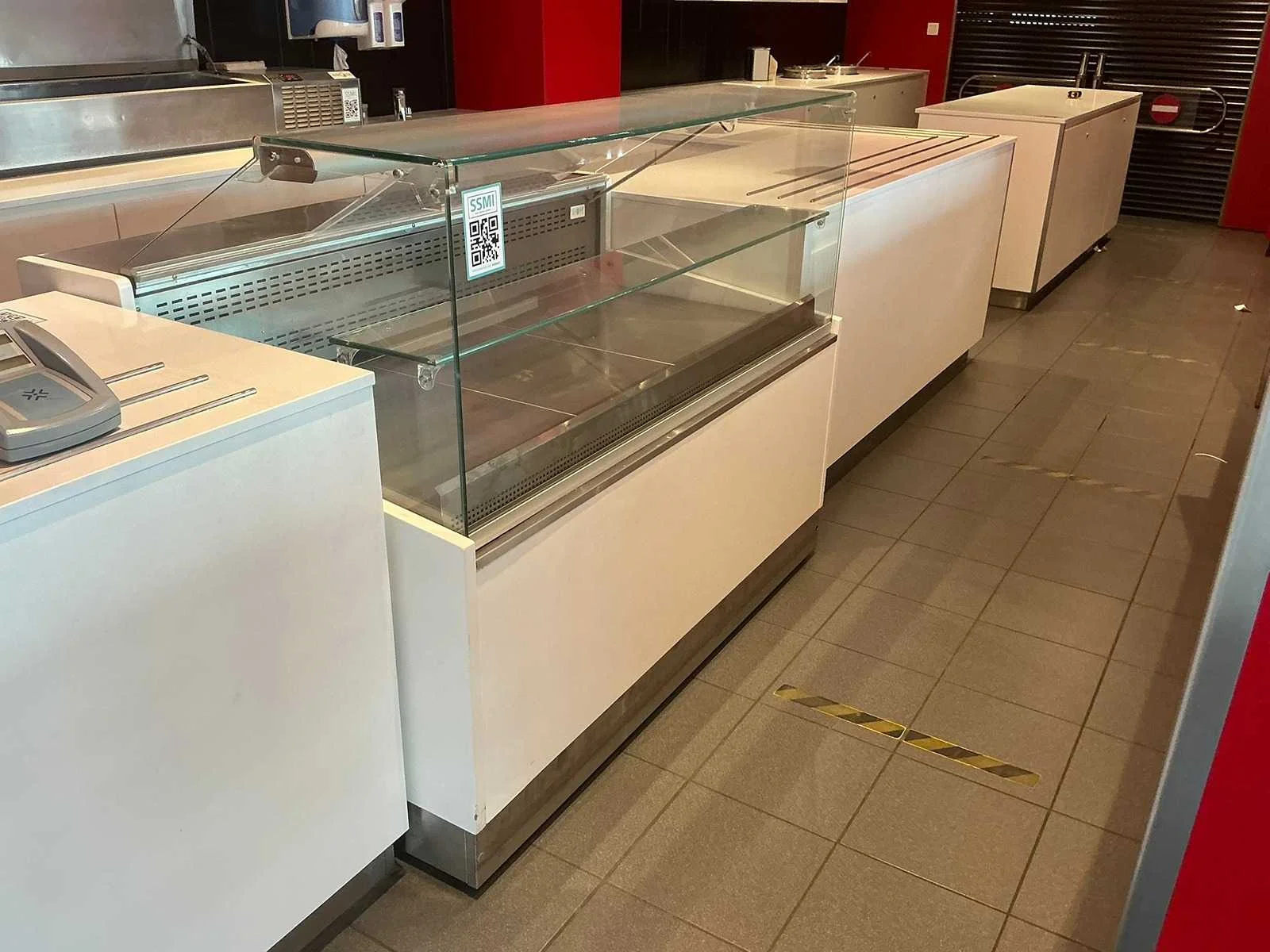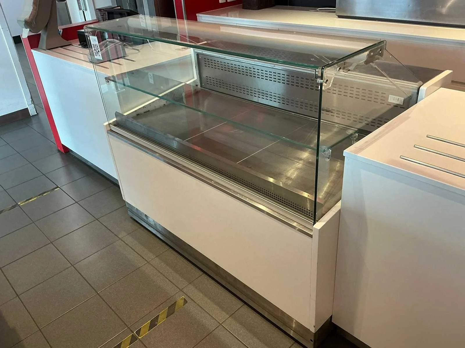 Aansluiting 230 V / 1 ph / 50 Hz Vermogen ca. 0,5 – 0,7 kW Temperatuurbereik +2 °C tot +8 °C Besturing Mechanisch of digitaal thermostaat (achterzijde) Koelprincipe Geventileerde compressorunit, geïntegreerd Opbouw RVS werkblad + glasopbouw met 2 legplanken Afmetingen ca. 150 cm b × 90 cm h × 75 cm d Front Schuin glas, vaste glasplaat bovenaan Koelmiddel R404A of R290 (afhankelijk van typeplaat) No