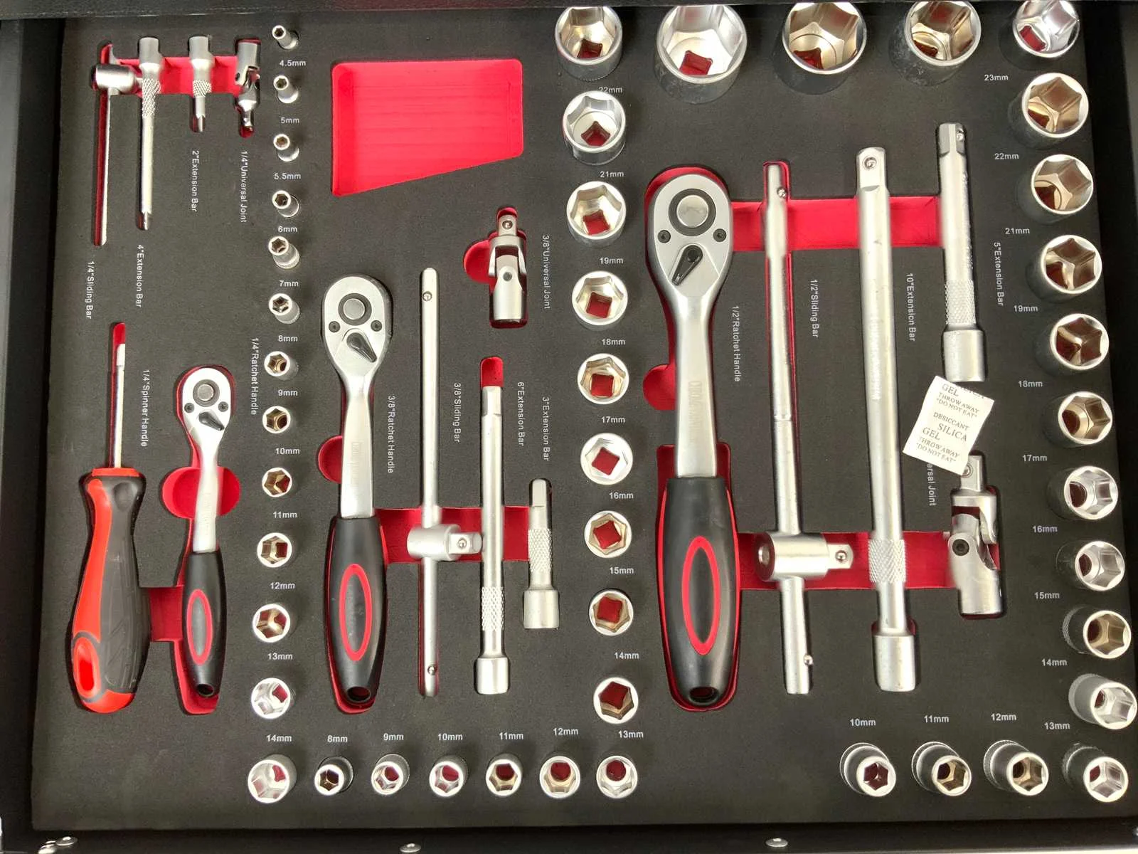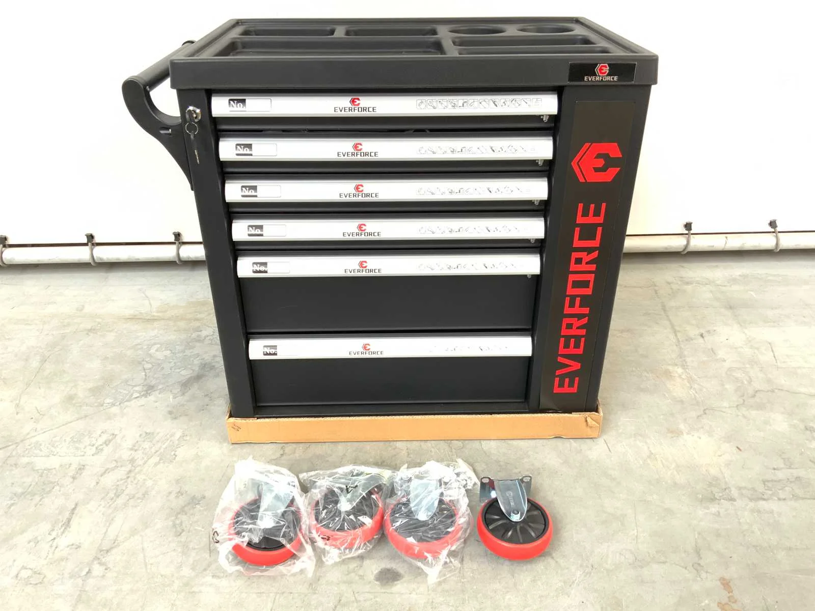 4 laden gevuld; verrijdbaar; afsluitbaar; lade 1 Doppenset 1/2” en 1/4” 4 tot en met 32 en toebehoren; Lade 2 steek ringsleutelset 8 tot en met 22 torx imbusset bitjes; lade 3 schroevendraaiers en imbusset; lade 4 tangen, hamer, pendrijvers; lade 4 & 5 zijn leeg voor opslag; 5769 Nee Merk: Everforce Aantal laden: 6 Met inhoud: true Totale afmeting L: 840mm Totale afmeting Breedte: 460mm Totale afmeting Hoogte: 830mm