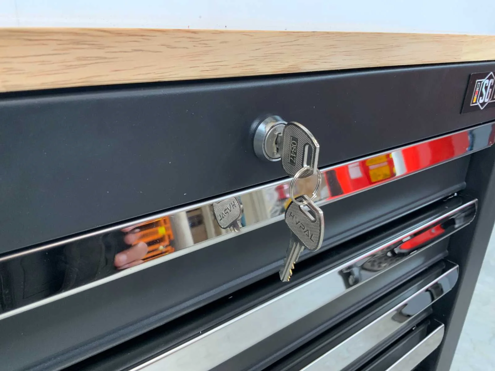 258 delig; schroevendraaiers; bitset; tangen; sleutels; etc; zwenkwielen met rem; 7 lades; 6 gevuld; Nee Merk: Stahlgruppe Type: SG11 Bouwjaar: 2023 Aantal laden: 7 Met inhoud: true Eigen gewicht: 80kg Totale afmeting L: 760mm Totale afmeting Breedte: 460mm Totale afmeting Hoogte: 980mm