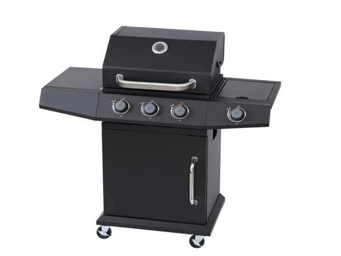 Product size: 110x48x110cm Cooking area : 515x375mm, Enamel cast iron cookinggrids,2pcs Warming rack : Stainless steel warming rack Lid: Steel, with black powder coating, double layer Thermometer: Stainless steel Firebox: Steel, with high-temp(550C) resistant powder coating Burner and Power Stainless steel tube burners, 2.8kw per mainburner, 2.5kw per side burner, total 10.9KW Oil tray: Galvanized sheet oil tray, easy remove out from back side Ignition system: Push and turn, integrated automatic easy ignition Flame tamper: Enamel flame tamper, 3pcs Control panel: Steel, with black powder coating Control knob: ABS control knob and Stainless steel knobbase Front door: Steel, with black powder coating, double layer, Side table: Steel, with black powder coating Bottom shelf: Steel, with black powder coating Wheel: 2pcs 3inch wheels with lock, 2pcs 3inch wheels without lock Cabinet side panels & Back panel Steel, with black powder coating Nee