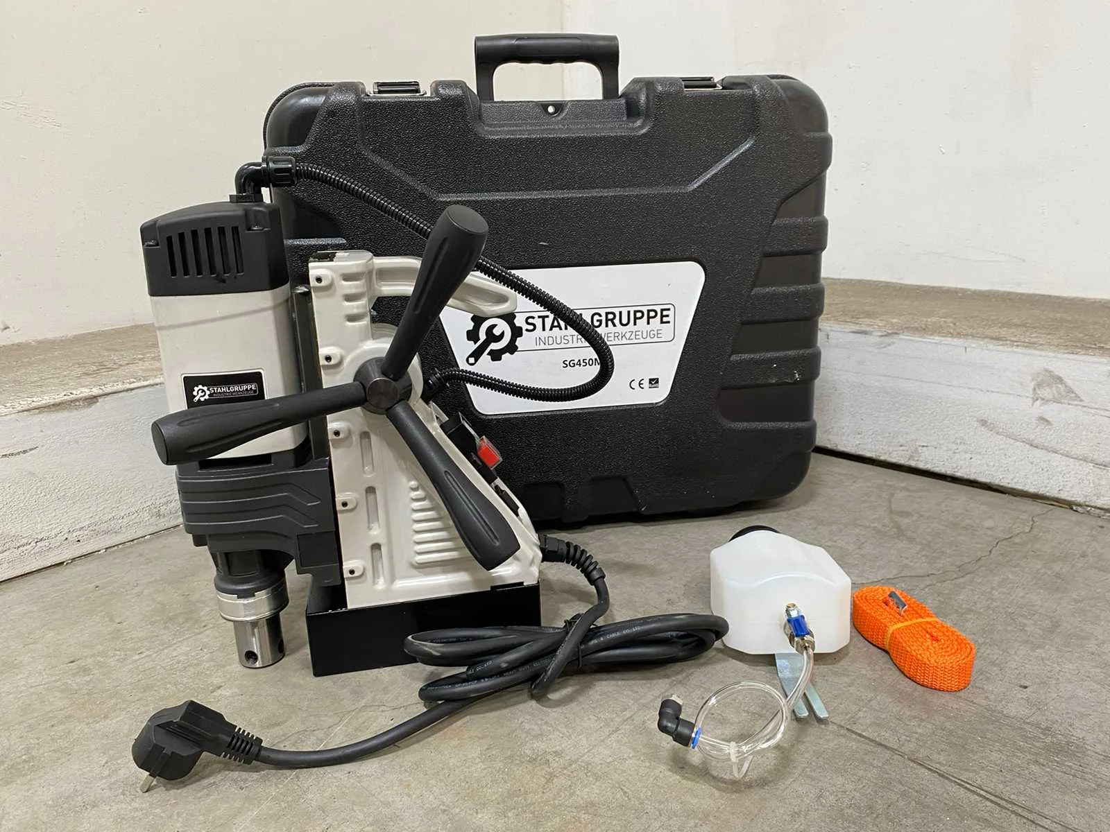 <ul> <li><b>magneetboormachine</b></li> <li><b>Merk:</b> Stahlgruppe</li> <li><b>Type:</b> SG450M</li> <li><b>max. boordiameter:</b> 35 mm boordiameter</li> <li><b>vermogen:</b> 1600 watt</li> <li><b>aansluiting:</b> 230 volt</li> <li><b>magneetsterkte:</b> 16000 newton</li> <li><b>toerental:</b> 810 toeren</li> <li><b>boordiepte:</b> 145 mm boordiepte</li> <li><b>inclusief:</b> oliereservoir voor koelen en smeren</li> <li><b>beveiliging:</b> riem voor valbeveiliging</li> <li><b>staat:</b> ongebruikt, in de originele verpakking</li> </ul> Nee Merk: Stahlgruppe Type: SG450M