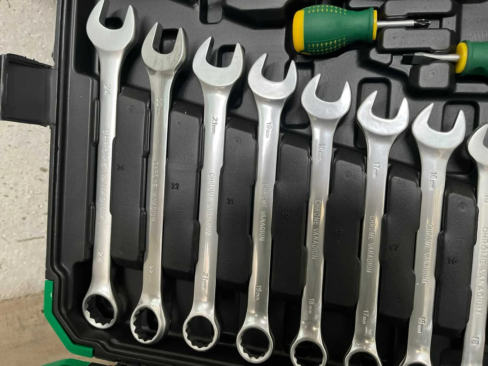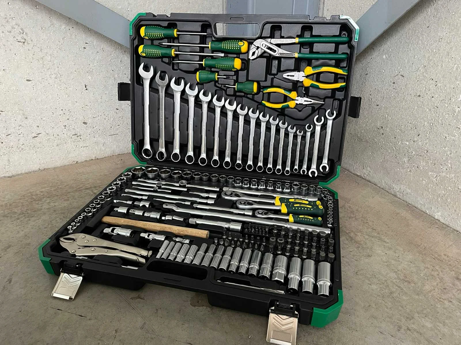 <ul> <li><strong>gereedschapsset:</strong> 180-delig</li> <li><strong>doppen:</strong> 1/4", 3/8", 1/2" (standaard, diep, E-profiel, bougie)</li> <li><strong>ratels:</strong> 1/4", 3/8", 1/2" met quick-release</li> <li><strong>ringsleutels:</strong> 8–22 mm</li> <li><strong>bits:</strong> Torx, PH, PZ, SL, Hex (kort & lang)</li> <li><strong>tangen:</strong> combinatietang, telefoontang, waterpomptang</li> <li><strong>toebehoren:</strong> verlengstukken, scharnieren, schroevendraaiers, hamer</li> <li><strong>koffer:</strong> slagvaste ABS opbergkoffer</li> <li><strong>staat:</strong> ongebruikt, in originele verpakking</li> </ul> Nee Merk: Stahlgruppe
