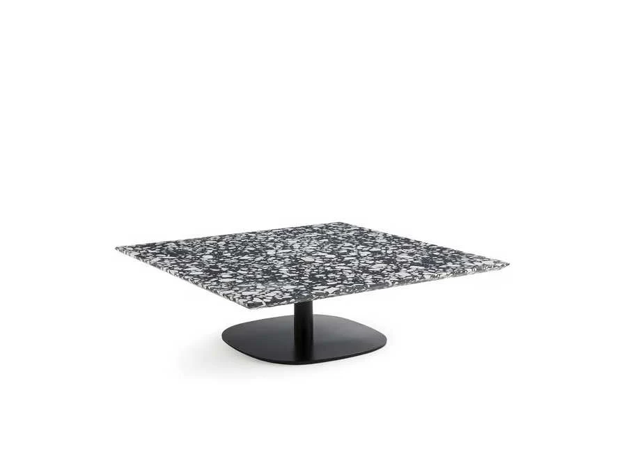 • MDF blad bekleed met zwarte en witte Terrazzo steen. Elk stuk is uniek, het algehele uiterlijk van het blad kan van het ene blad tot het andere verschillen, alle stenen verschillen in hun afmetingen en tinten. Deze verschillen geven de tafel al zijn schoonheid en uniciteit. • Afgeschuinde randafwerking • Centrale poot in zwart gelakt staal met epoxy afwerking Grootte • Breedte: 110 cm • Hoogte: 34 cm • Diepte: 110 cm Non