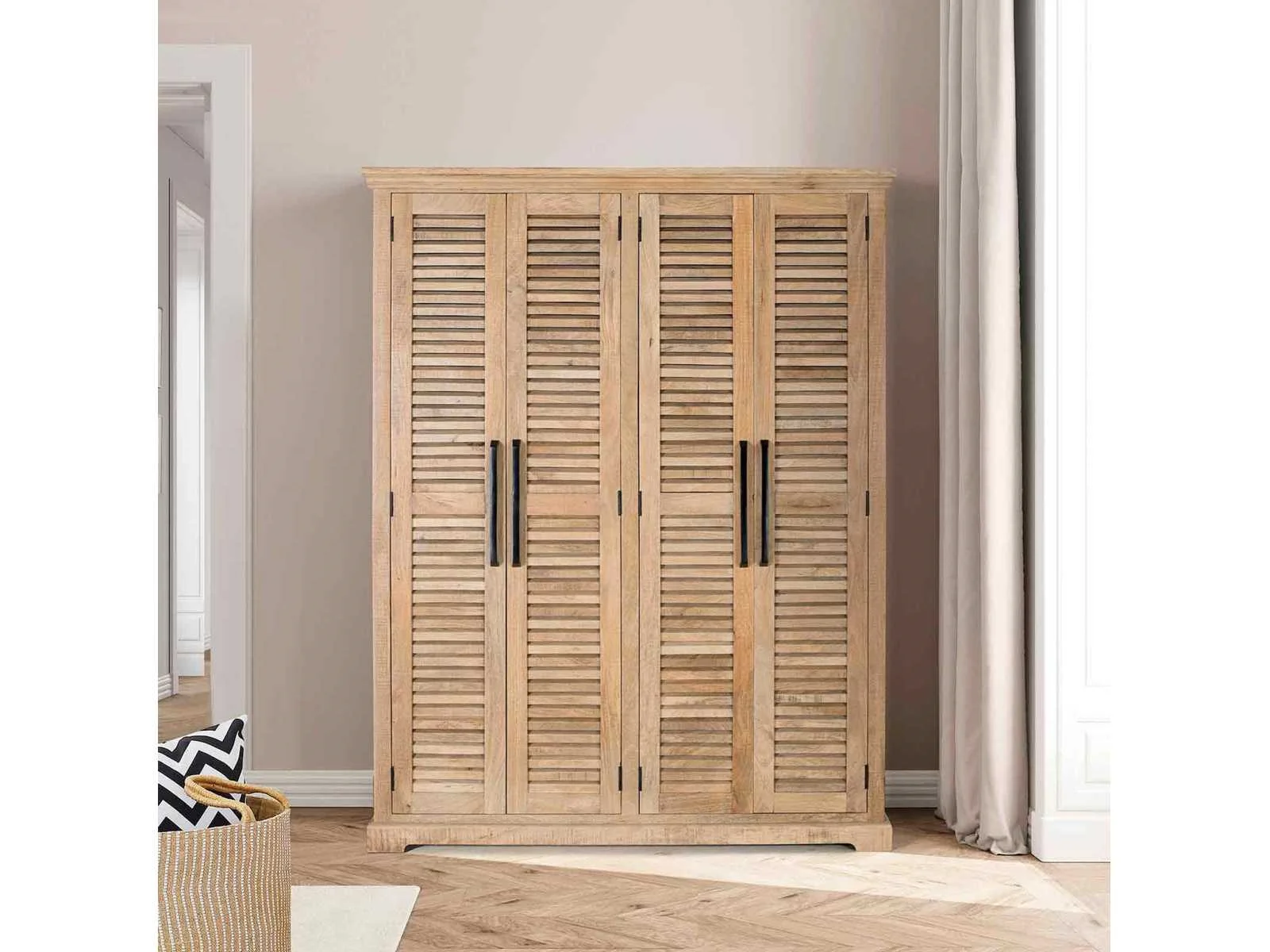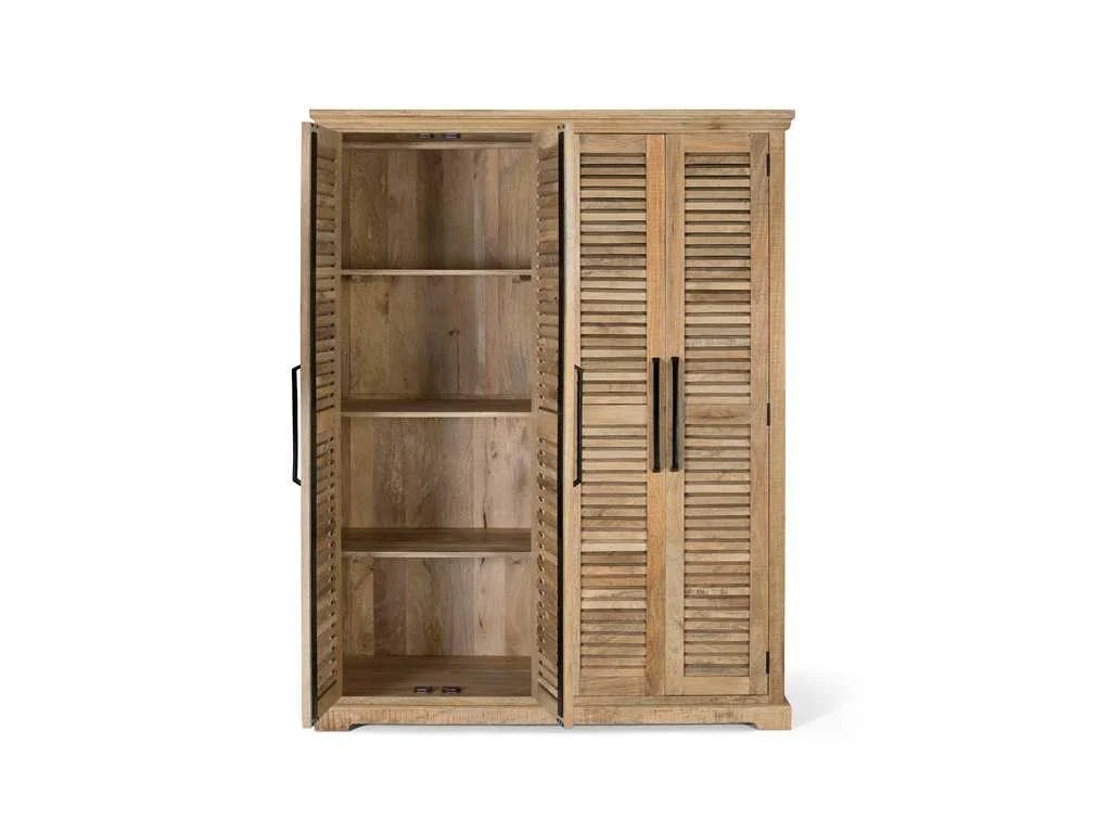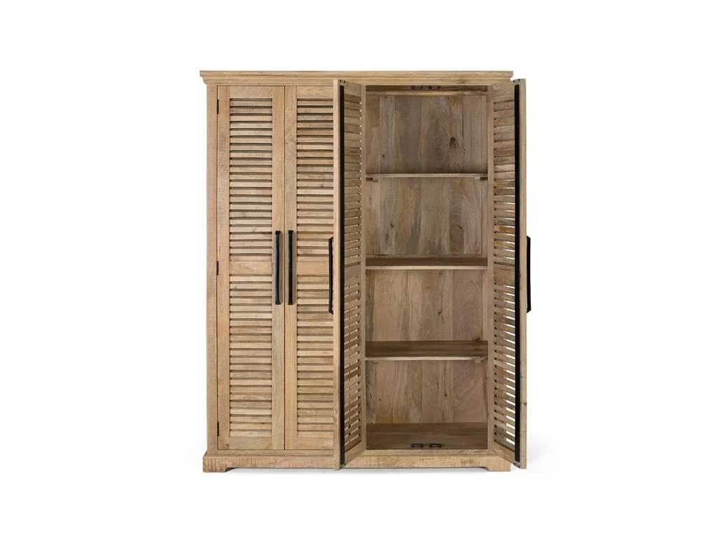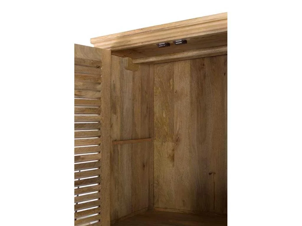 Deze imposante massief mangohouten kast biedt royale opbergruimte met zijn 4 deuren, ophangstangen aan beide zijden en verstelbare boven- en onderplanken. Het gebruikte natuurlijke hout kan knoesten en een originele nerf hebben, wat een vleugje authenticiteit aan het stuk toevoegt. Met een hoogte van 190 cm, een lengte van 150 cm en een breedte van 50 cm biedt deze kast zowel functionaliteit als esthetiek. Met een gewicht van 108 kg is hij zorgvuldig verpakt in een doos met afmetingen 195x155x55 cm, klaar voor gebruik zonder dat montage nodig is. HEEL BELANGRIJK! GEASSEMBLEERD PRODUCT! Voordat u overgaat tot de aankoop, raden wij u ten zeerste aan om de afmetingen van de ingangen van uw huis of kamer te controleren, evenals de beschikbare ruimte in het trappenhuis en de grootte van de lift, indien van toepassing. Dit zorgt ervoor dat de geselecteerde meubels probleemloos kunnen worden vervoerd en geïnstalleerd. Uw samenwerking is essentieel voor een bevredigende winkelervaring! Omdat het een natuurlijk en handgemaakt houten meubelstuk is, kan het zijn originele knoesten en aders behouden en kan het daarom verschillen hebben als het gaat om kleur. Volledige productomschrijving weergeven Afmetingen en gewicht Diepte 50 cm Hoogte 190 cm Lengte 150 cm Natuurlijke mangohouten kast Kenmerken In elkaar zetten Geassembleerd geleverd Hoofdkleur Beige Gemaakt in India Hoofd materiaal Hout Structuur materiaal Mango Madeira Non