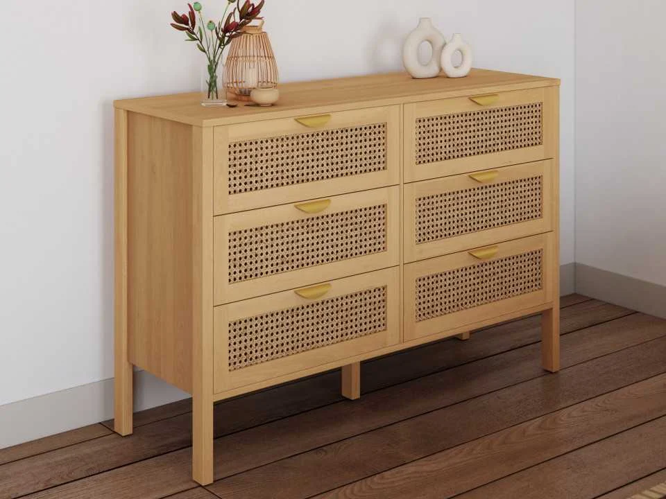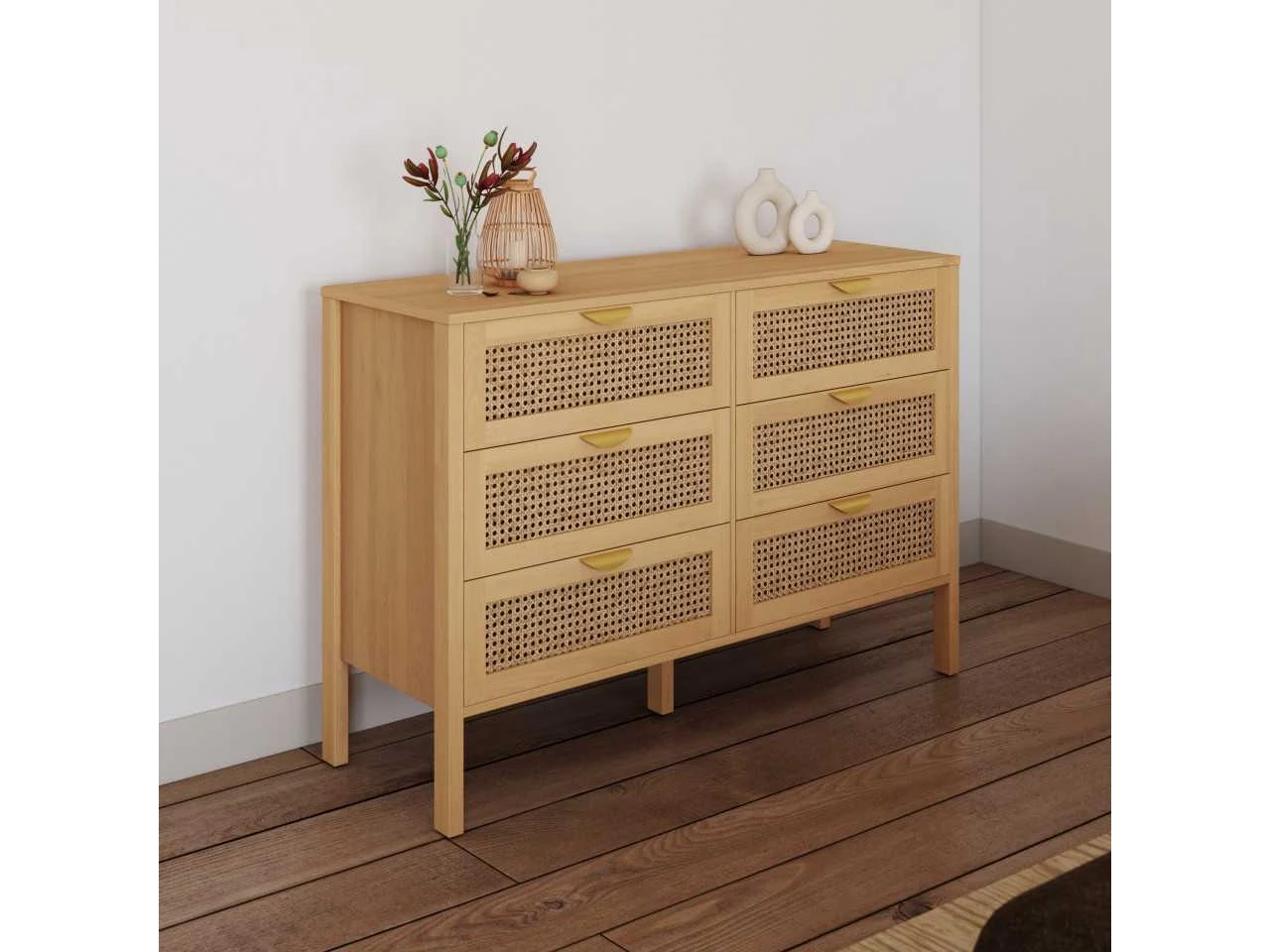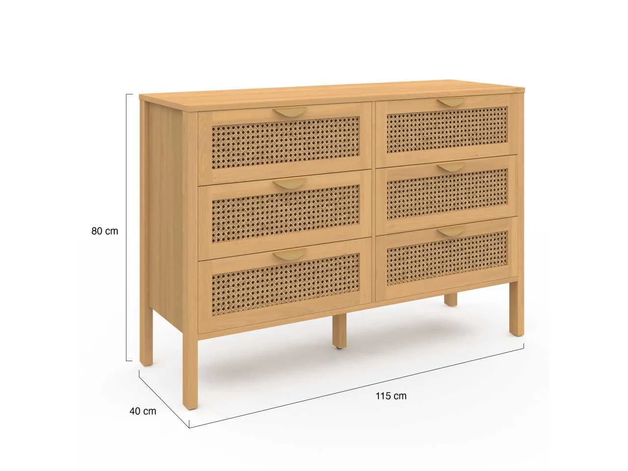 Totale afmetingen: (L) 115 x (B) 40 x (H) 80 cm Afmetingen lade: 54 x 19,5 cm Afmetingen van de binnenkant van de lades: 49,5 x 28,5 x 17,5 cm Breedte ladeframe: 40 mm Hoogte poten: 17,5 cm Afmetingen van de poten (structuur): 2,5 x 4 cm Materialen: 15 mm en 12 mm houtdeeltjes + MDF Capaciteit: 30 kg Kleur: Hout / naturel Zelf in elkaar zetten: ja Hardware inbegrepen: ja Non