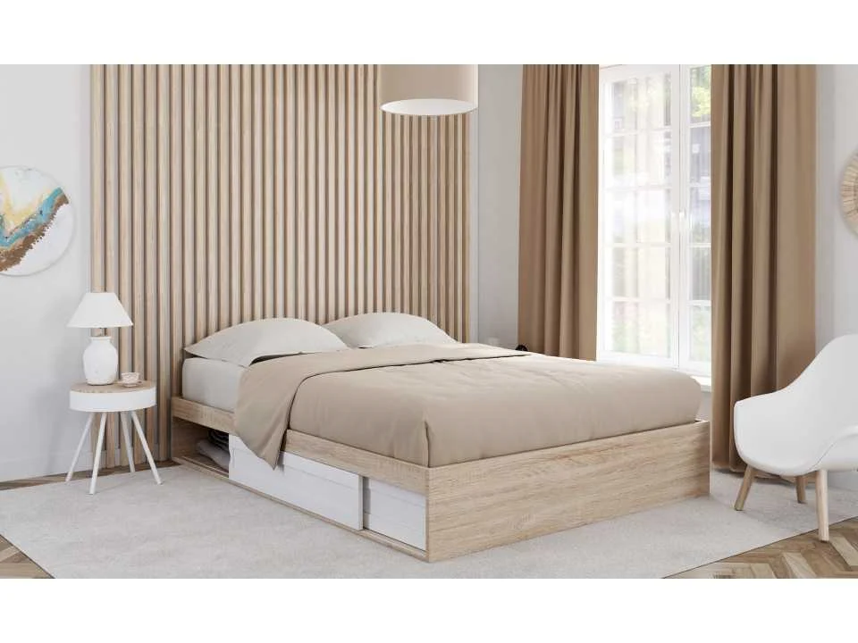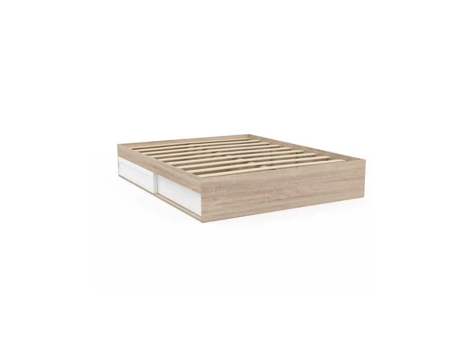 Technische beschrijving Materialen: 18 mm Spaanplaat en polywood Breedte van de lamellen: 6 cm Dikte van de lamellen: 1 cm Hoogte lade: 17,50 cm (2 lades) Model 160 x 200 cm Totale afmetingen: (L) 205 x (B) 165 x (H) 30 cm Afmetingen binnenkant lade: 99,50 x 63 x 22,50 cm Aantal lamellen: 10 stuks Non