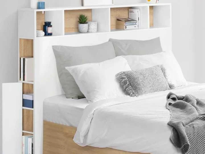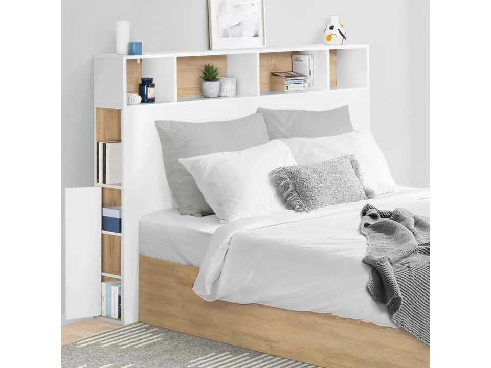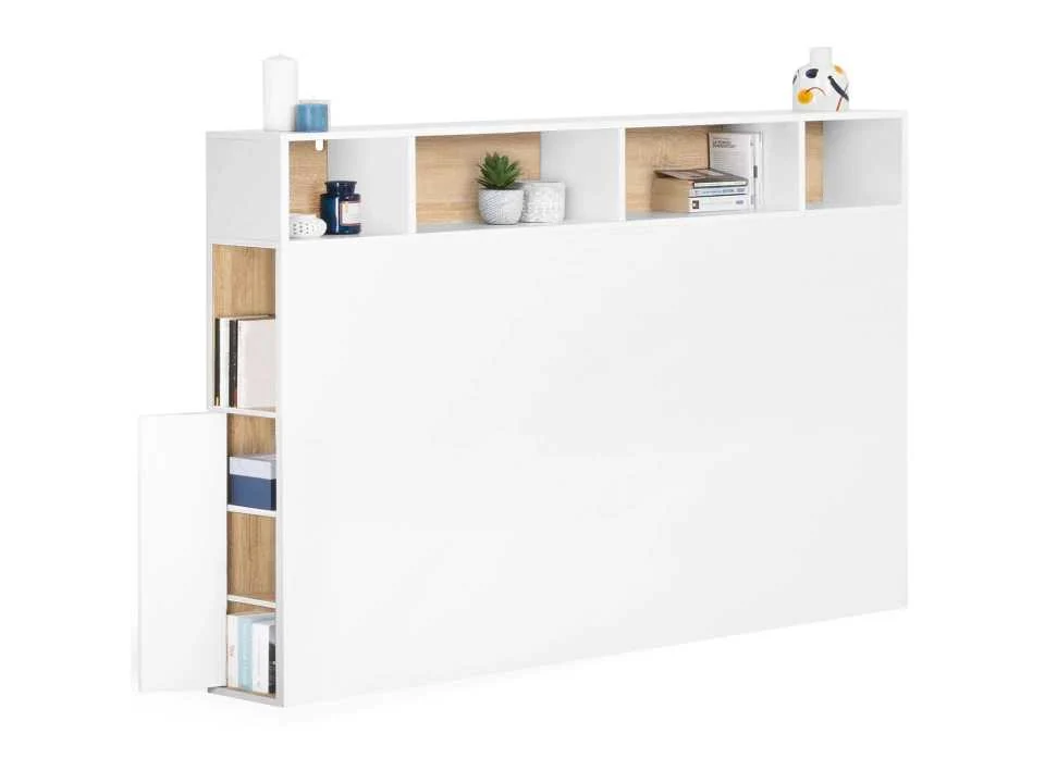 Afmetingen hoofdeinde 165 cm met opbergruimte Algemene afmetingen: Lengte 165 cm x Breedte 20 cm x Hoogte 120 cm Afmetingen grote voornis: L. 51 x B. 20 x H. 21 cm Afmetingen kleine voornis: L. 27,75 x B. 20 x H. 21 cm Afmetingen zijnis: L. 17 x B. 25 x H. 21,5 cm Deur met klikopening + 1 binnenplank Afmetingen deur: L. 17 x B. 25 x H. 71,5 cm Materiaal: PB 15 mm Kleuren: wit en beuken Zelf in elkaar zetten Non