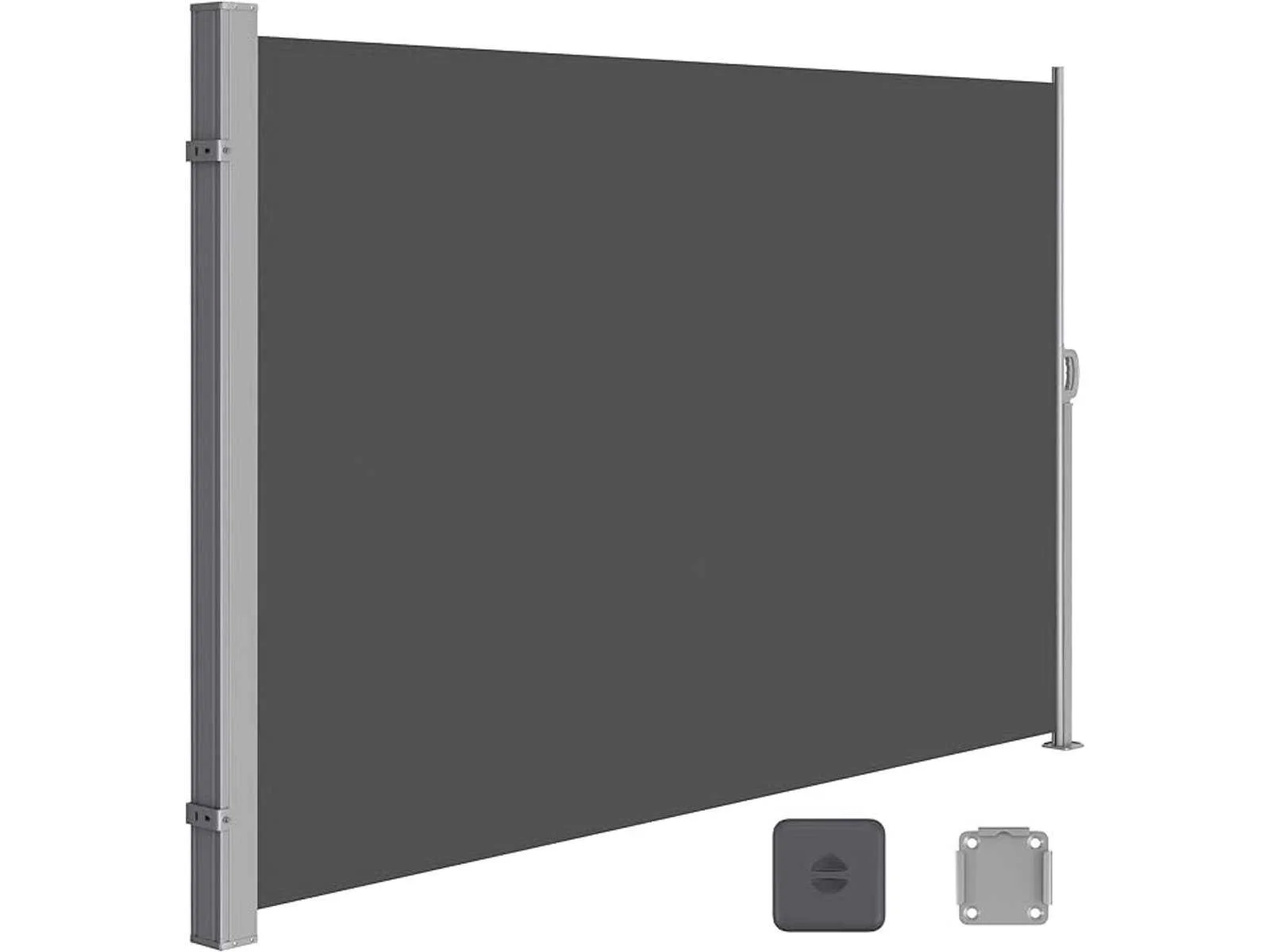 Specificaties: Materiaal: gelegeerd staal en polyester Kleur: antraciet Afmetingen: 180 x 350 cm Gewicht: 9kg Voordelen: ? Spat- en UV-bestendig (UPF 50+) ? Zwaar staal met roestbestendige schroeven ? Geruisloos uitschuifbaar met veermechanisme ? Eenvoudige installatie, inclusief basisbeugel ? Met kinderslot op het handvat Non