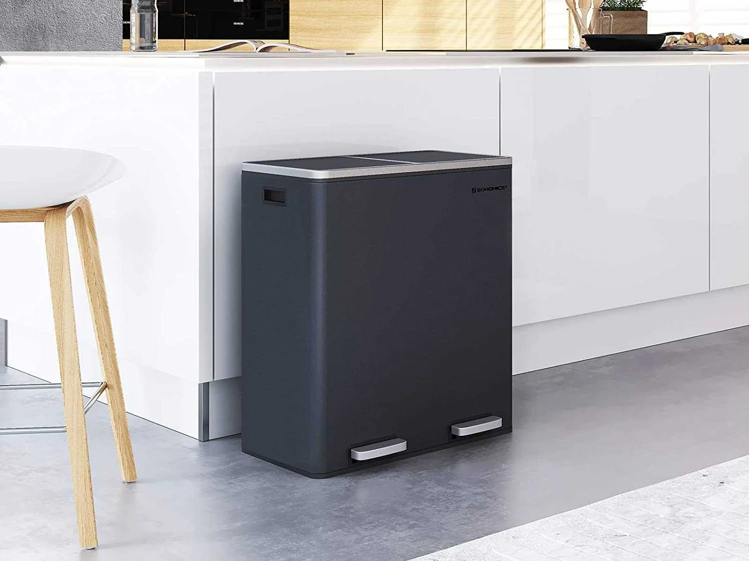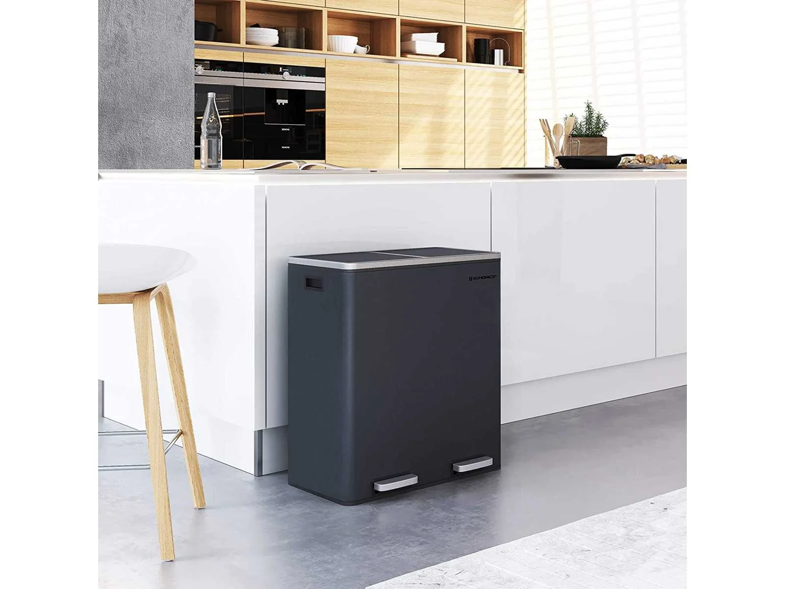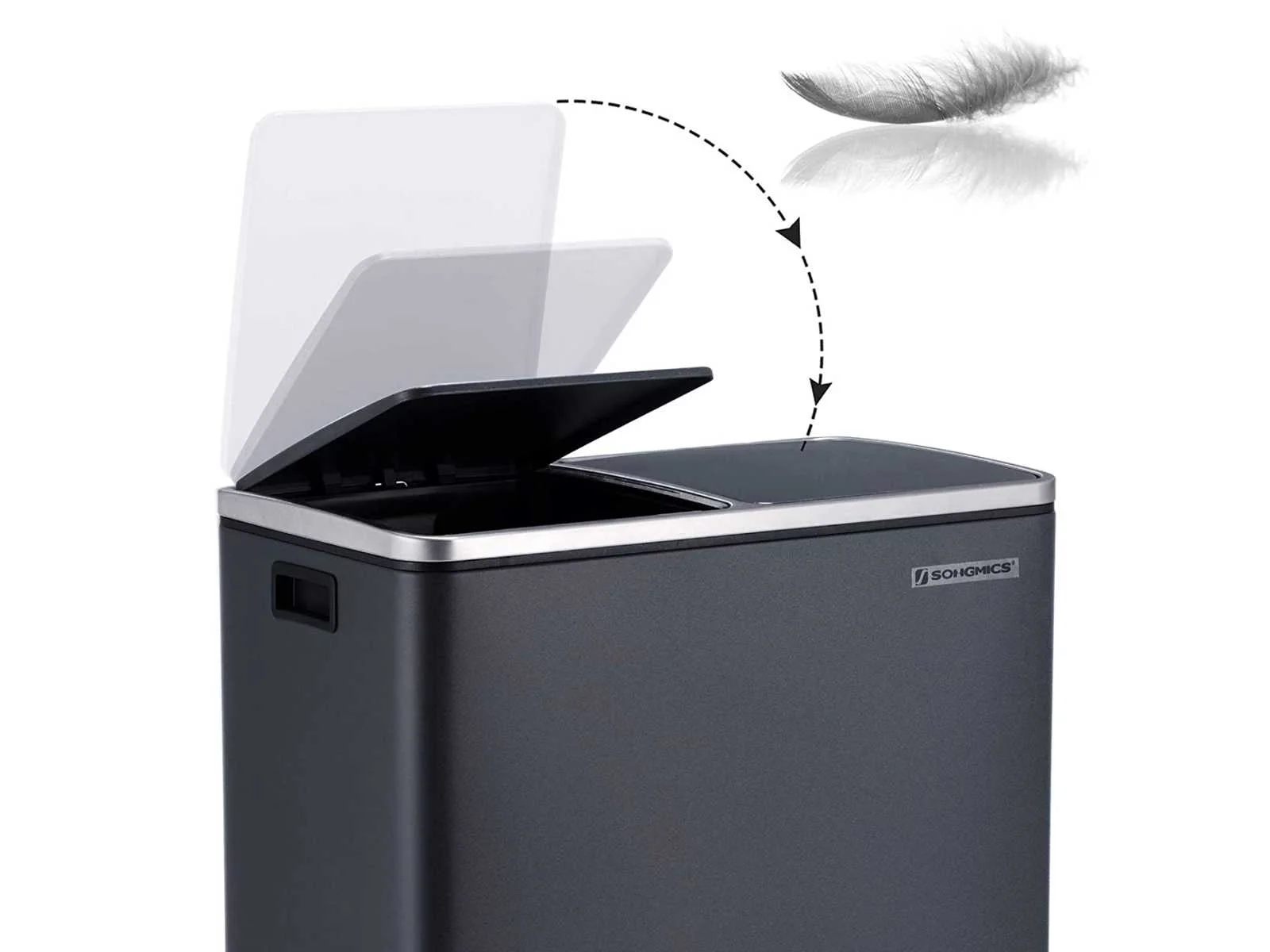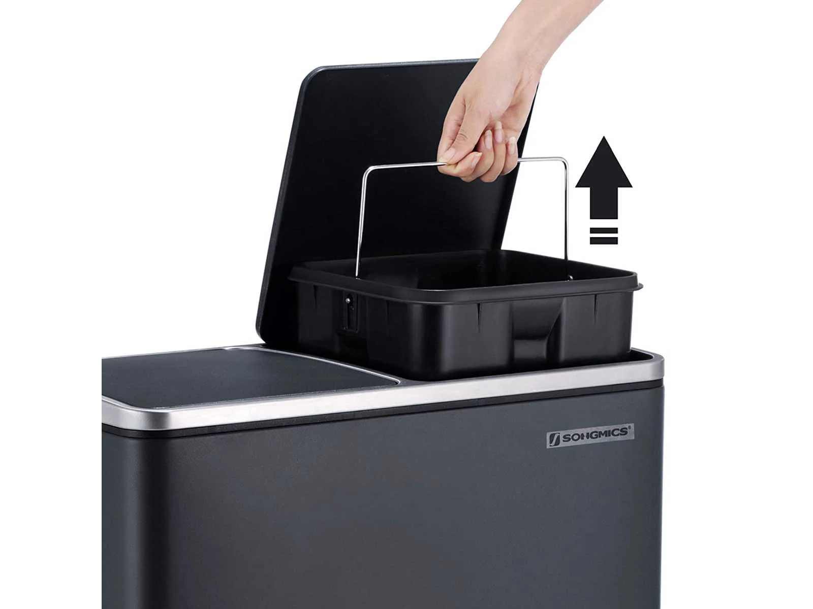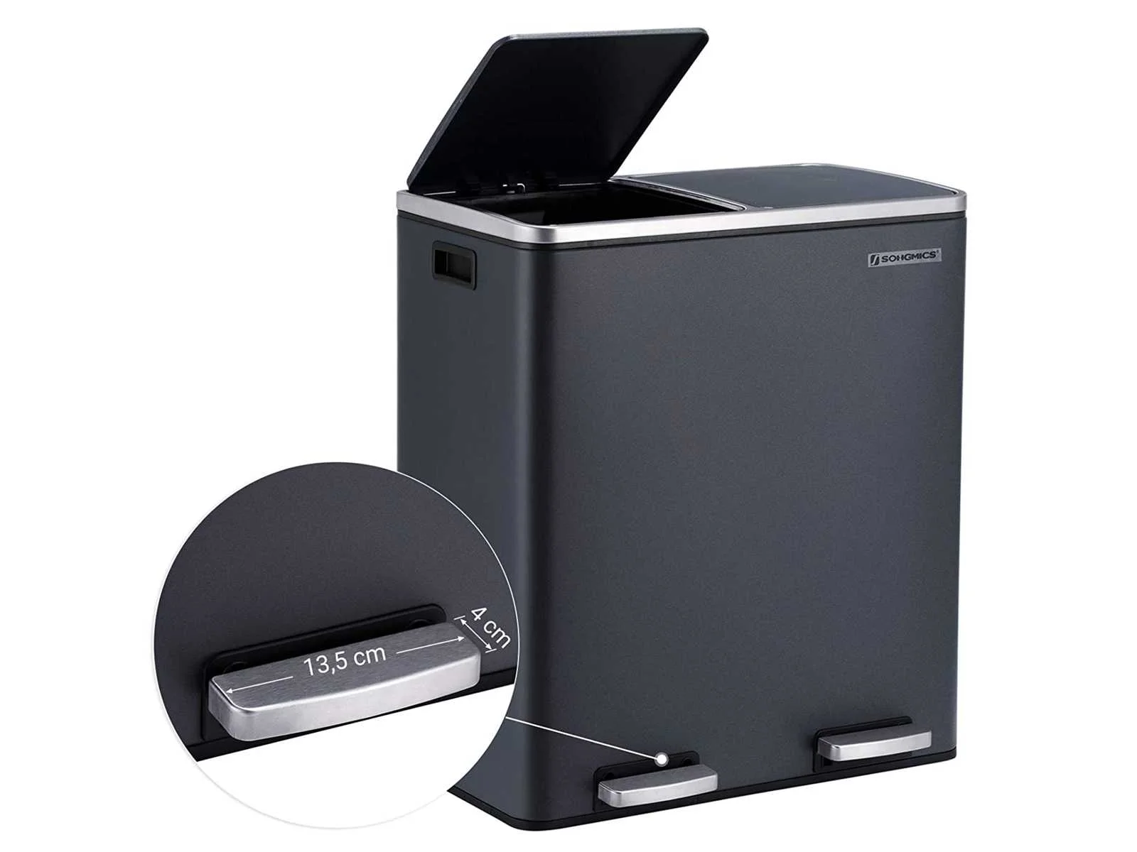 Kenmerken: Kleur: Antracietgrijs Materialen: Elektrostatisch gepoedercoate stalen bak, ABS kunststof deksels, polypropyleen kunststof binnenemmers Afmetingen product: 58,6 x 32 x 65 cm (L x B x H) Afmetingen van een emmer: 27 x 27 x 58,5 cm (L x B x H) Totale afmeting met deksel open: 94 cm Gewicht: 9,1 kg Non