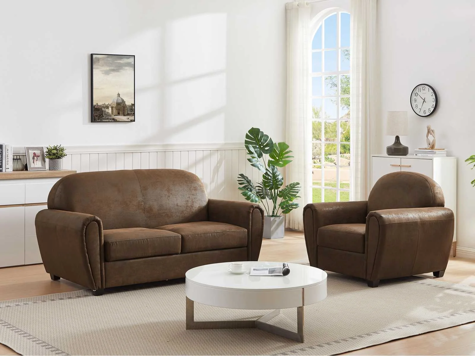Kenmerken Kleur (schaduw): Kastanje Zaak: 100% polyester, microvezel Materiaal (basis): Eucalyptus Structuur: Hout, Multiplex Afwerking: Verouderd Soort model: Club Aantal plaatsen: 3 zitplaatsen Bekleding zitting: Polyurethaanschuim Dichtheid zitting: 23 kg/m³ Zadel vering: Nosag-veren, kruisende elastische banden, spiraalveren Bekleding rugleuning: Polyurethaanschuim Dichtheid rugleuning: 23 kg/m³ Opschorting van het dossier: Gekruiste elastische bandjes Met armleuningen Maximale ondersteunde belasting: 360 kg Gemonteerd geleverd (behalve voeten en/of handgrepen) Grootte Lengte: 170 cm Hoogte: 89 cm Diepte: 91 cm Hoogte poot: 7 cm Zithoogte: 45 cm Diepte zitting: 56 cm Non