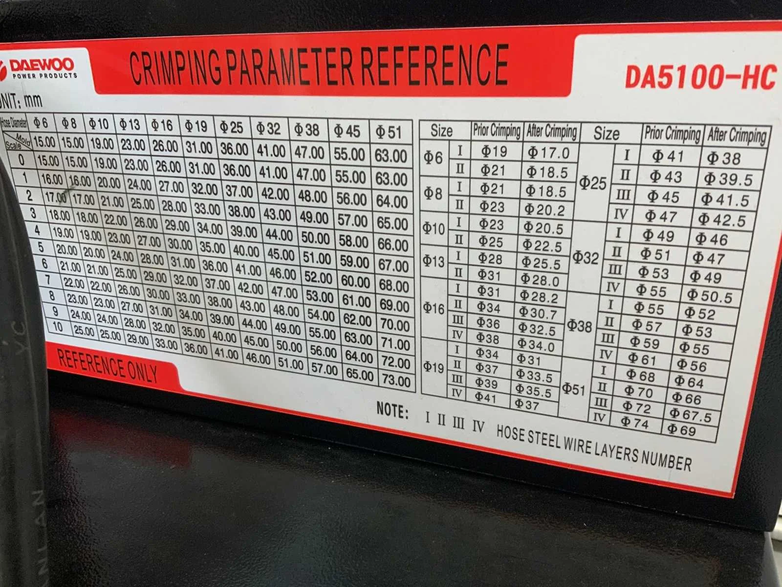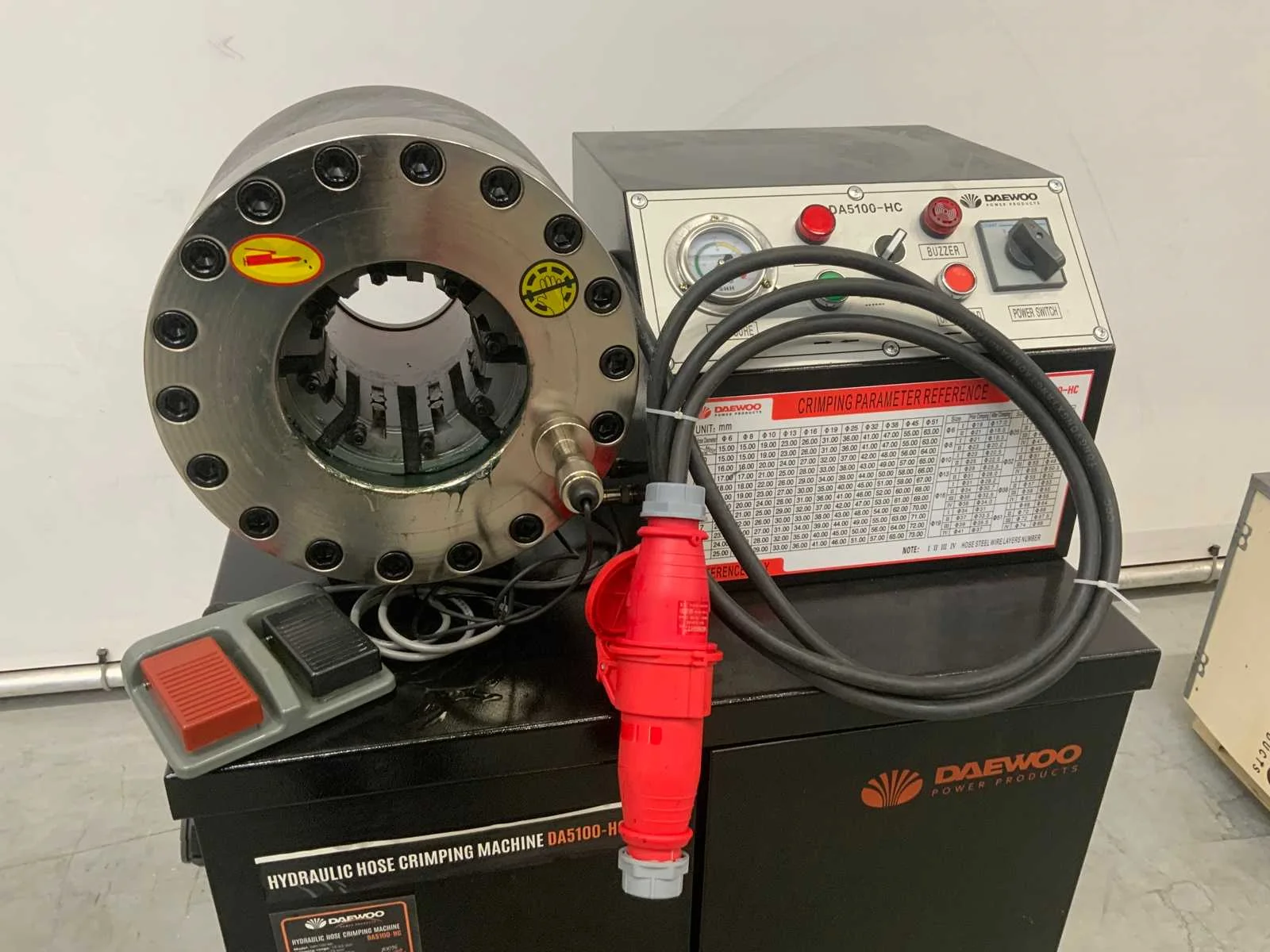 Crimping range 15-63mm; max opening 75mm; pressure 53,5 Mpa; kracht 500 T; 3000W; 380V; 5585 Nee Merk: Daewoo Type: DA5100-HC Eigen gewicht: 280kg Totale afmeting L: 770mm Totale afmeting Breedte: 530mm Totale afmeting Hoogte: 1320mm