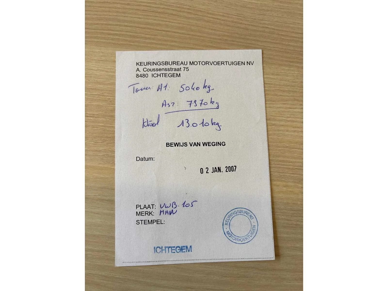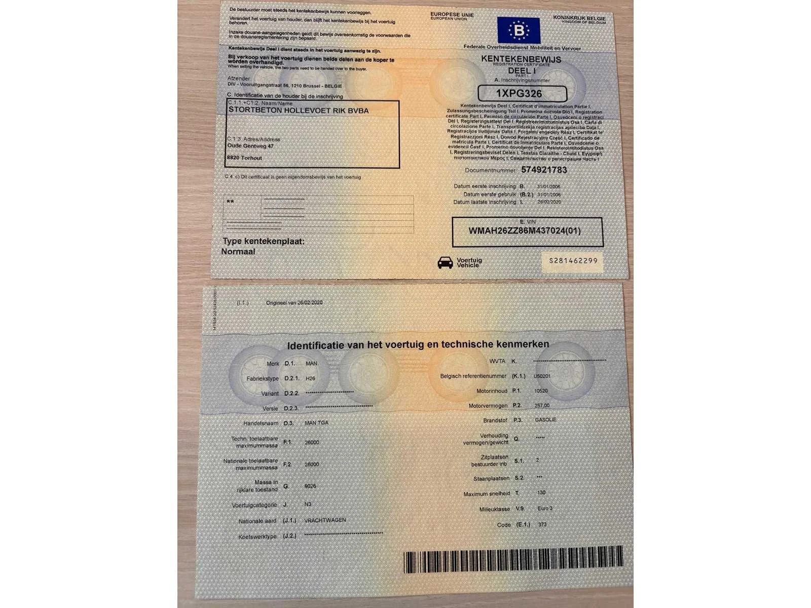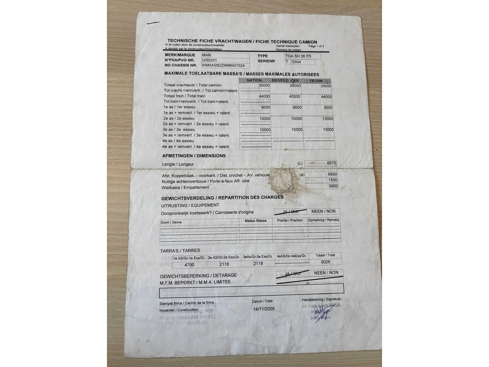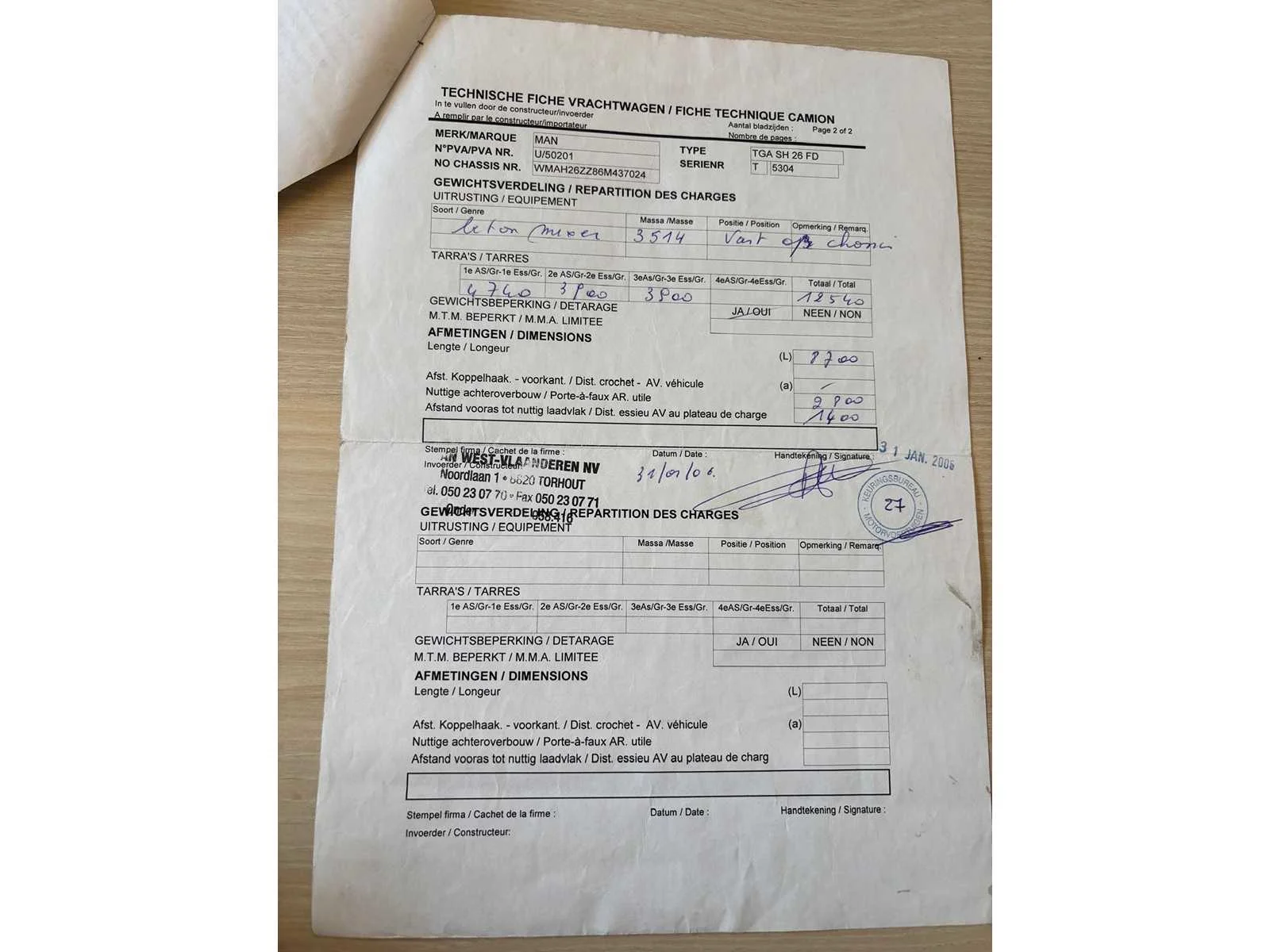 Nee Merk: MAN Type: TGA 33.350 Bouwjaar: 2006 Chassisnummer VIN: WMAH26ZZ86M437024 Kilometerstand bij opname: 401157km Aantal assen: 3 Fuel Type: Diesel Laadvermogen: 12760kg Aantal sleutels: 2 Eigen gewicht: 13010kg Startinformatie: Start zonder problemen Afgelezen kilometerstand: 401157km Nationaliteit documenten: België Kentekenpapieren compleet?: true Aantal zitplaatsen: 2 Zelf rijdend exporteren: Mogelijk Handgeschakelde versnellingsbak: true Diesel: true