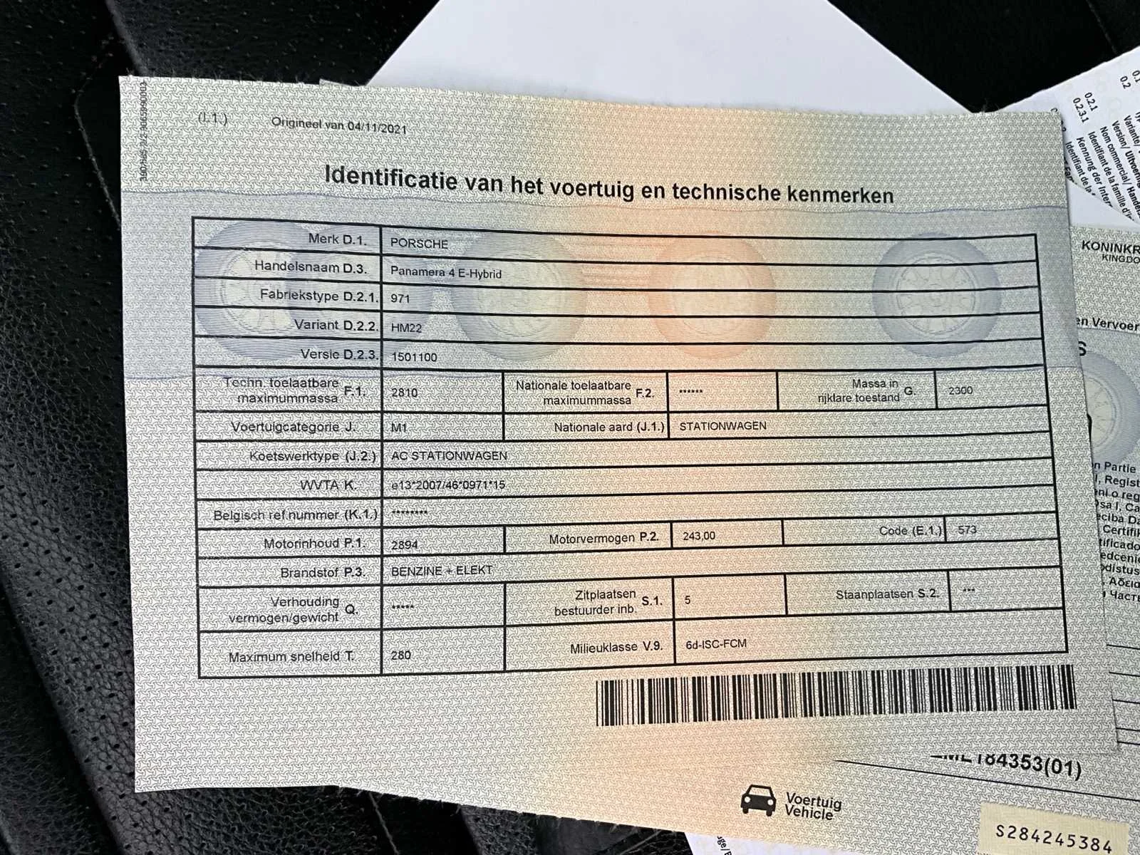 No Merk: Porsche Model: Panamera e-hybrid Bouwjaar: 2021 Afgelezen kilometerstand: 76695km Cilinderinhoud: 2894cc Vermogen (kW): 243kW Brandstof: Benzine + elektrisch Chassisnummer: WP0ZZZ97ZML184353 Datum eerste toelating: 04/11/2021 Transmissie: Automaat Nationaliteit documenten: Belgisch Start en rijdt: Ja Inschrijvingsbewijs - deel 1 : Aanwezig Inschrijvingsbewijs - deel 2: Aanwezig
