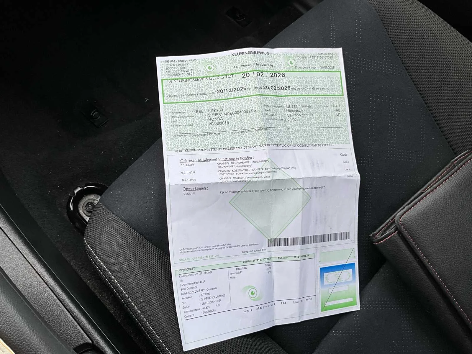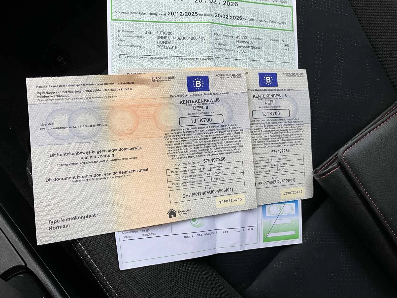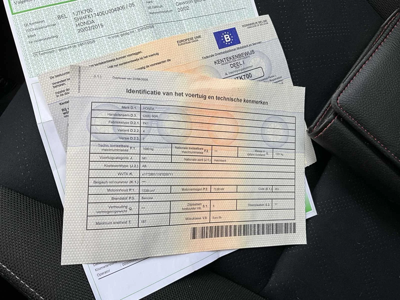 No Merk: Honda Model: Civic Bouwjaar: 2015 Afgelezen kilometerstand: 50117km Cilinderinhoud: 1339cc Vermogen (kW): 73kW Brandstof: Benzine Chassisnummer: SHHFK1740EU004906 Datum eerste toelating: 20/02/2015 Transmissie: Handgeschakeld Nationaliteit documenten: Belgisch Start en rijdt: Ja Inschrijvingsbewijs - deel 1 : Aanwezig Inschrijvingsbewijs - deel 2: Aanwezig