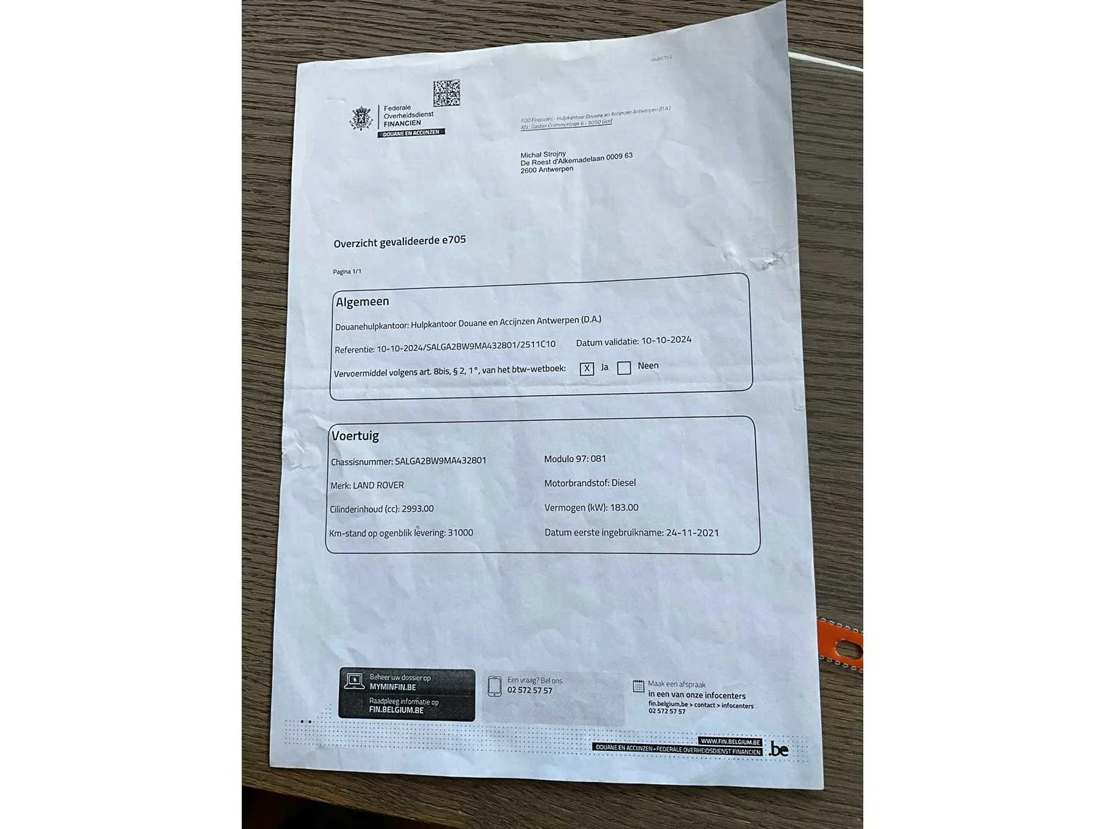 De wagen start, rijdt en draait soepel. Schakelt goed. De wagen heeft enkele elektrische storingen waaronder abs en storing ophanging. De wagen werd reeds gedouaneerd in België. Nee Merk: Range Rover Model: Vogue Bouwjaar: 2021 Afgelezen kilometerstand: 27744km Cilinderinhoud: 2993cc Vermogen (kW): 183kW Brandstof: diesel Chassisnummer: SALGA2BW9MA432801 Datum eerste toelating: 24/11/2021 Transmissie: Automaat Aantal sleutels: 1 Nationaliteit documenten: Belgisch Start en rijdt: Ja startinformatie : Start en rijdt Inschrijvingsbewijs - deel 1 : Aanwezig Inschrijvingsbewijs - deel 2: Aanwezig