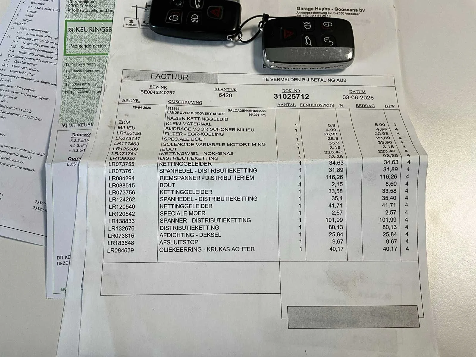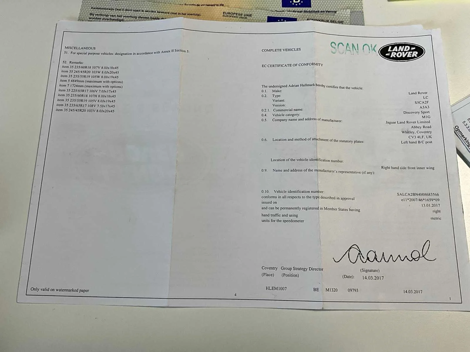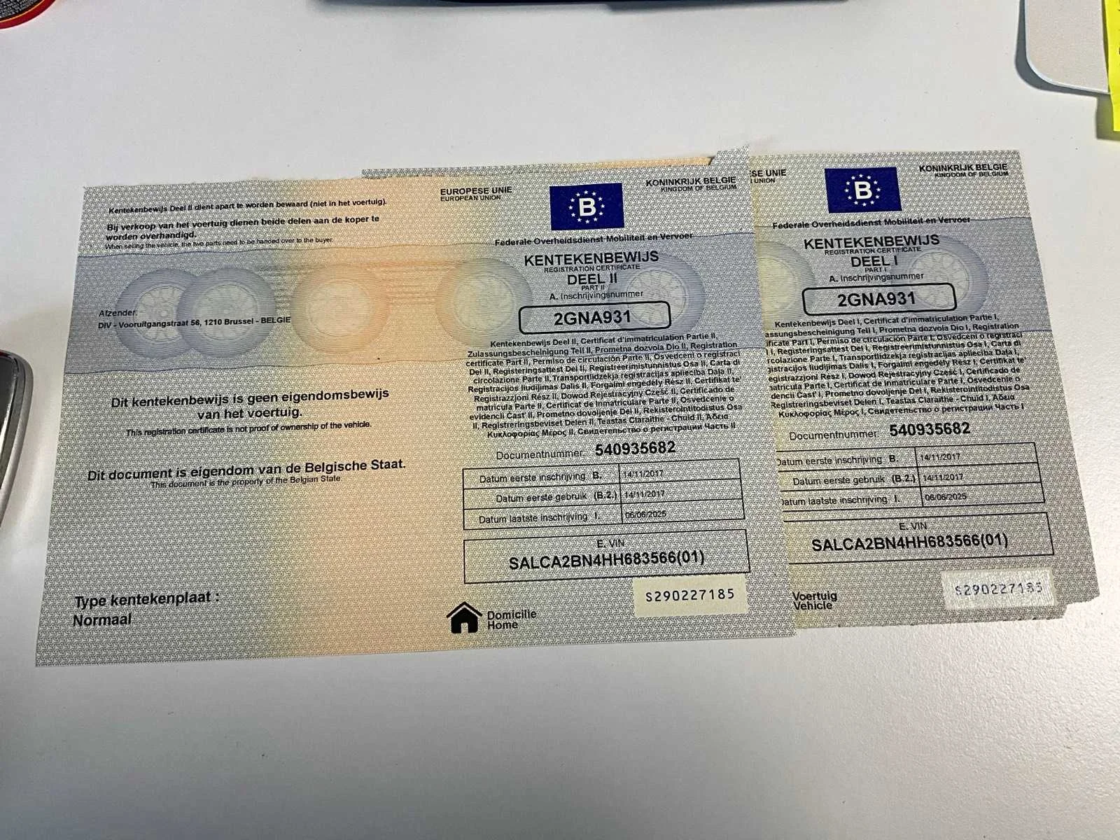 De wagen werd volledig in orde gezet (zie factuur). De wagen start,rijdt en draait soepel. Nee Merk: Land Rover Model: Discovery sport Bouwjaar: 2017 Afgelezen kilometerstand: 99716km Cilinderinhoud: 1999cc Vermogen (kW): 110kW Brandstof: diesel Chassisnummer: SALCA2BN4HH683566 Datum eerste toelating: 14/11/2017 Transmissie: Automaat Nationaliteit documenten: Belgisch Start en rijdt: Ja startinformatie : Start en rijdt Inschrijvingsbewijs - deel 1 : Aanwezig Inschrijvingsbewijs - deel 2: Aanwezig