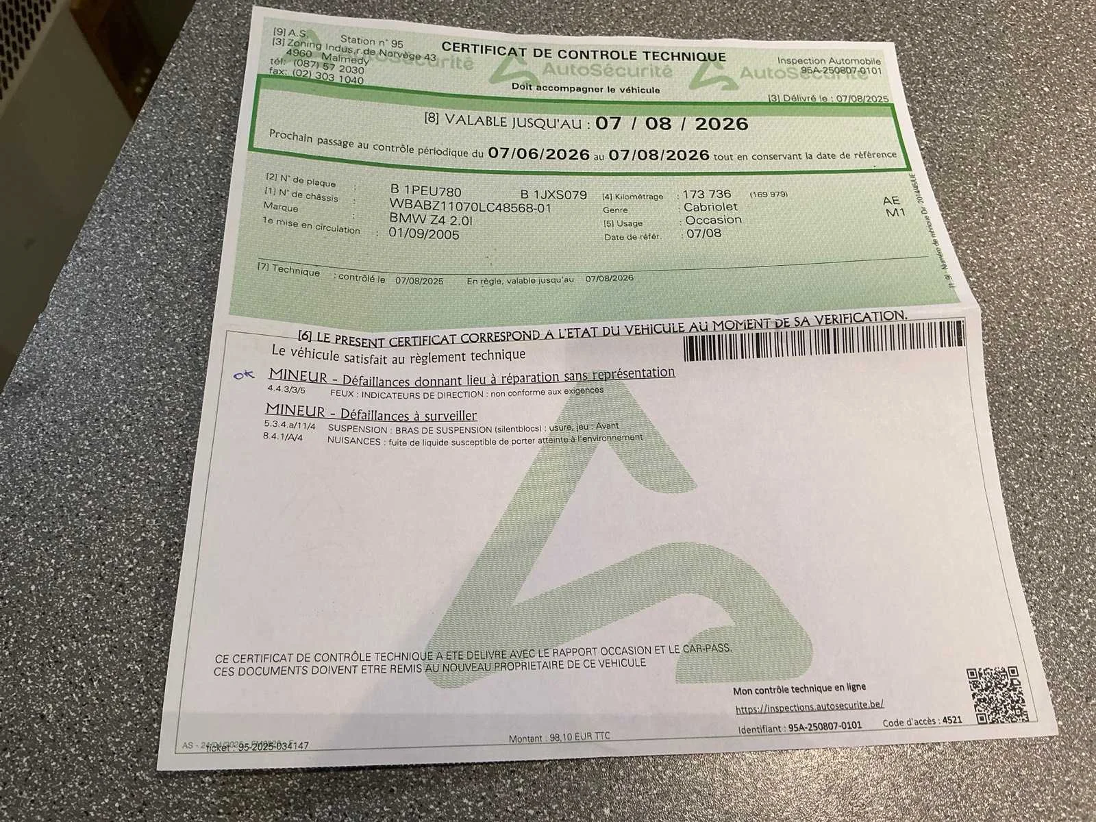 Elektrische ruiten, airco, leder interieur, centrale vergrendeling, 2 sleutels met afstandsbediening, alu velgen en mistlampen. Nee Merk: BMW Model: Z4 2.0l Type: Cabriolet Bouwjaar: 2005 Afgelezen kilometerstand: 174498km Cilinderinhoud: 1995cc Vermogen (kW): 110kW Brandstof: benzine Chassisnummer: WBABZ11070LC48568(01) Laadvermogen: 1520kg Aantal zitplaatsen: 2 Kleur: Donker grijs met. Transmissie: Handgeschakeld Aantal deuren: 2 Aantal sleutels: 2 Nationaliteit documenten: België Inschrijvingsbewijs - deel 1 : Aanwezig Inschrijvingsbewijs - deel 2: Aanwezig