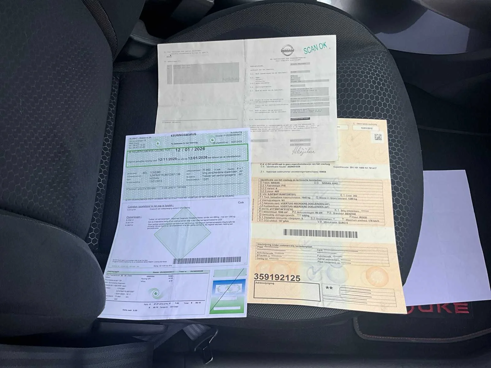 Nee Merk: Nissan Model: Juke Bouwjaar: 2012 Afgelezen kilometerstand: 29997km Cilinderinhoud: 1598cc Vermogen (kW): 86kW Brandstof: benzine Chassisnummer: SJNFBAF15U6072357 Datum eerste toelating: 12/01/2012 Aantal zitplaatsen: 5 Transmissie: Handgeschakeld Aantal deuren: 5 Aantal sleutels: 2 Carrosserie: Hatchback Nationaliteit documenten: BE Gelijkvormigheidsattest aanwezig: true Start en rijdt: JA Keuringsrapport geldig tot: 12/01/2026 Inschrijvingsbewijs - deel 1 : Aanwezig Inschrijvingsbewijs - deel 2: NVT