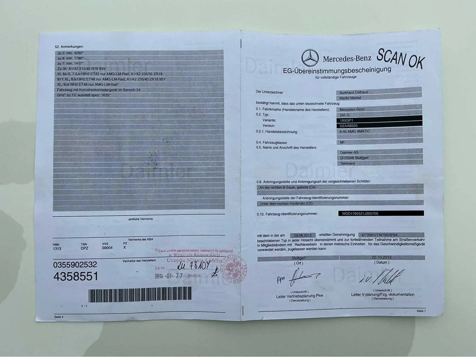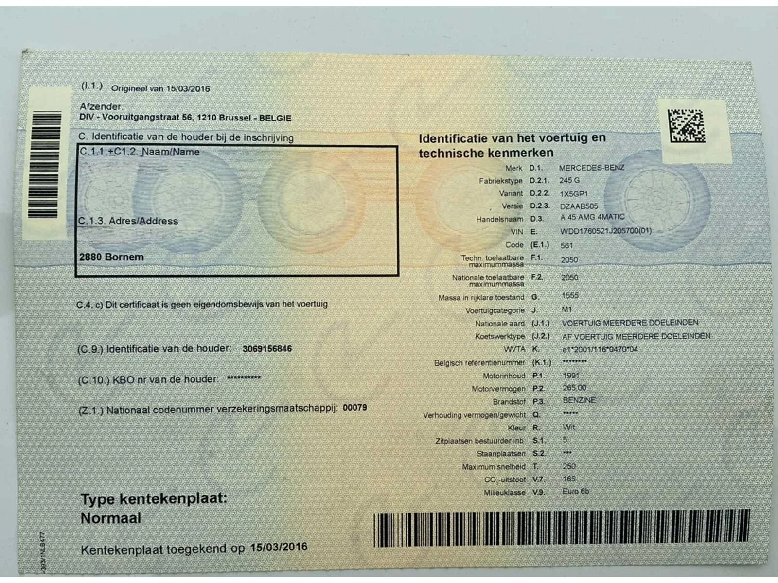 Mercedes-Benz A45 AMG 4MATIC uit 2016 met slechts 35000 kilometers op de teller! Full AMG. Bijzonder goed onderhouden wagen. Altijd binnen gestaan. Geen schade. Interieur als nieuw. 360PK en topsnelheid van 250km/u (begrensd). Vierwielaangedreven. Memory seats. Parkeersensoren. Nee Merk: Mercedes-Benz Model: A45 AMG 4MATIC Bouwjaar: 2016 Afgelezen kilometerstand: 35804km Cilinderinhoud: 1991cc Vermogen (kW): 265kW Brandstof: benzine Chassisnummer: WDD1760521J205700 Datum eerste toelating: 15/03/2016 Vermogen (pk): 360hp Kleur: Wit Transmissie: Automaat Emissieklasse: Euro 6b Aantal deuren: 5 Nationaliteit documenten: België Gelijkvormigheidsattest aanwezig: true Start en rijdt: Ja Vavato voert geen technische keuring uit.: true Airconditioning: true Navigatie: true Leder bekleed: true Vierwielaandrijving 4x4: true Inschrijvingsbewijs - deel 1 : Aanwezig Inschrijvingsbewijs - deel 2: Aanwezig