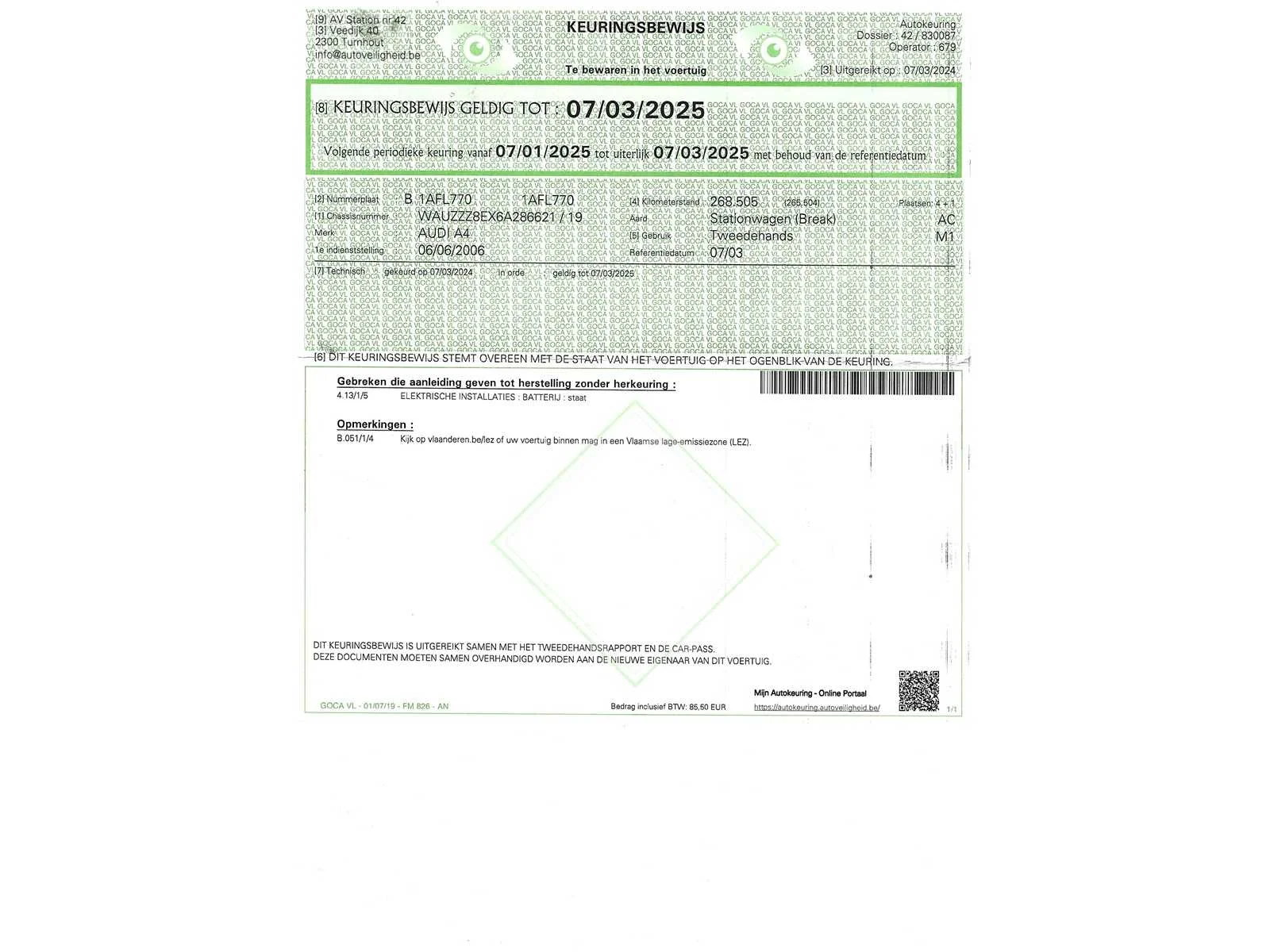 Nee Merk: Audi Model: A4 Type: S Bouwjaar: 2006 Afgelezen kilometerstand: 281396km Cilinderinhoud: 1968cc Vermogen (kW): 103kW Brandstof: DIESEL Chassisnummer: WAUZZZ8EX6A286621 Datum eerste toelating: 06/06/2006 Aantal zitplaatsen: 5 Maximaal trekgewicht ongeremd: 750kg Maximaal trekgewicht geremd: 1600kg Kleur: Zwart Transmissie: Automaat Aantal deuren: 5 Aantal sleutels: 1 Aantal cilinders: 4 Carrosserie: Break Nationaliteit documenten: BE Carpass: true Start en rijdt: NO Keuringsrapport geldig tot: 07/03/2025 No self drive export!: true Vavato voert geen technische keuring uit.: true Airconditioning: false Inschrijvingsbewijs - deel 1 : JA Inschrijvingsbewijs - deel 2: JA