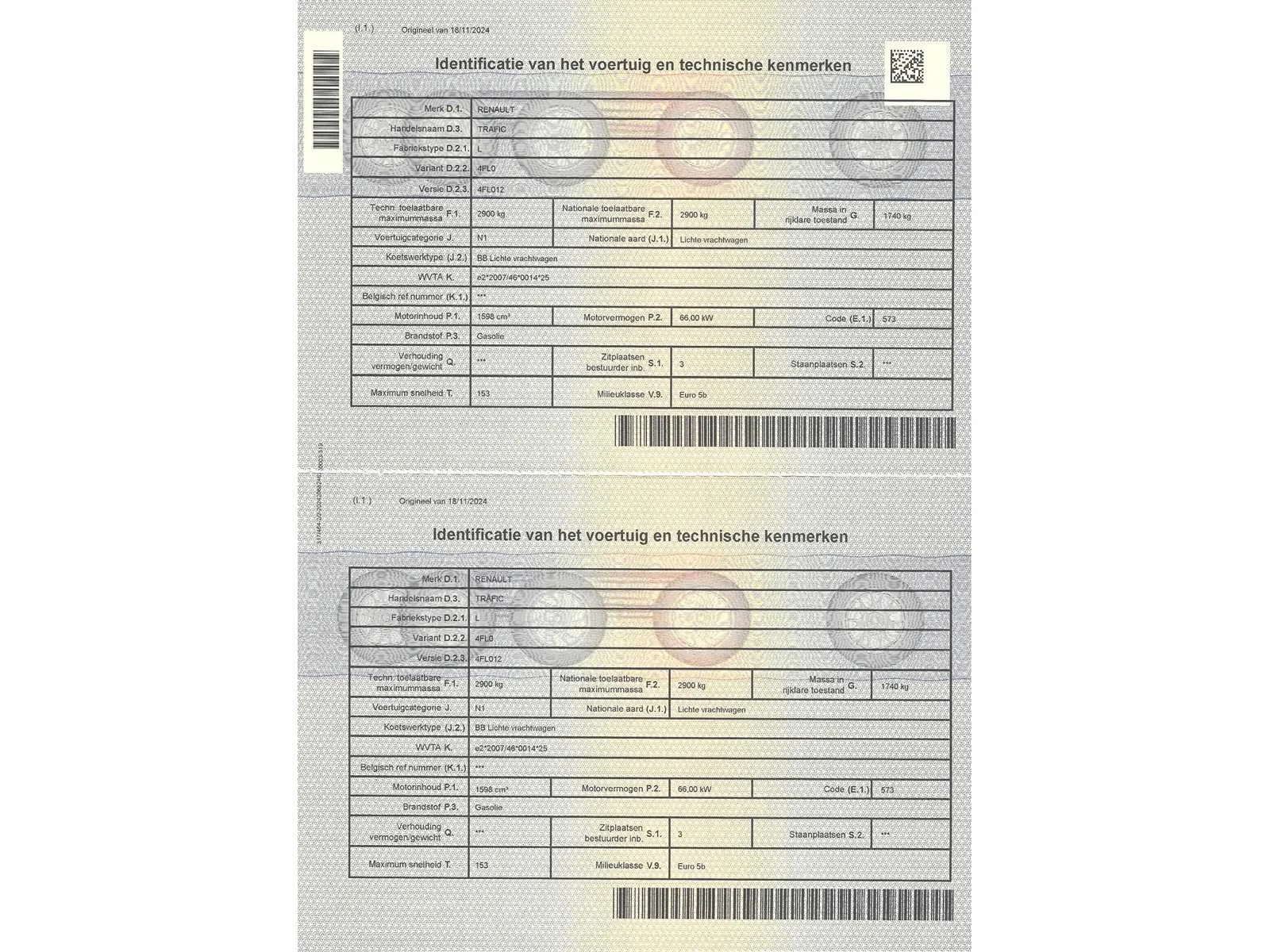 No Merk: Renault Model: Traffic Bouwjaar: 2016 Afgelezen kilometerstand: 103609km Cilinderinhoud: 1598cc Vermogen (kW): 66kW Brandstof: Diesel Chassisnummer: VF14FL01252886404 Datum eerste toelating: 13/06/2016 Aandrijving: Voorwiel Aantal zitplaatsen: 3 Maximaal trekgewicht ongeremd: 750kg Maximaal trekgewicht geremd: 2000kg Kleur: Zwart Transmissie: Manueel Emissieklasse: 5B Aantal deuren: 5 Aantal sleutels: 2 Aantal cilinders: 4 Nationaliteit documenten: BE Carfax Link: https://was.carfax.eu/v0/api/ccdid/5100016408/svc/201/vinreg/2GEQ187/checksum/eyJhbGciOiJIUzI1NiIsInR5cCI6IkpXVCJ9.eyJleHAiOjE3NjU2NzU5NjZ9.iljSp8DSn1-iIUnj5AtGa293ExuIhbO9h33qp0sfatc Gelijkvormigheidsattest aanwezig: true Carpass: true Start en rijdt: NEE Keuringsrapport geldig tot: 14/11/2025 No self drive export!: true Vavato voert geen technische keuring uit.: true Airconditioning: true Navigatie: true Inschrijvingsbewijs - deel 1 : JA Inschrijvingsbewijs - deel 2: JA