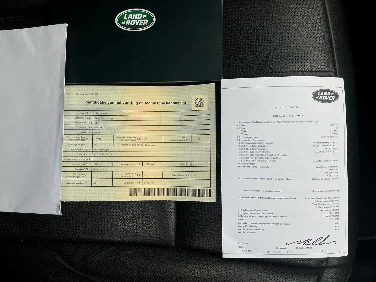 Deze Land Rover Range Rover Evoque R-Dynamic uit 2022 combineert luxe, sportiviteit en comfort in één stijlvolle SUV. Uitgevoerd in een zilveren metallic kleur met zwart dak en voorzien van het R-Dynamic sportpakket, straalt deze Evoque kracht en elegantie uit. De auto beschikt over 20” zwarte lichtmetalen velgen, LED-koplampen en een modern interieur met lederen bekleding en hoogwaardige afwerking. Dankzij de automatische transmissie, krachtige motor met hybride techniek biedt hij een soepele en betrouwbare rijervaring onder alle omstandigheden. Verder is de wagen uitgerust met navigatie, achteruitrijcamera, verwarmde stoelen, keyless entry, een Meridian audiosysteem en nog zoveel meer. Een perfecte keuze voor wie design, prestaties en comfort wil combineren in een premium SUV. Nee Merk: Land Rover Model: Range Rover Evoque Bouwjaar: 2022 Afgelezen kilometerstand: 66887km Cilinderinhoud: 1498cc Vermogen (kW): 118kW Brandstof: hybride (elektrisch+benzine) Chassisnummer: SALZB2BS6PH188717 Laadvermogen: 455kg Datum eerste toelating: 12/07/2022 Vermogen (pk): 160hp Aandrijving: FWD Aantal zitplaatsen: 5 Kleur: Zilver Transmissie: Automaat Stuurwiel: Multifunctioneel Emissieklasse: 6d-ISC-FCM Aantal deuren: 5 Aantal sleutels: 2 Ledig gewicht: 1845kg Velgmaat: 20 Aantal cilinders: 4 Carrosserie: SUV/Off-Road/Pick-Up Nationaliteit documenten: Belgisch CVO verklaring: true Gelijkvormigheidsattest aanwezig: true Start en rijdt: Ja Keuringsrapport geldig tot: N.V.T Zichtbare schade: Kleine kras rechts achteraan Self drive export possible : true Vavato voert geen technische keuring uit.: true Airconditioning: true Navigatie: true Xenon verlichting: true LED-koplampen: true Leder bekleed: true Vierwielaandrijving 4x4: true Inschrijvingsbewijs - deel 1 : Aanwezig Inschrijvingsbewijs - deel 2: Aanwezig