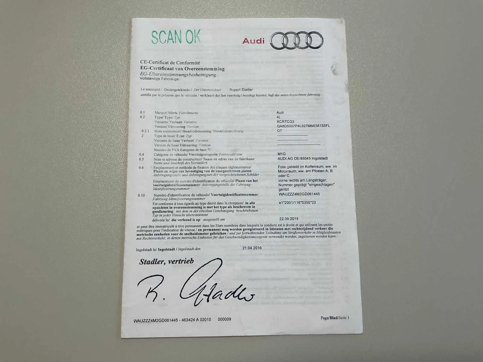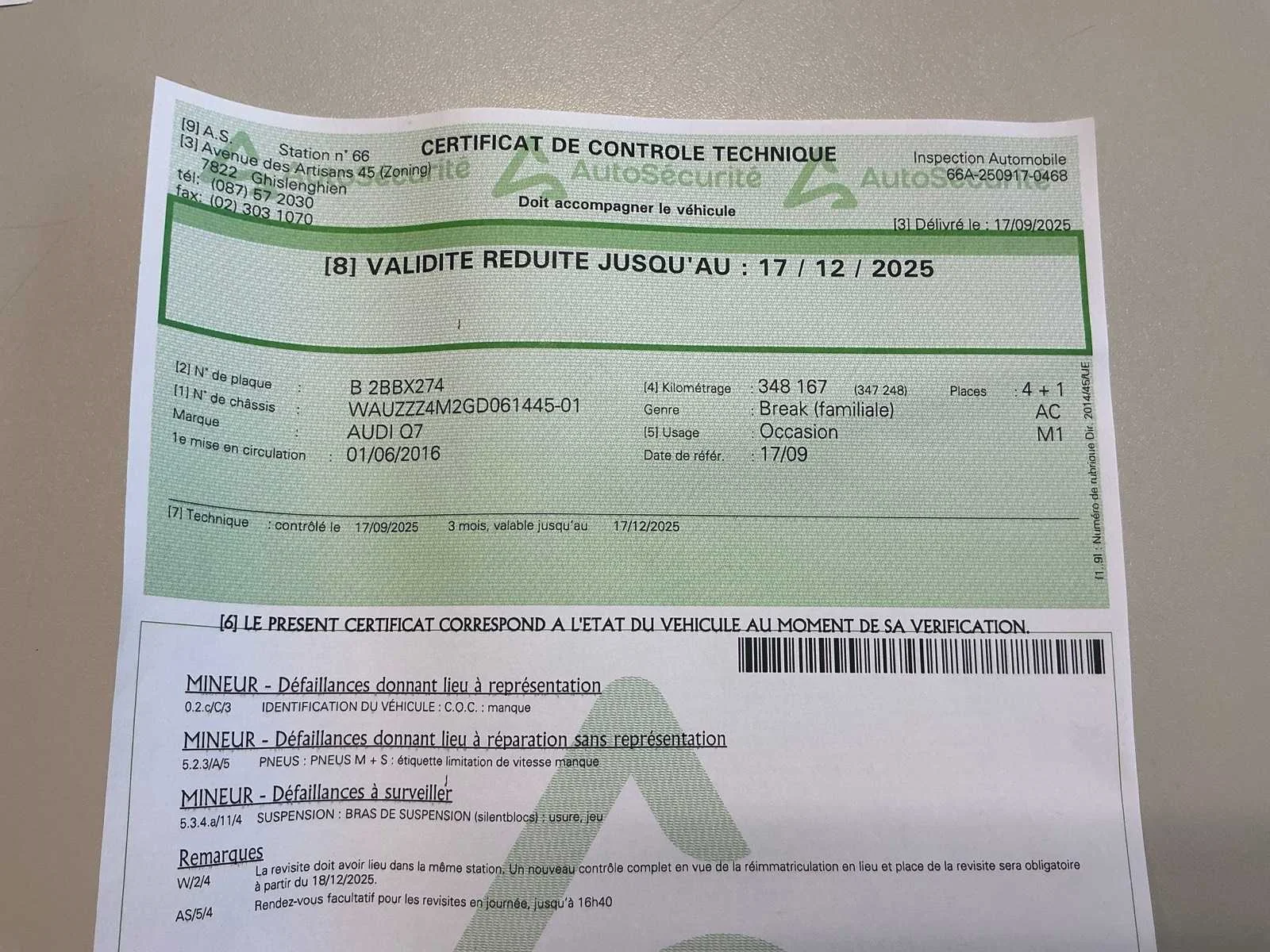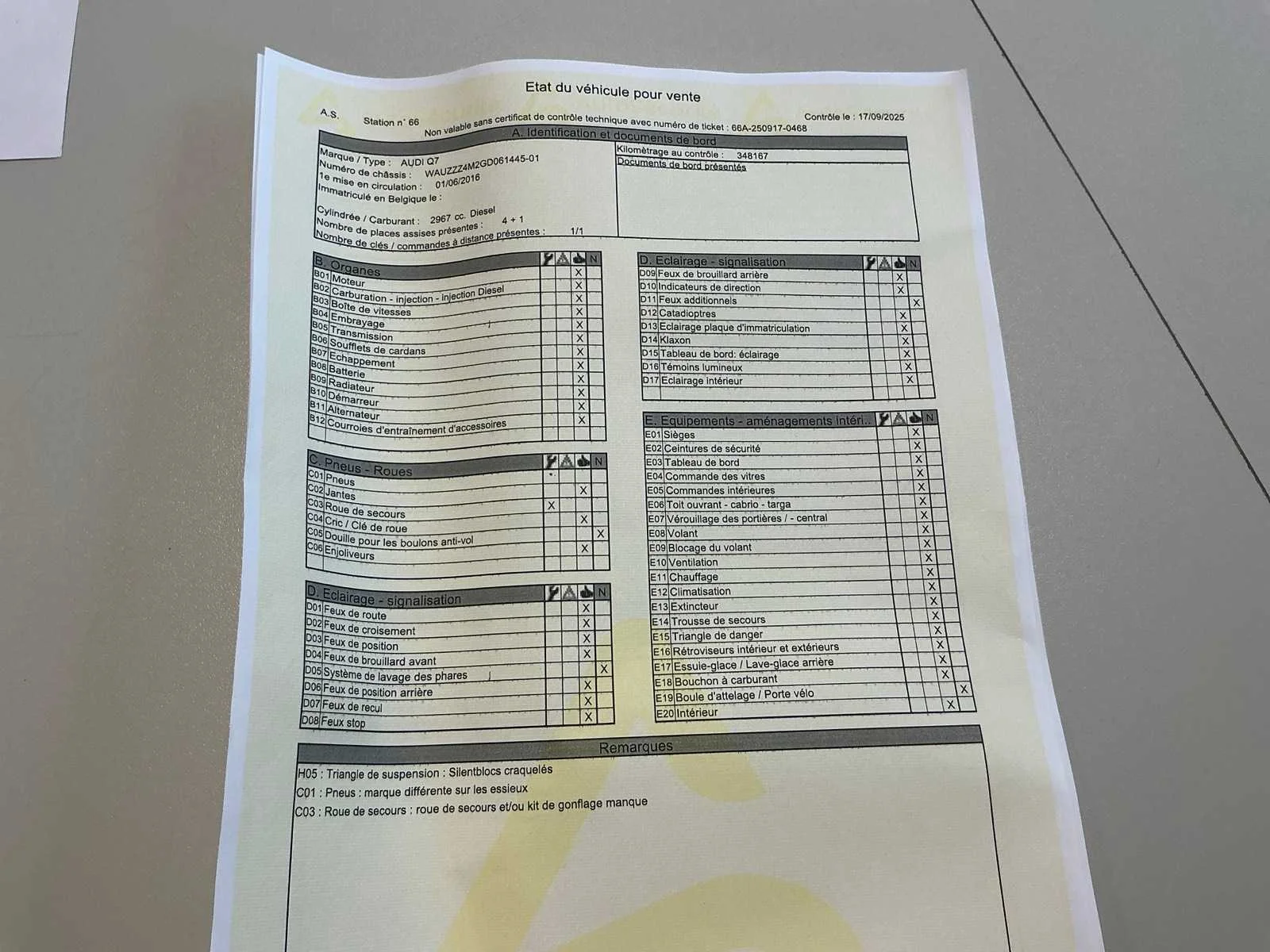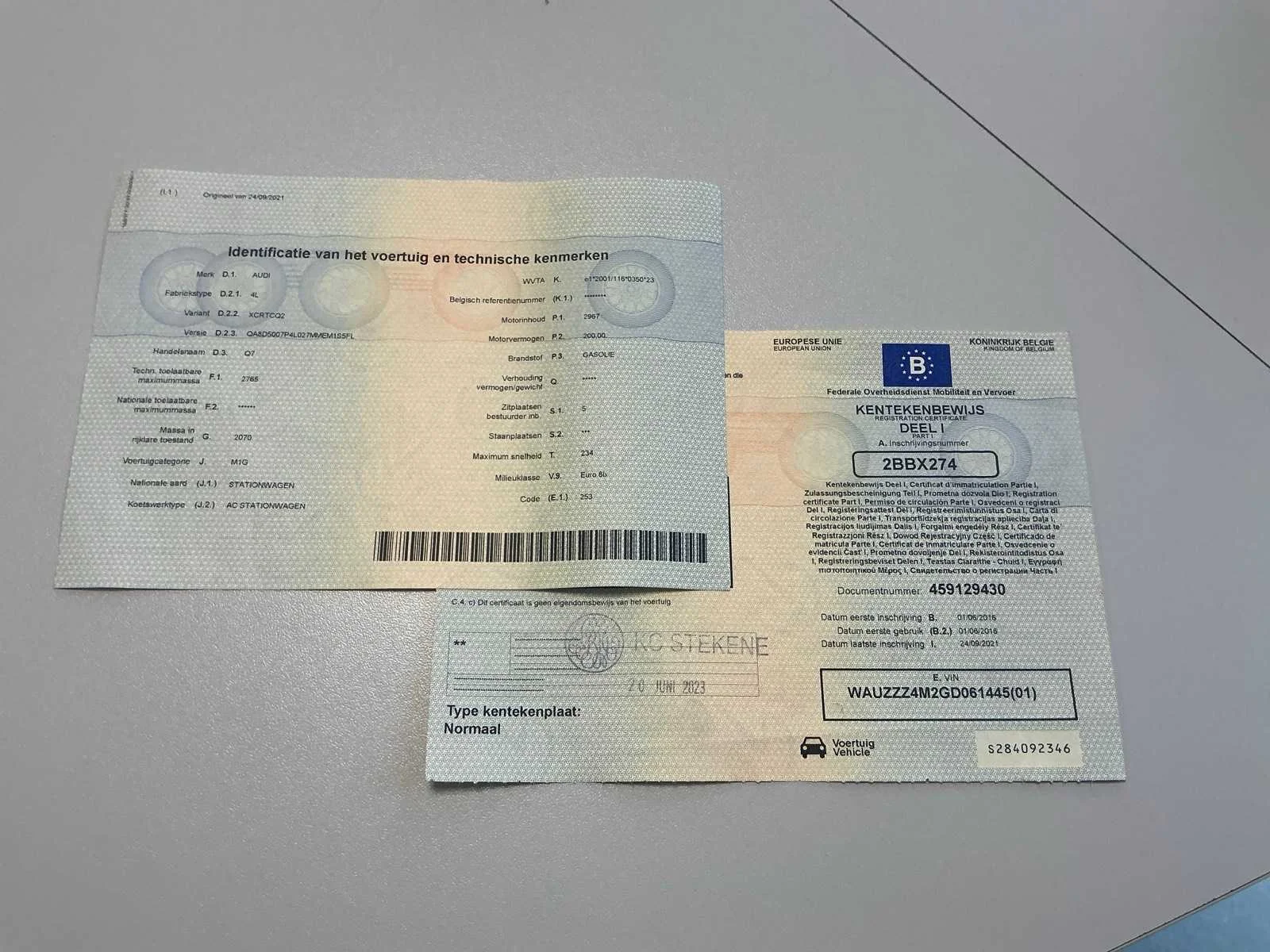 Nee Kenteken: 2BBX274 Merk: Audi Model: Q7 Bouwjaar: 2016 Afgelezen kilometerstand: 348503km Cilinderinhoud: 2967cc Vermogen (kW): 200kW Brandstof: diesel Chassisnummer: WAUZZZ4M2GD061445 Datum eerste toelating: 01/06/2016 Aantal zitplaatsen: 5 Transmissie: Automaat Emissieklasse: Euro 6b Aantal sleutels: 1 Nationaliteit documenten: BE Gelijkvormigheidsattest aanwezig: true Start en rijdt: Ja Keuringsrapport geldig tot: 17/12/2025 Vavato voert geen technische keuring uit.: true Airconditioning: true Inschrijvingsbewijs - deel 1 : Aanwezig Inschrijvingsbewijs - deel 2: Aanwezig